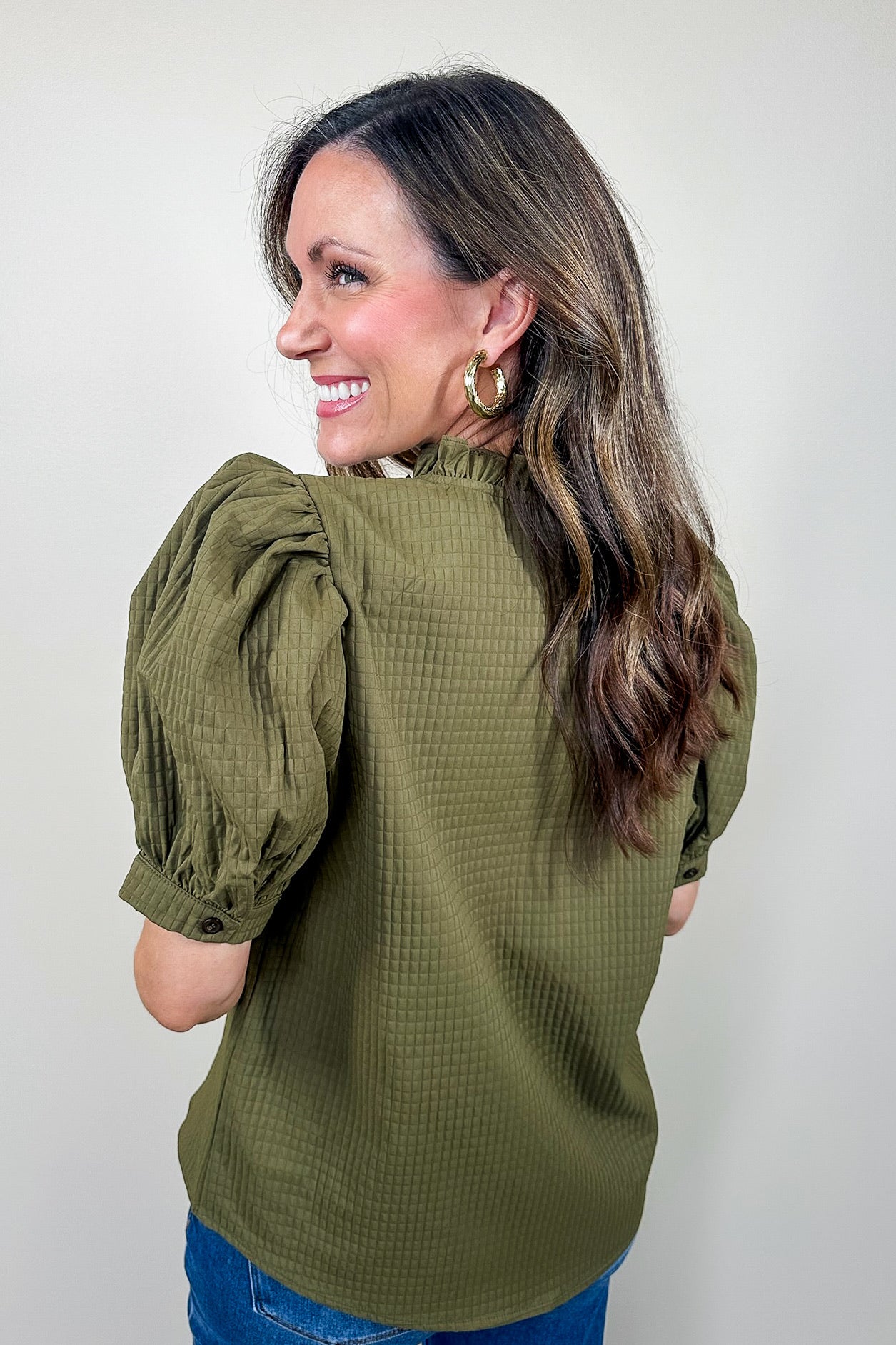 Olive Textured Ruffle V Neck Blouse
