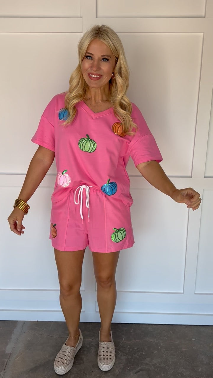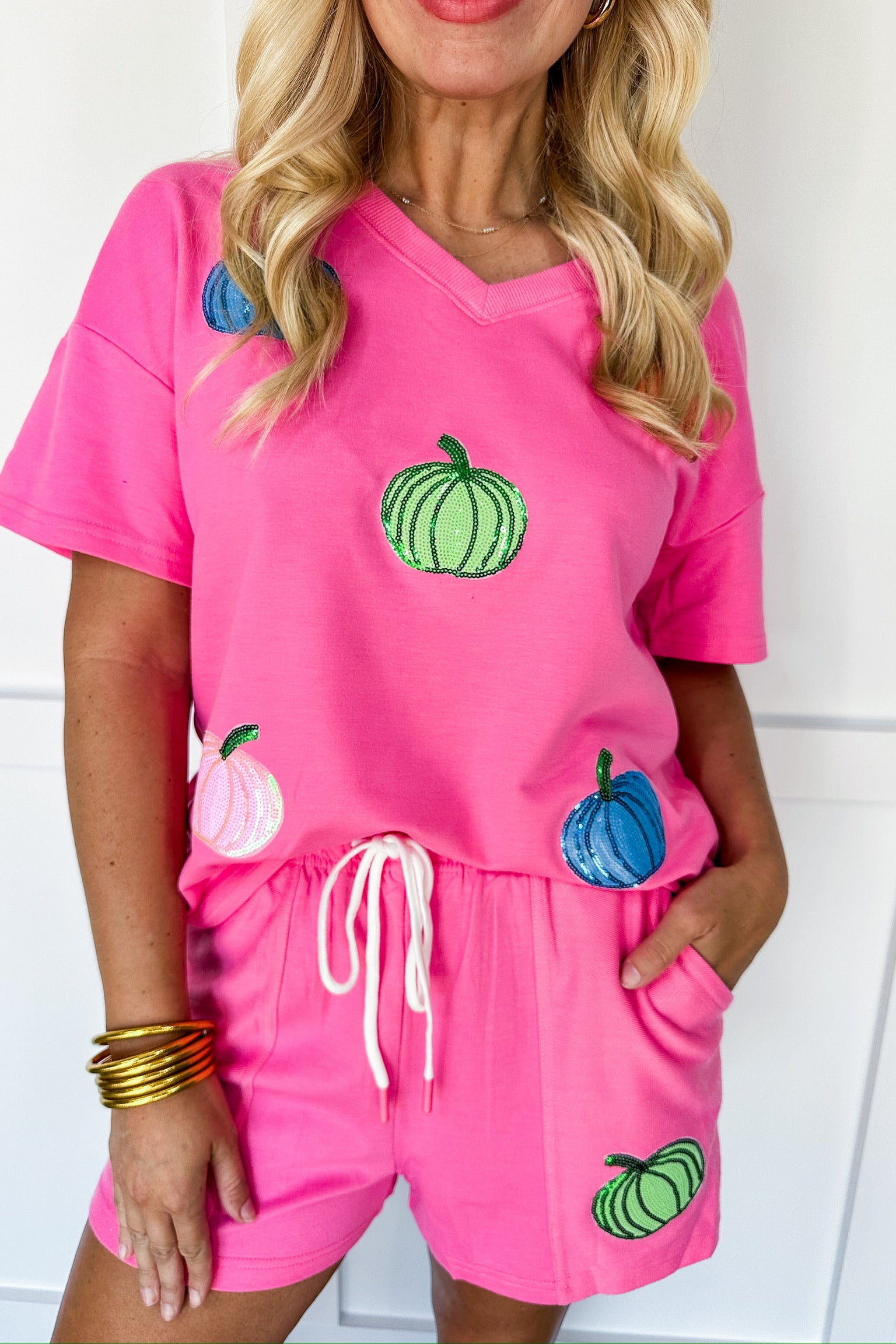 Get ready to shine in the Pumpkin Patch Pink Sequin Matching Set! This playful duo features a sparkling sequin top with a flattering V-neck and vibrant pumpkin motifs. The cozy shorts come with handy pockets and a crisp white drawstring for adjustable comfort. Perfect for adding fun and flair to your casual days or festive gatherings.