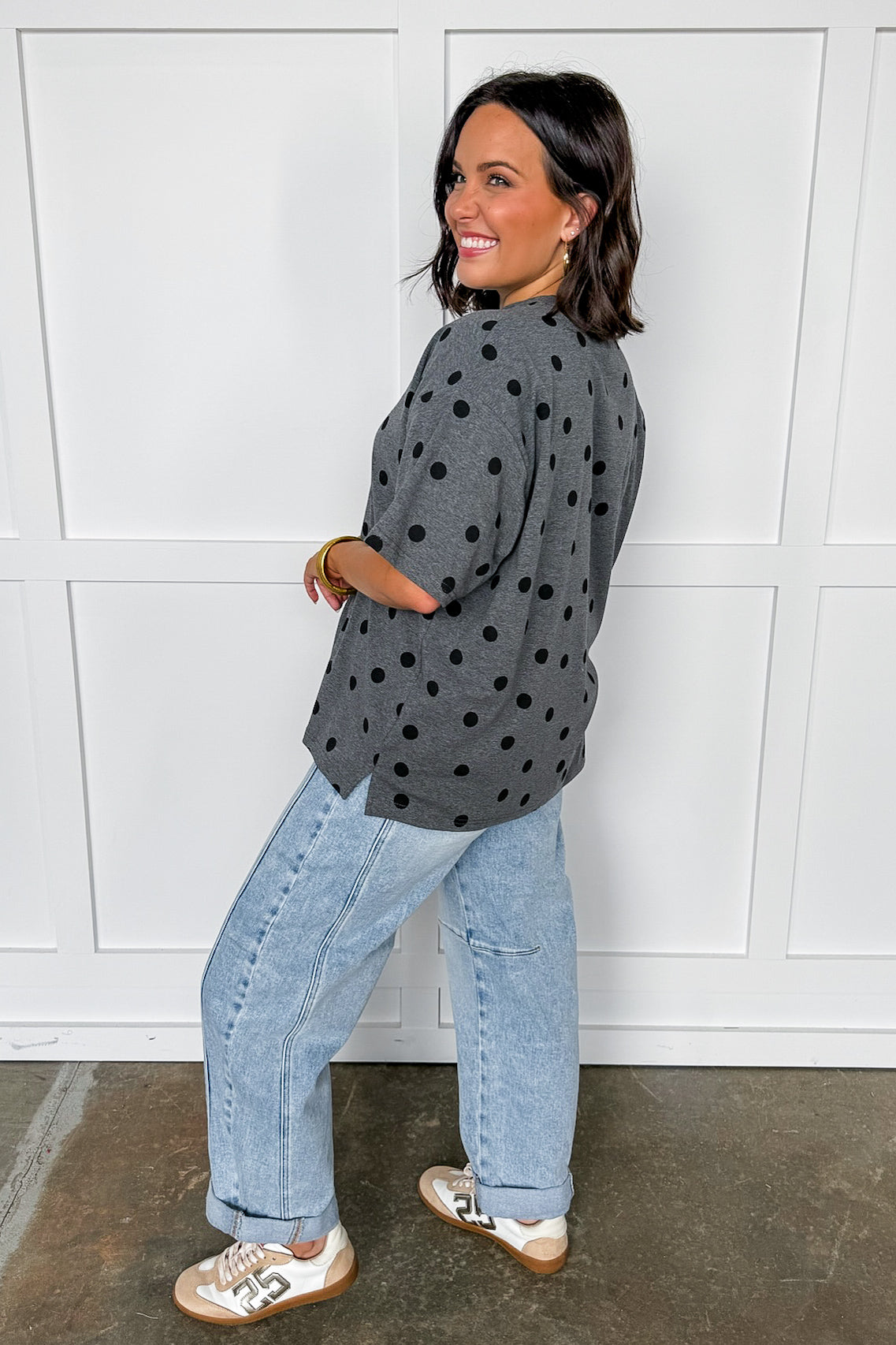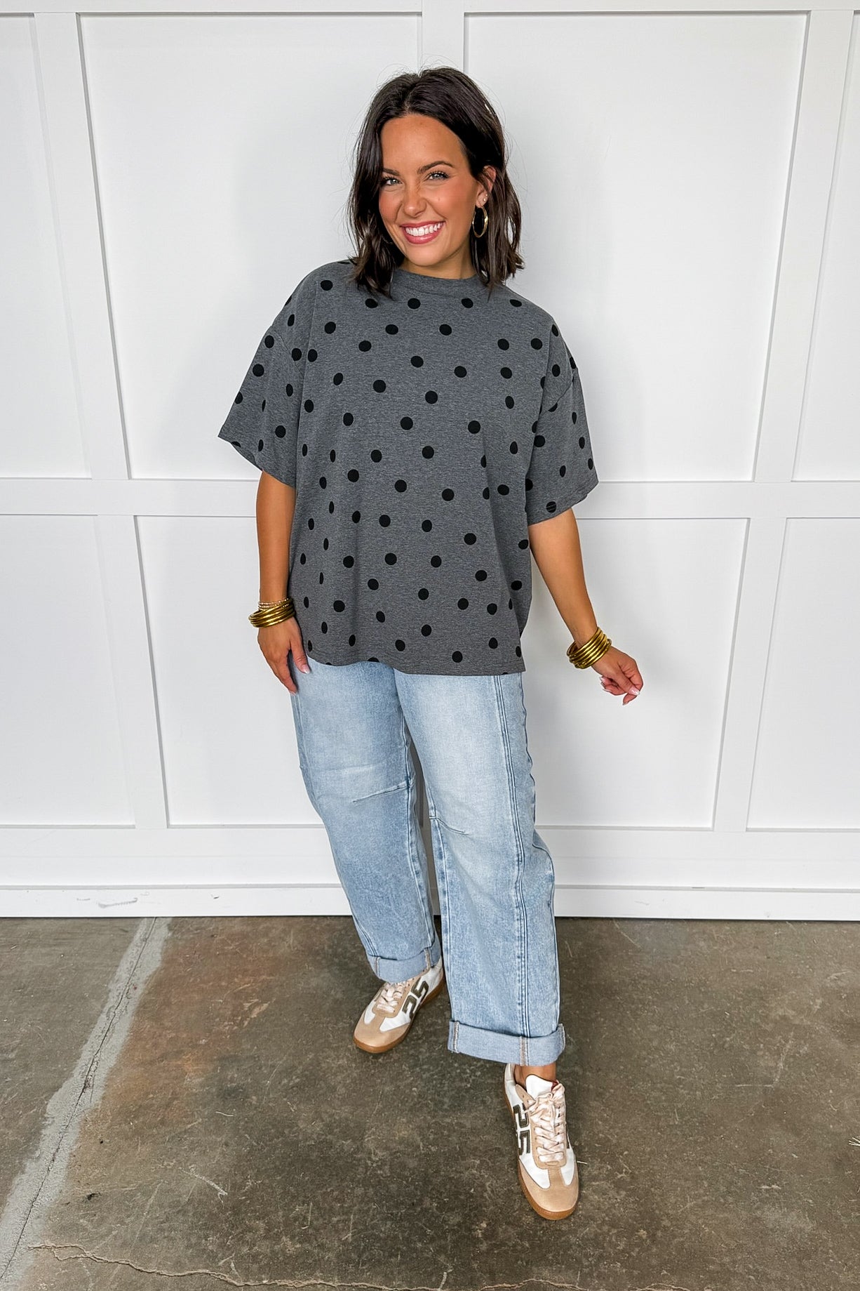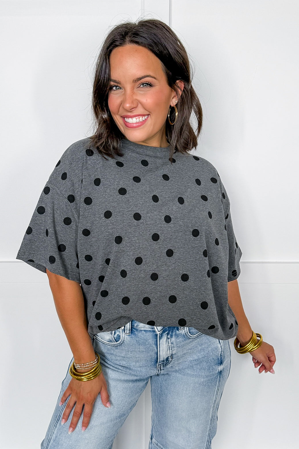 Say hello to your new favorite “throw on and go” top! This playful grey oversized tee features bold black polka dots scattered throughout for a fun, modern twist on a classic print. Designed with an effortless relaxed fit, dropped shoulders, and soft knit fabric — it’s the perfect blend of cozy and cute. Dress it up with denim or keep it breezy with leggings for an easy everyday look.