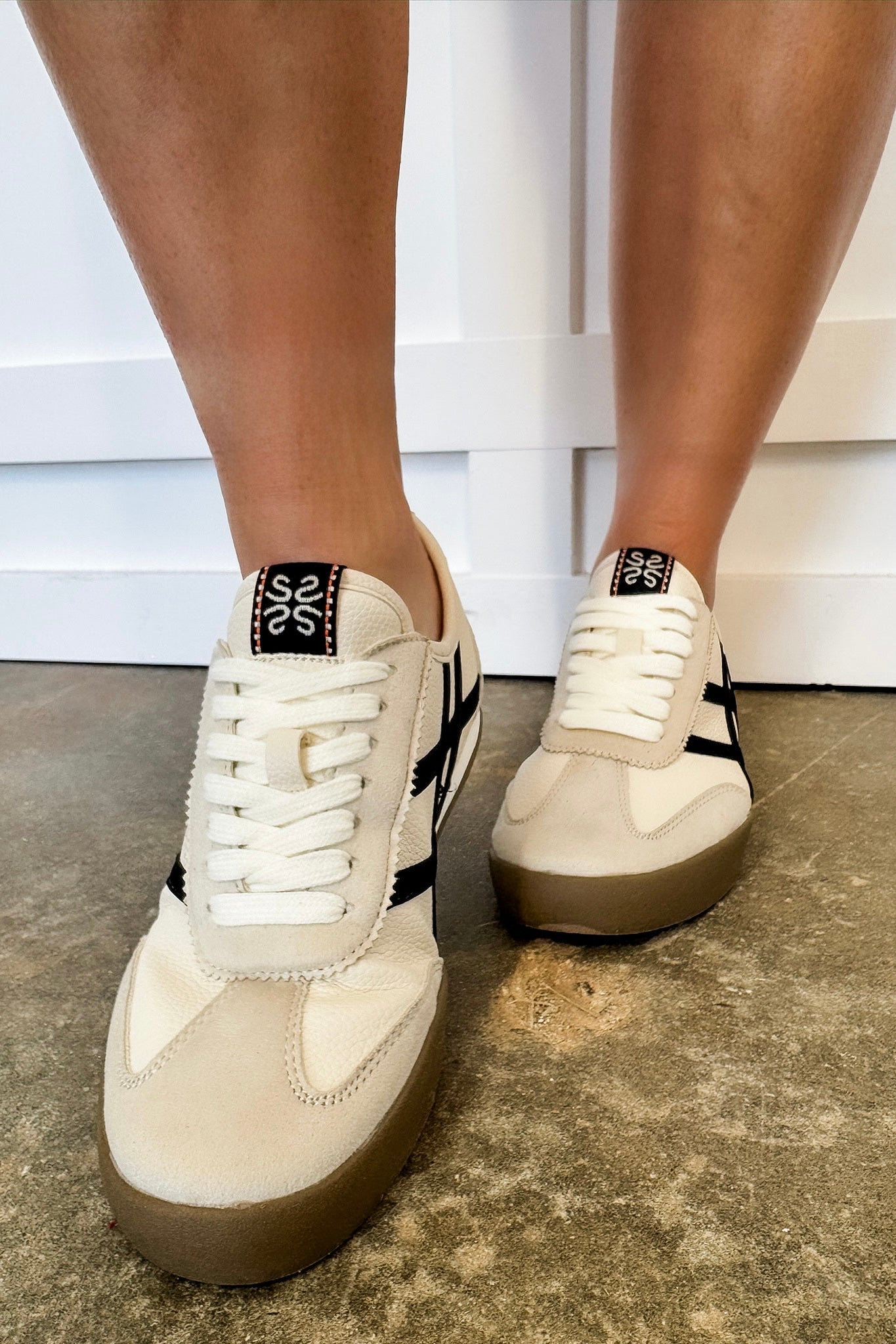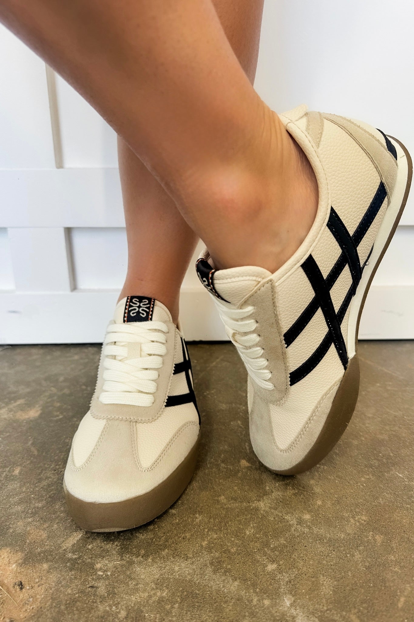 Your new everyday sneaker just clocked in. This retro-inspired cream and black pair blends sporty lines with modern street-style energy. The textured faux-leather body, suede detailing, and sleek contrast striping give it that designer-adjacent look without the designer price tag.