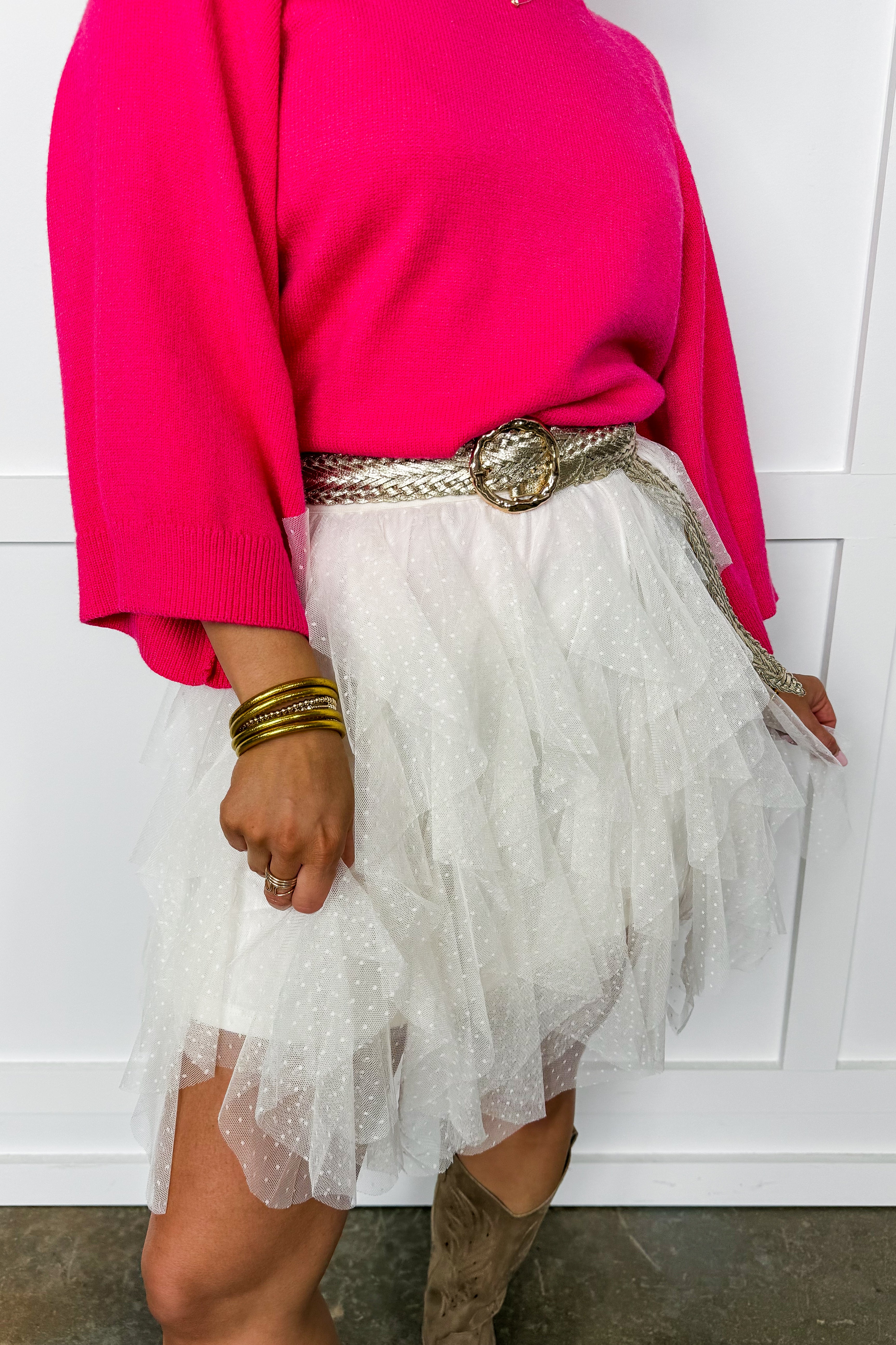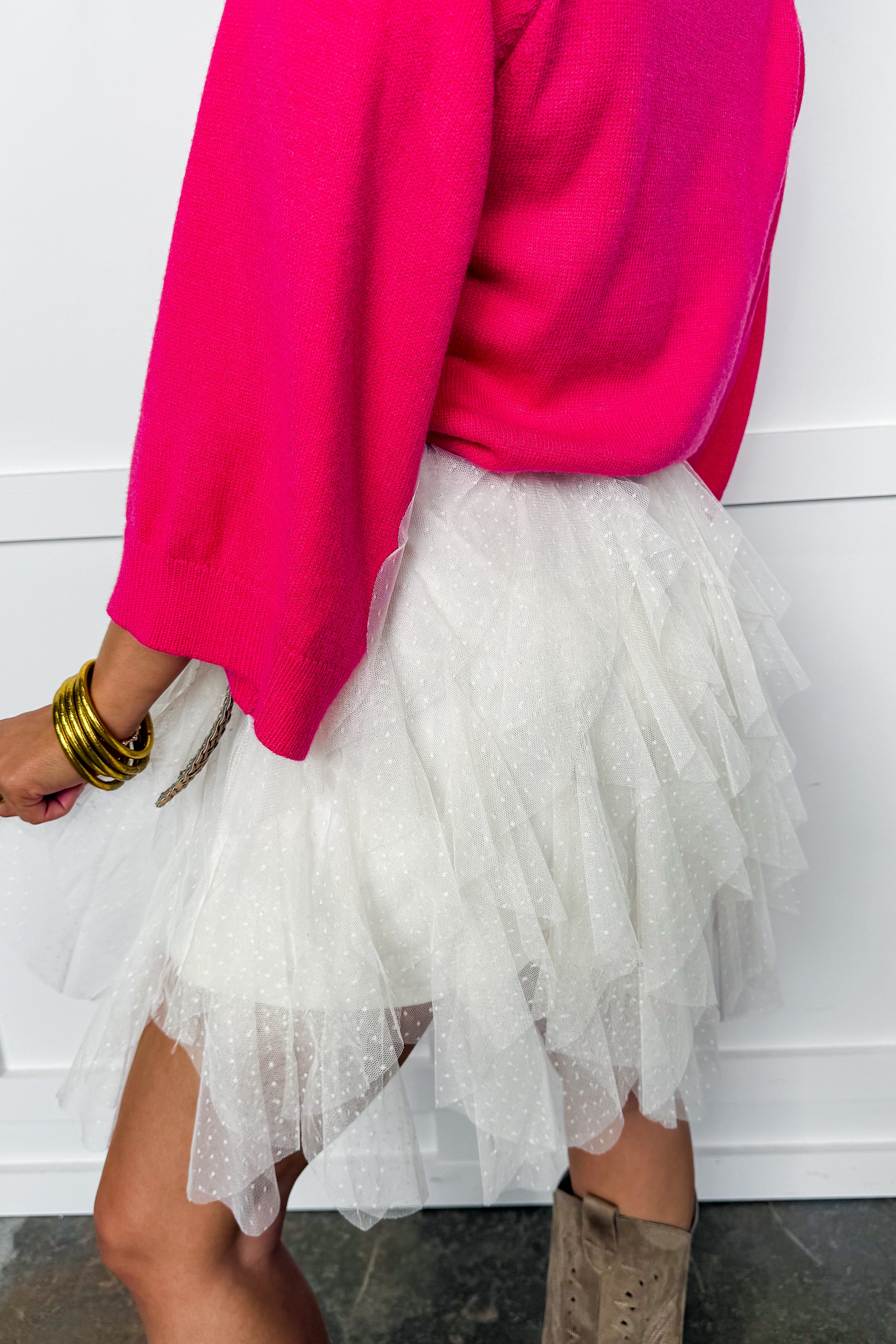 Soft, feminine, and effortlessly elegant, The Romantic Tulle Skirt is a dreamy staple designed to bring romance to any look. Featuring a delicate dot pattern throughout airy tulle layers, this skirt is finished with a ruffled silhouette that creates beautiful movement and texture. Fully lined for comfortable wear and designed with an elastic waistband, it’s an easy pull-on piece that feels just as good as it looks.