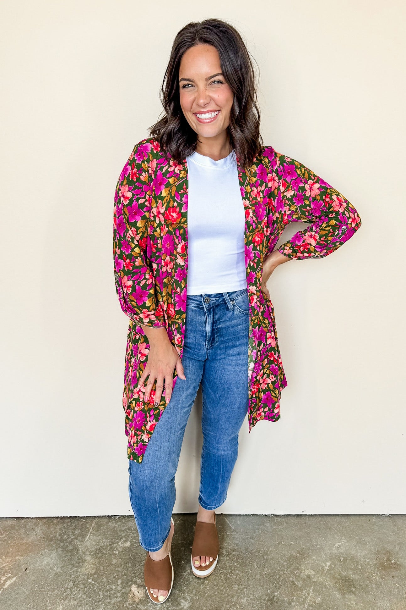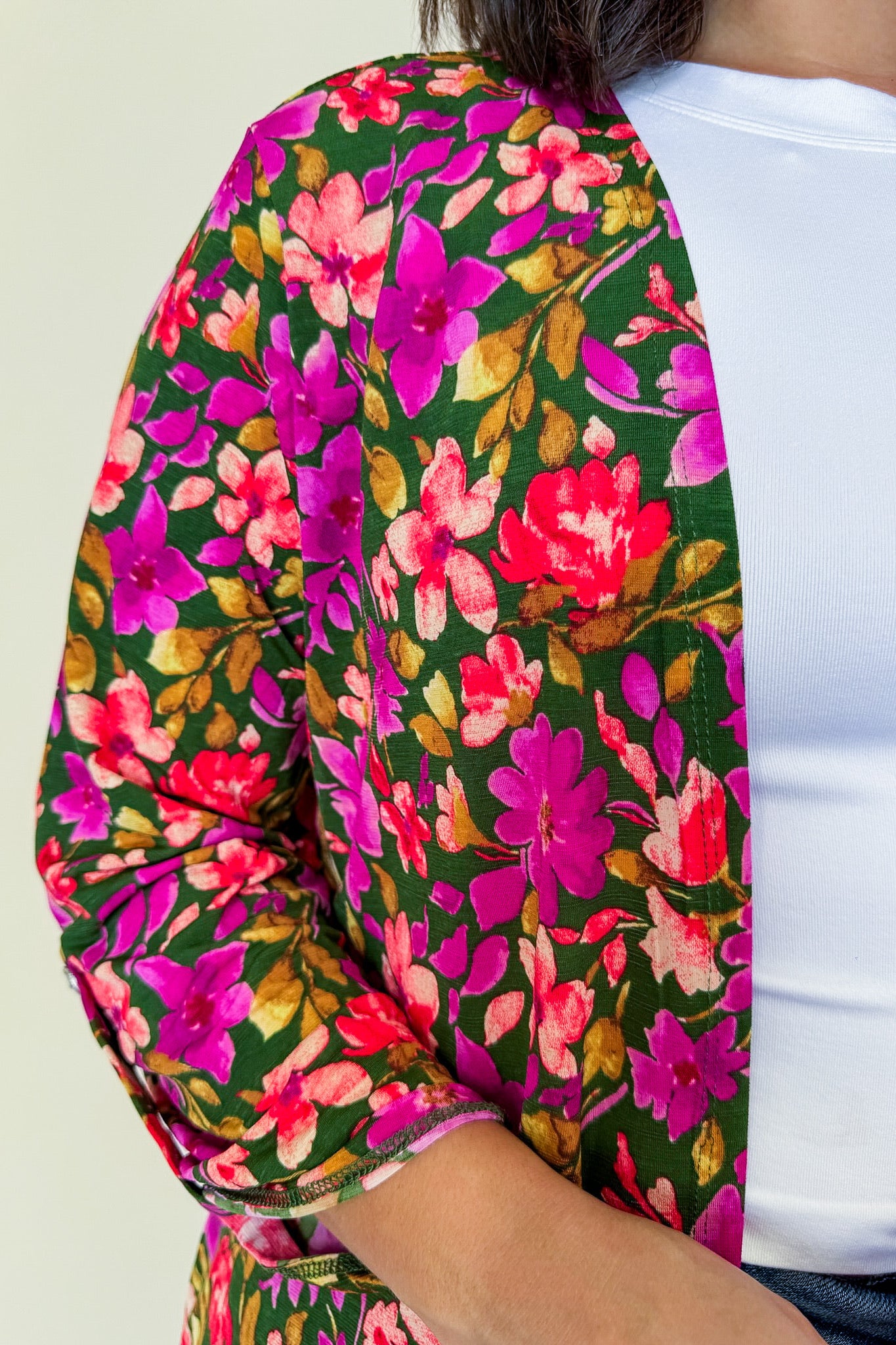 Add a splash of fun to your wardrobe with the Dear Scarlett Liz Cardigan in Olive. This open, flowy piece is printed in delightful patterns and comes in a variety of colors to match your mood. Its breathable, wrinkle-free fabric keeps you comfy and fresh all day long—perfect for layering with a playful twist.