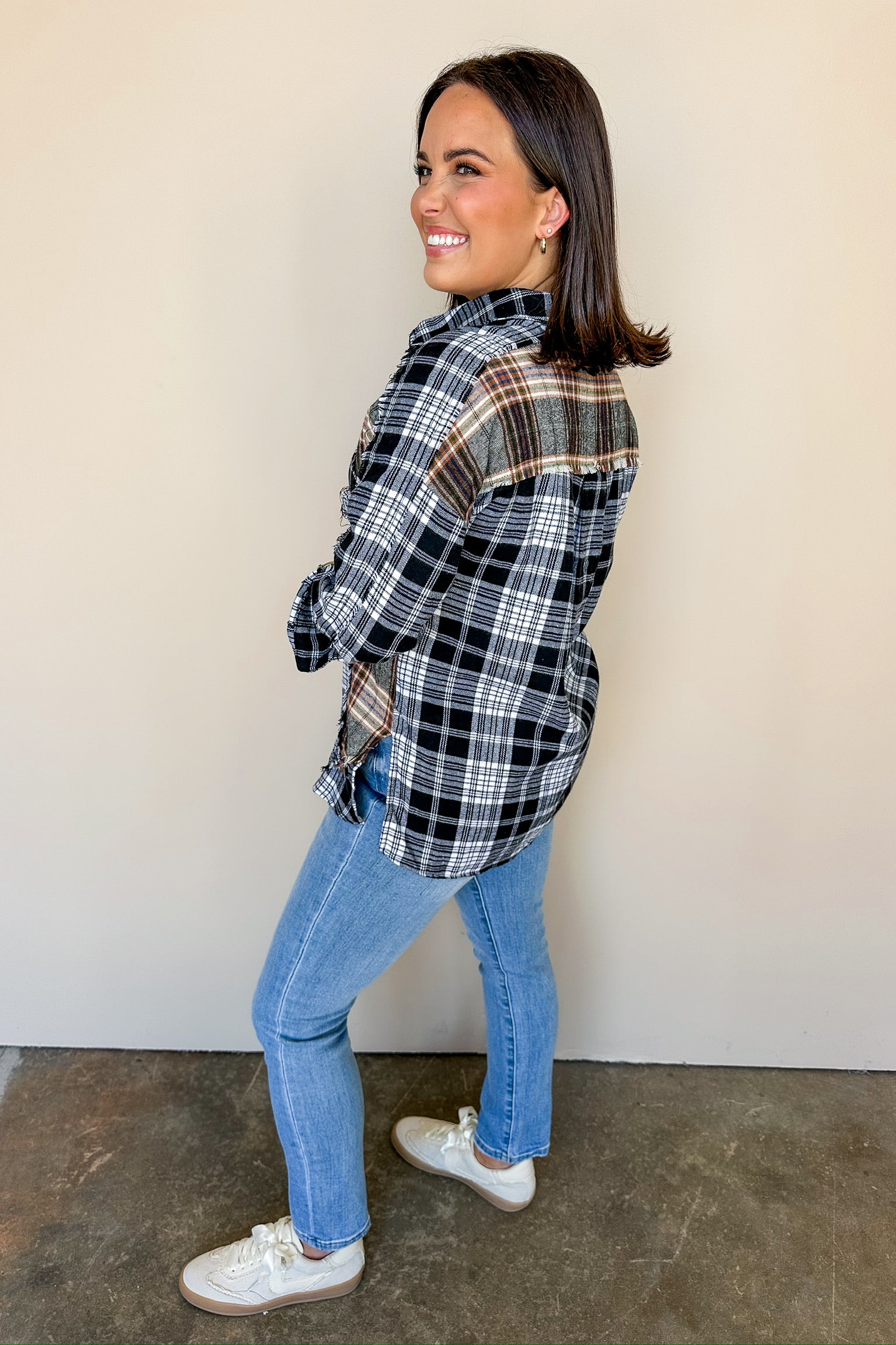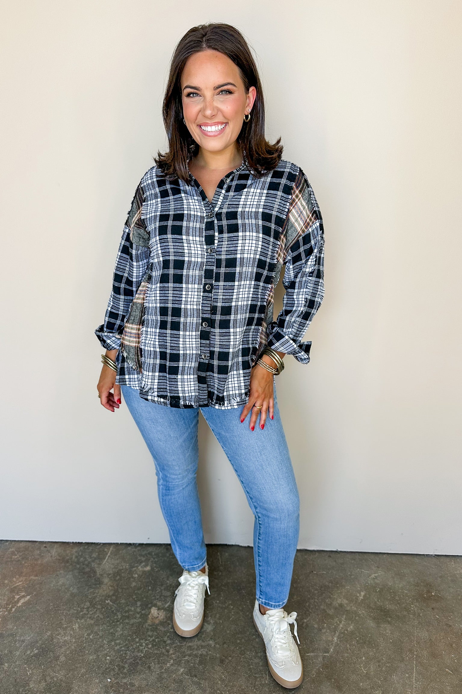 Upgrade your fall wardrobe with our Mixed Plaid Button Down Black Flannel! Perfect for both casual and chic looks, this versatile piece features a unique mix of plaids and eye-catching fray detailing. Style it with leggings or denim for a trendy and effortless look!