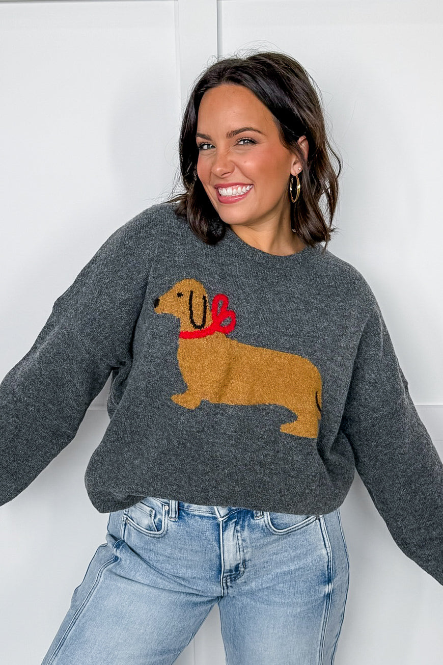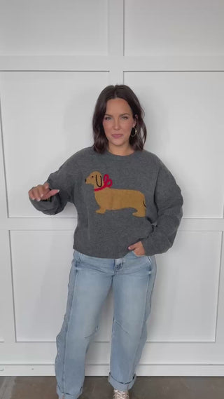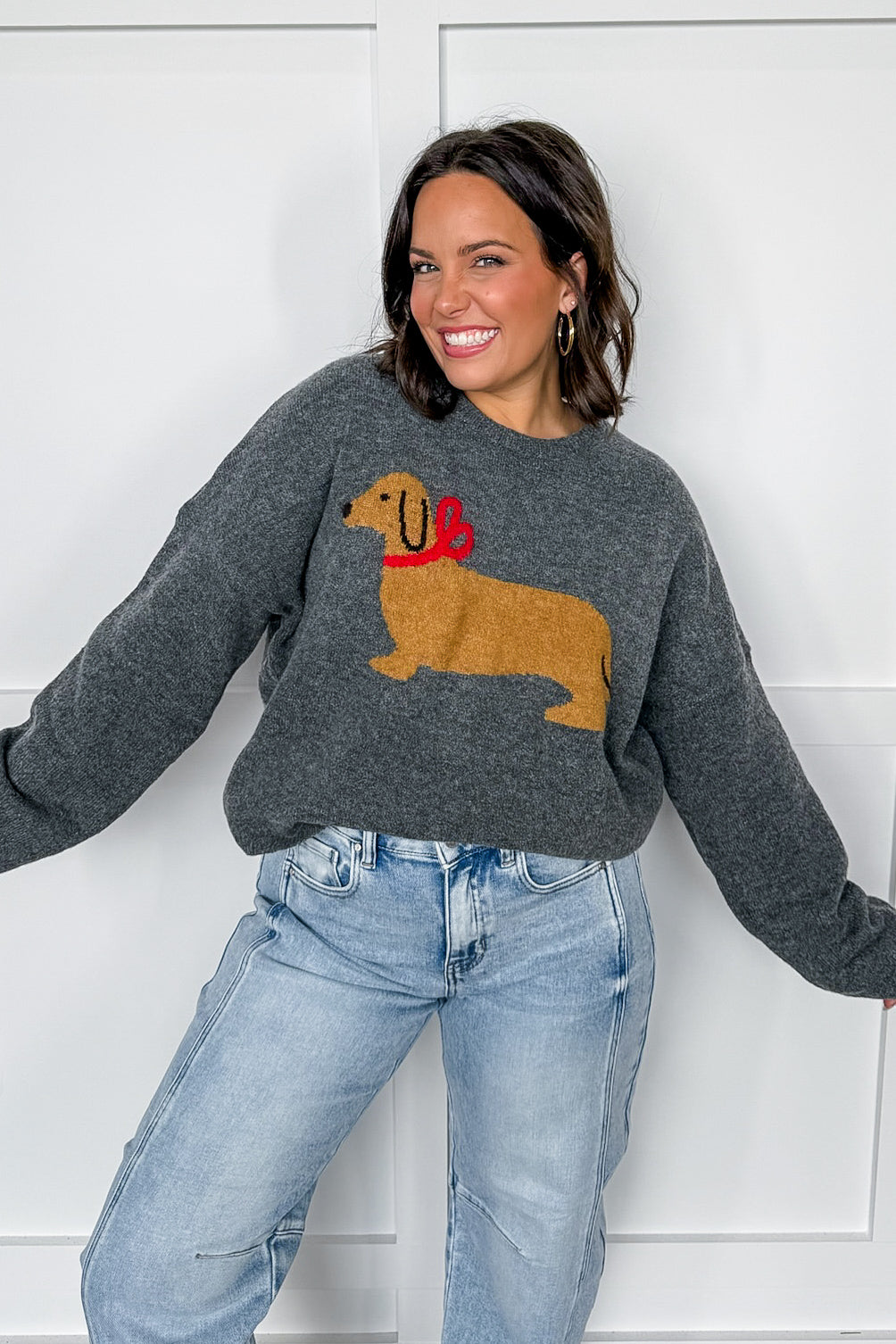 Meet the sweater that’s stealing everyone’s heart this. This ultra-soft charcoal knit features the cutest embroidered dachshund with a red bow — equal parts playful and cozy. It’s oversized, warm, and perfect for dog lovers or anyone who wants to make winter a little more fun. Style it with leggings, denim, or a skirt for an effortless statement look!