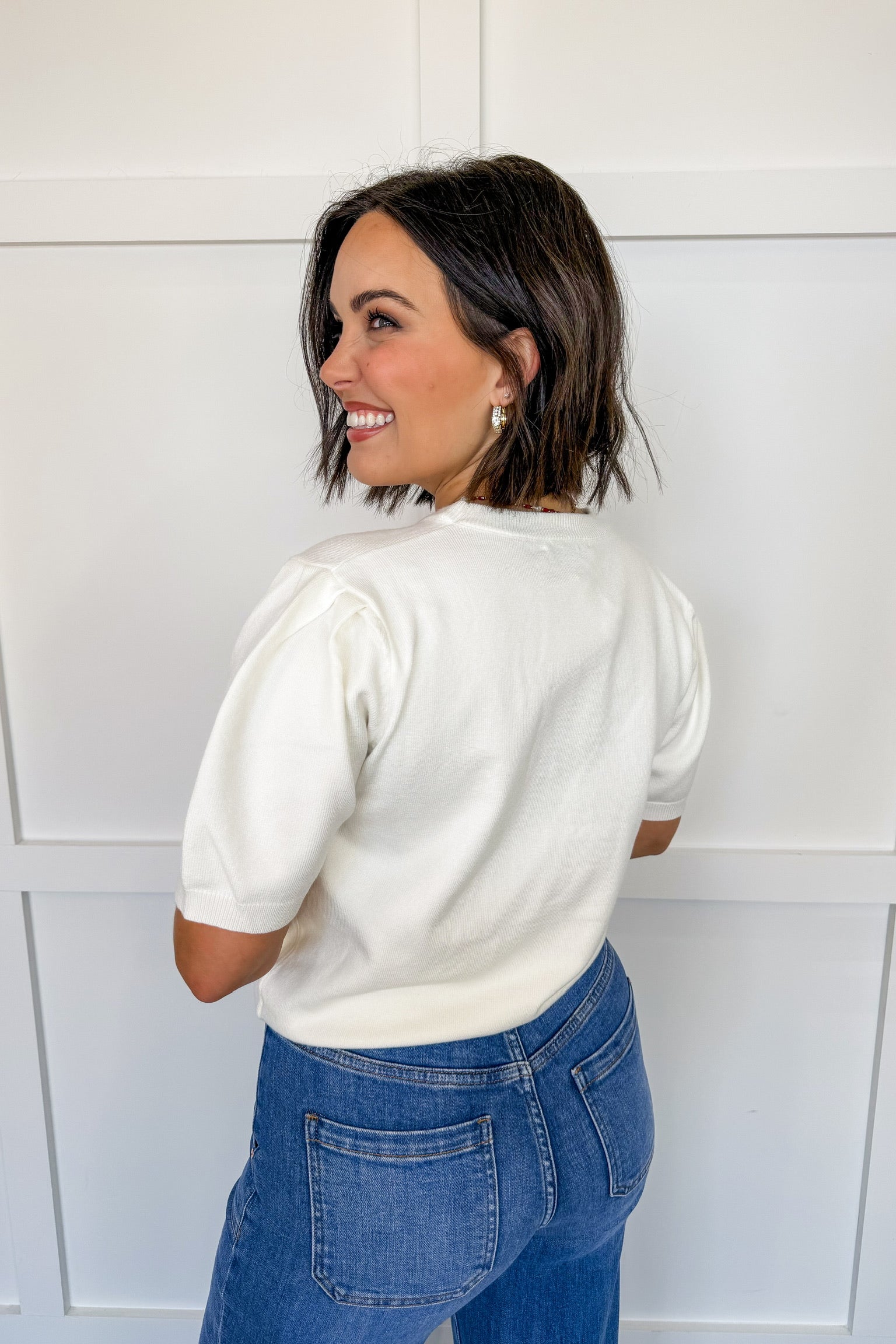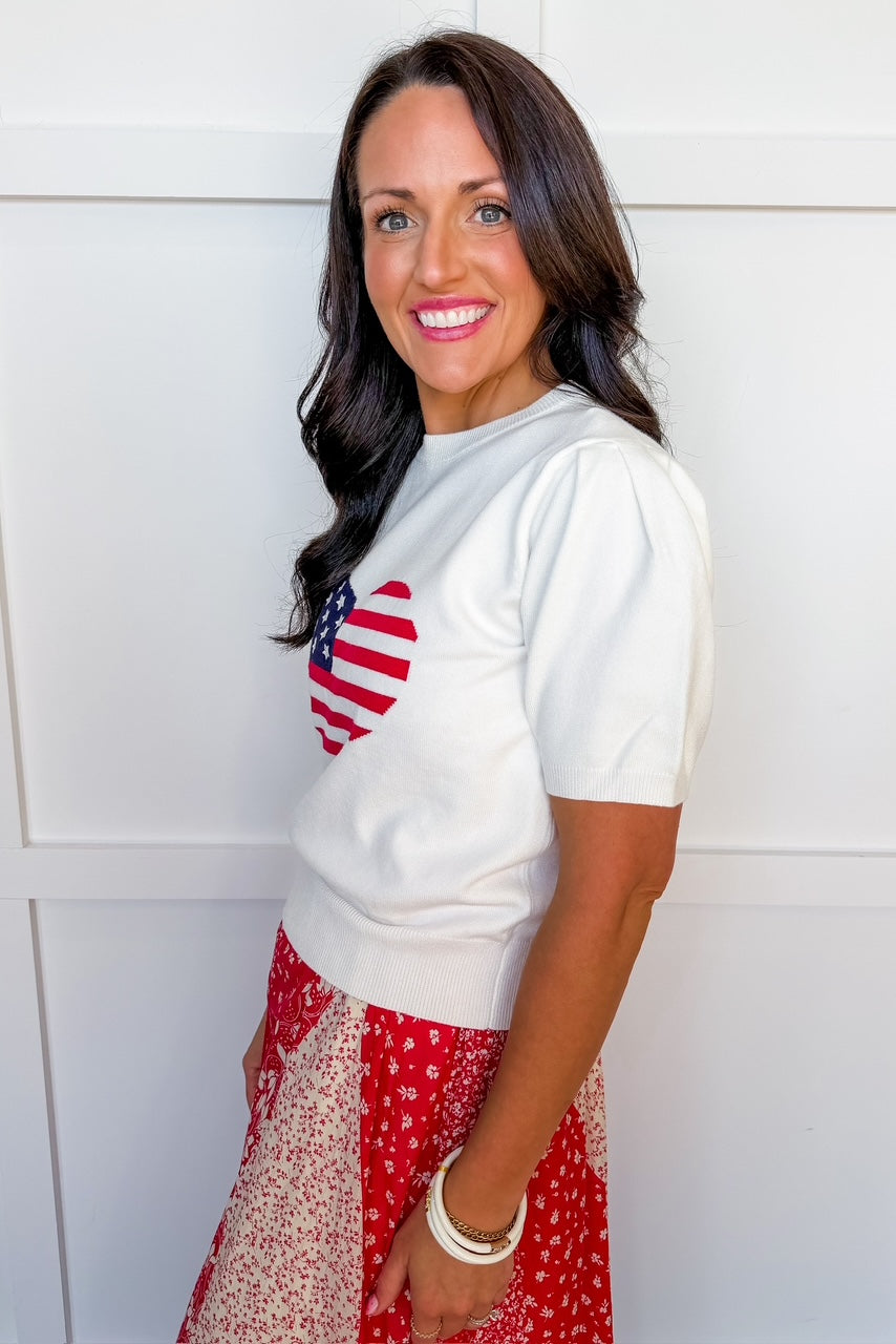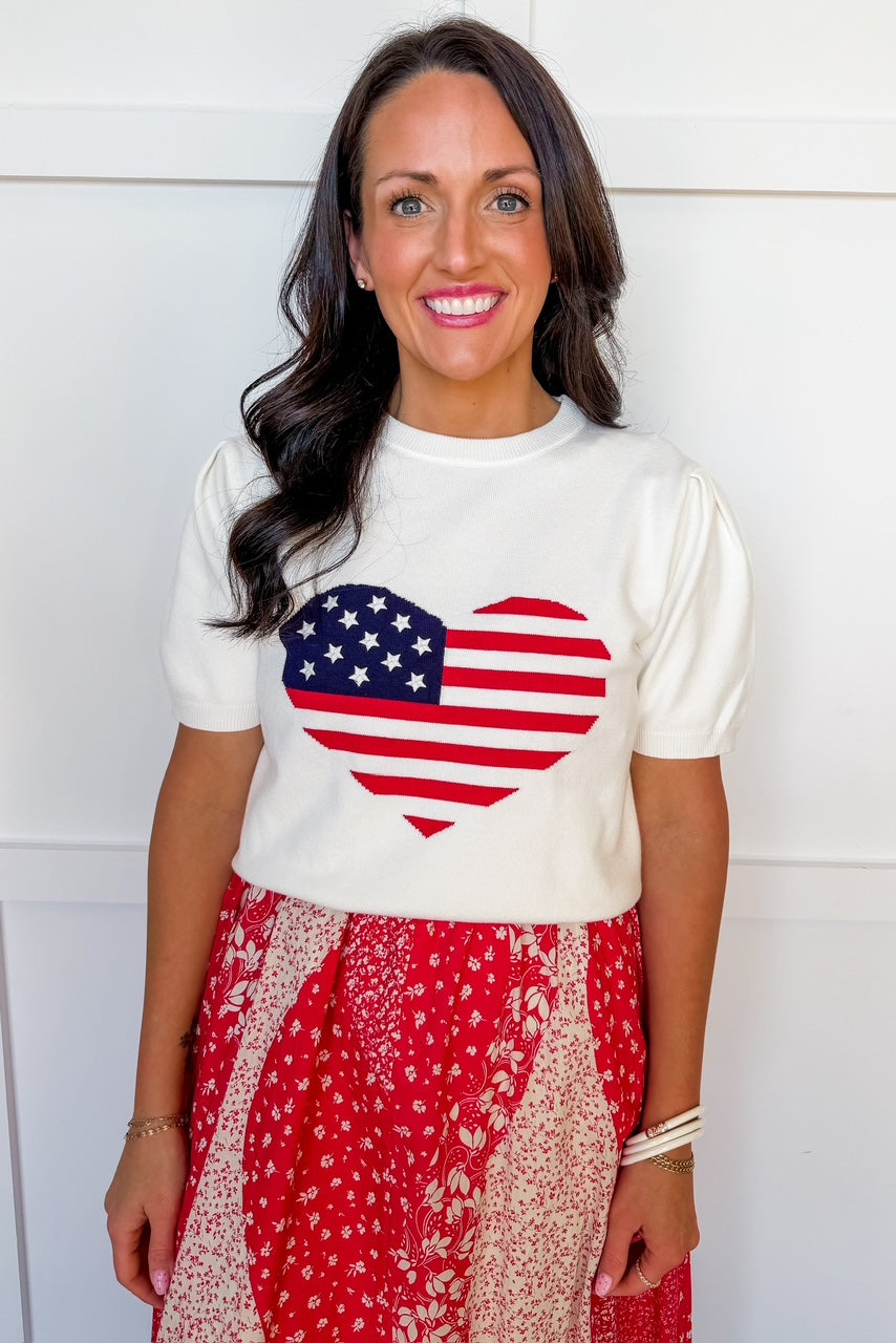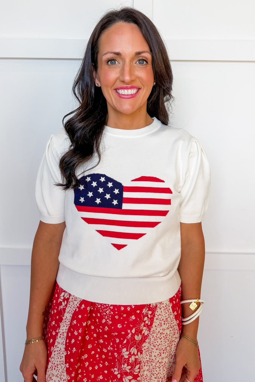 Show your love for the red, white, and blue in the I Love the USA Heart Sweater. Featuring a bold American flag heart on a soft knit base, this sweater is the perfect mix of cozy and patriotic. The slightly cropped fit and short sleeves make it easy to style for warmer days, while still giving you that classic sweater feel. Whether you're heading to a summer event, holiday celebration, or just repping USA in style, this piece is a must-have.