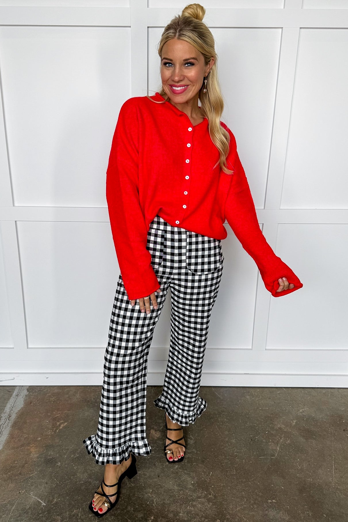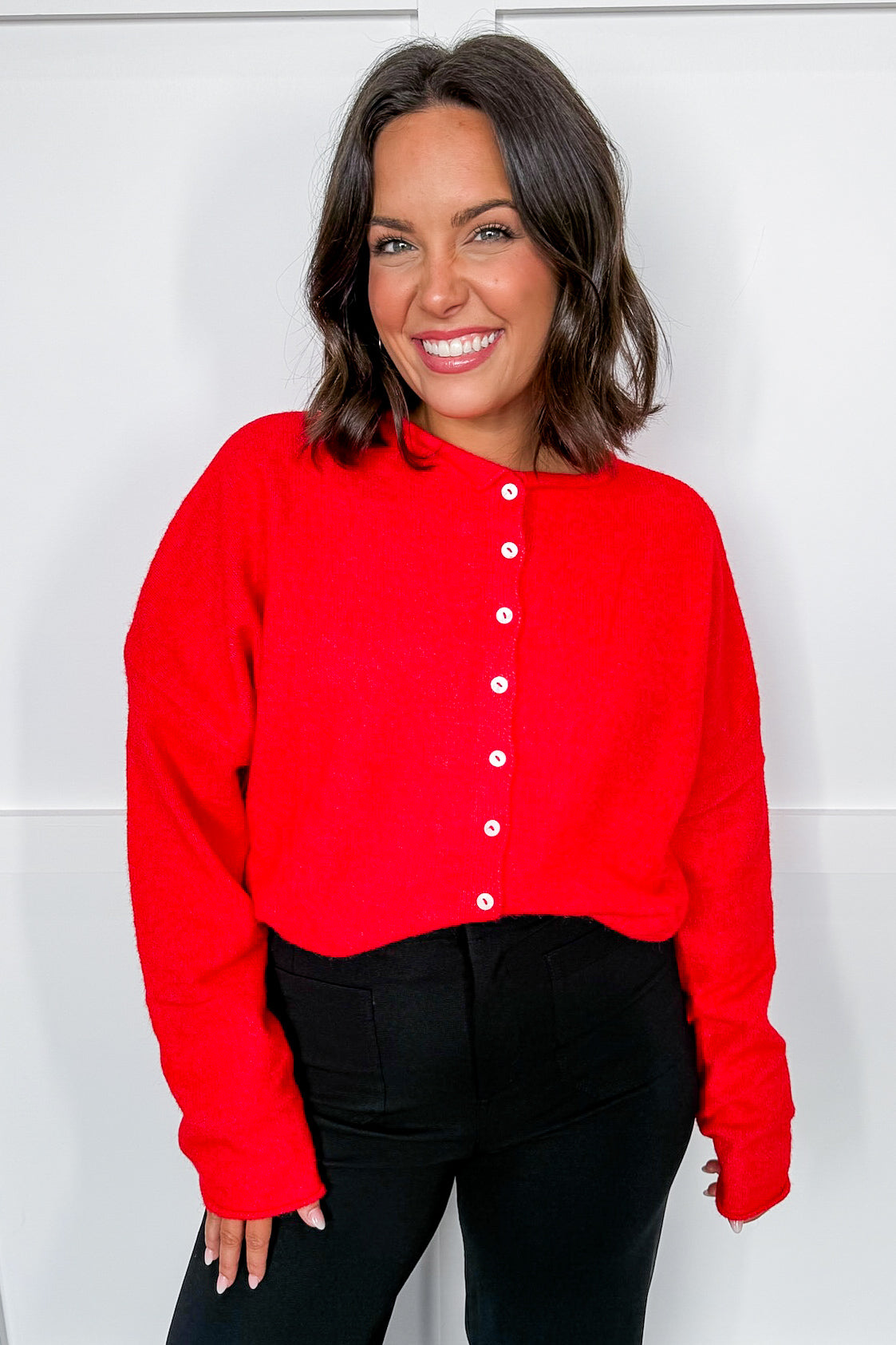 This ultra-soft red button-front sweater brings the perfect blend of cozy comfort and elevated charm. The relaxed silhouette drapes effortlessly while the delicate buttons add a sweet, feminine touch. Whether you're dressing it up for dinners or keeping it casual with denim, this cheerful staple brightens any outfit with ease.