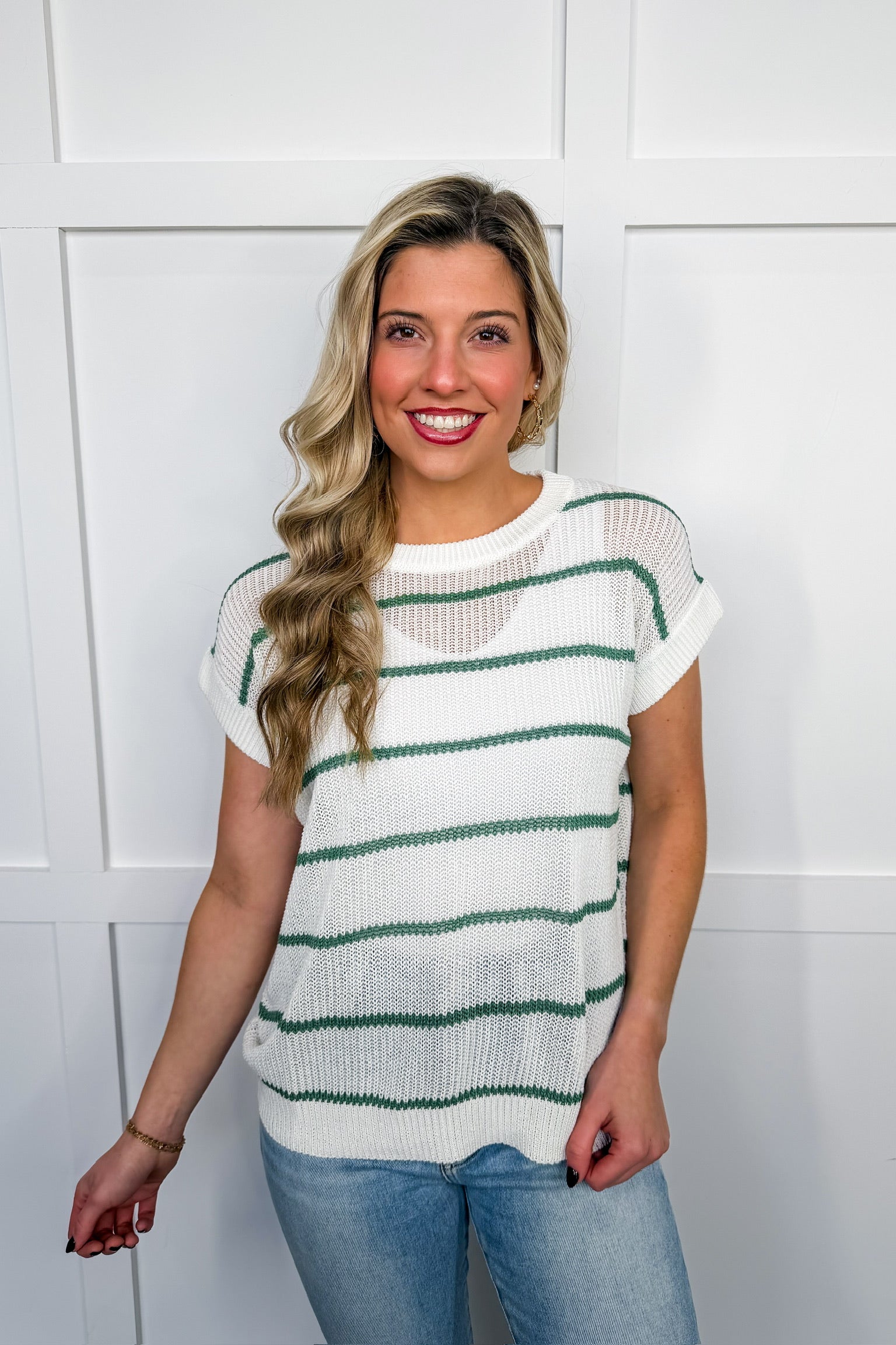 The Masters Moment Green Stripe Top is the perfect blend of cozy comfort and classic style. Featuring soft green stripes on a lightweight knit base, this top delivers an easy, relaxed fit that feels effortlessly put together. Whether you’re celebrating Masters season, heading to brunch, or styling it casually with denim, this piece brings timeless charm with a sporty-preppy twist.