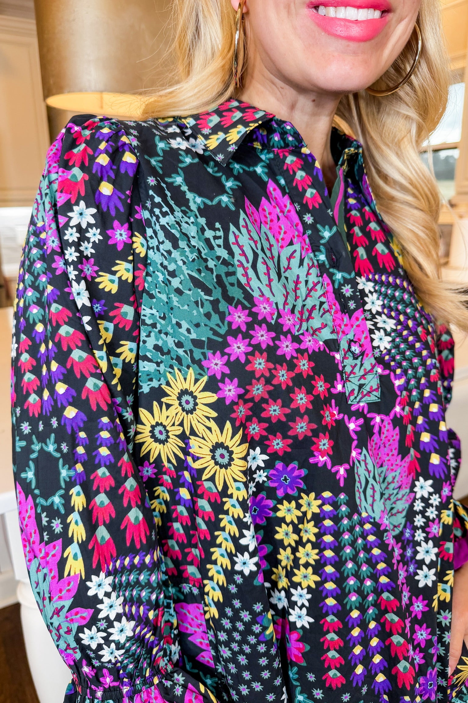 Turn heads in the perfect blend of effortless and elevated. Featuring a rich, colorful floral print against a deep background, this dress brings bold personality while staying easy to wear. The relaxed shirt-dress silhouette flatters every figure, while the playful ruffle cuffs add just the right touch of charm. Dress it up with heels or keep it casual with boots or sneakers — this one does it all.