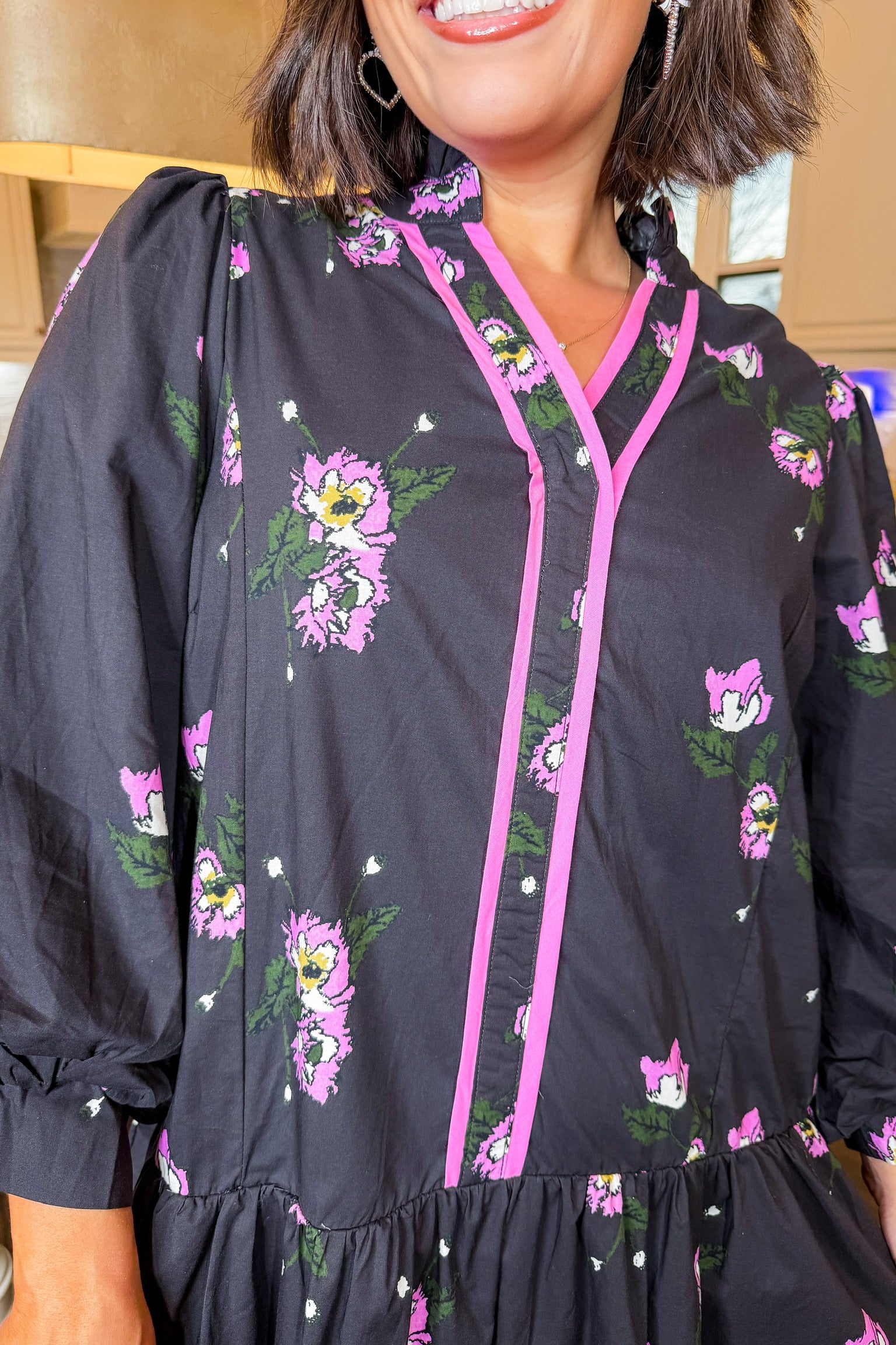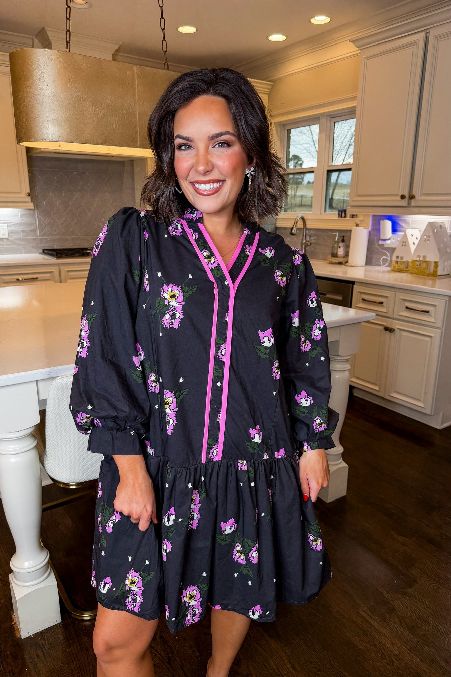Effortlessly feminine with a touch of modern polish. Dress is the piece you’ll reach for when you want to feel put-together with zero effort. Featuring a flattering V-neckline with contrast trim, soft long sleeves, and a relaxed fit through the body, this dress flows into a flouncy skirt that moves beautifully with every step. The deep navy base paired with delicate floral details makes it perfect for year-round wear.