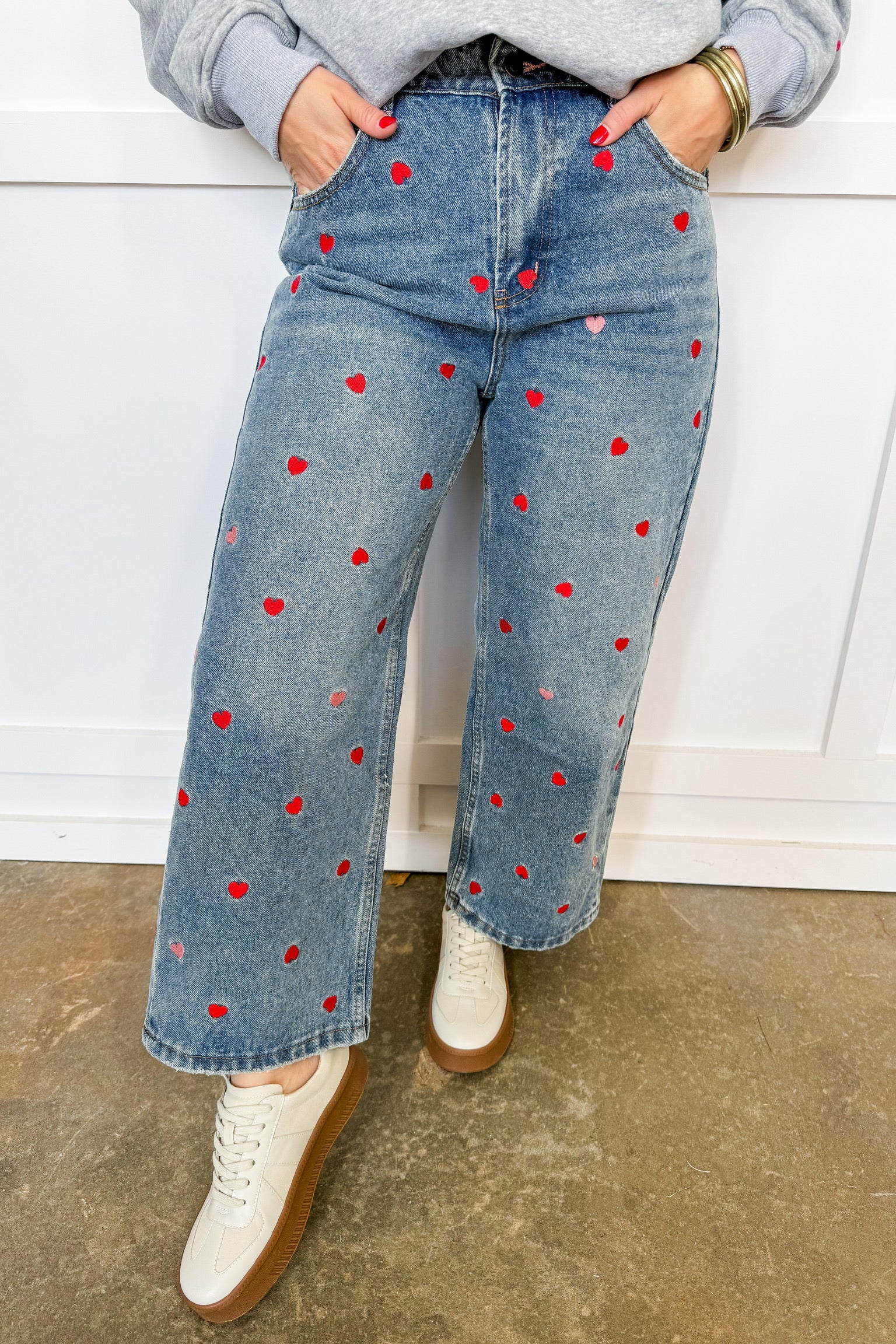 Meet your new statement denim! These wide-leg jeans feature adorable embroidered hearts throughout for the perfect mix of playful + trendy. With a relaxed leg, classic denim wash, and flattering high-rise fit, these jeans instantly elevate your everyday style. Pair with a simple tee or an oversized sweater for the cutest casual look!