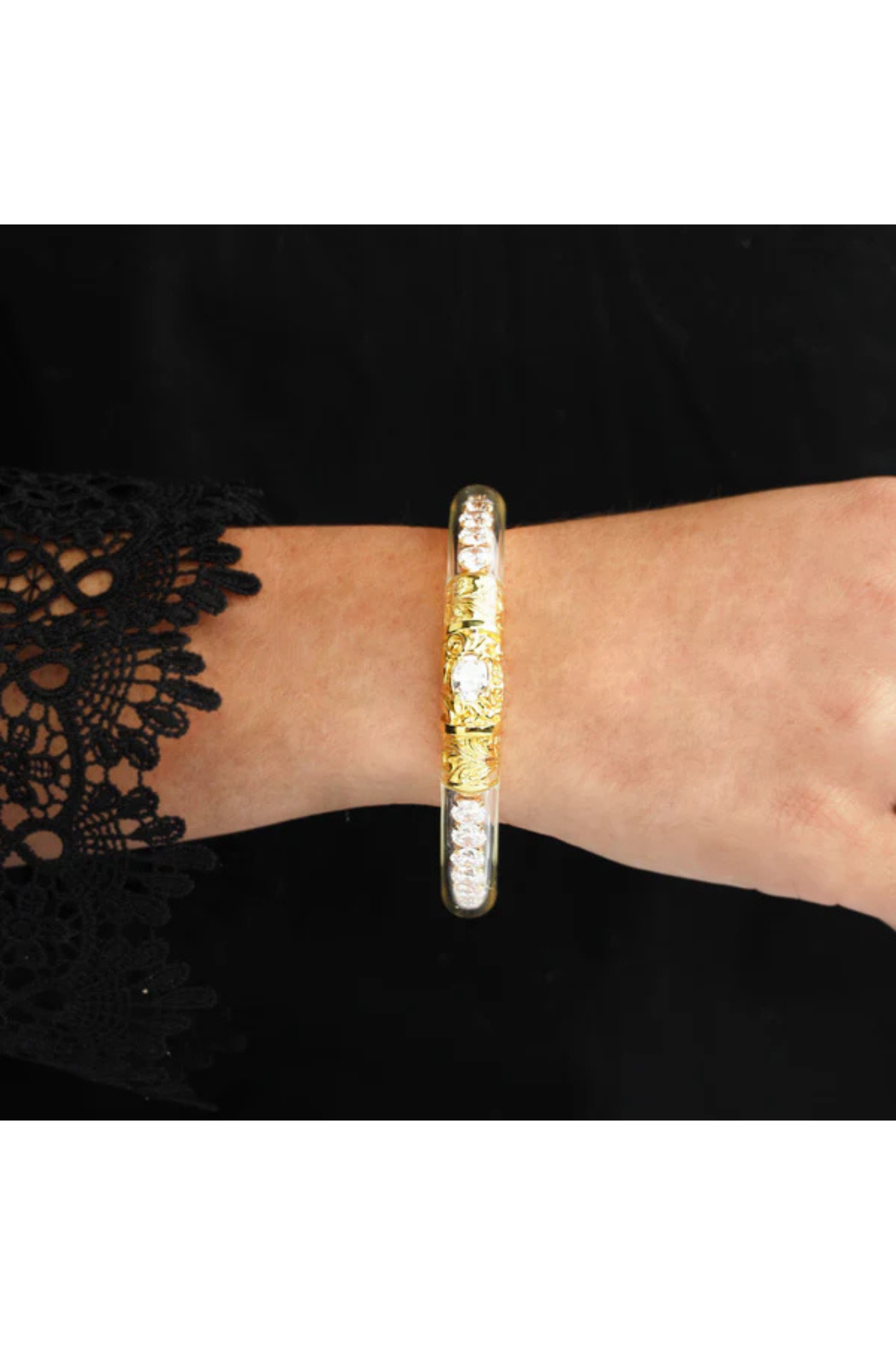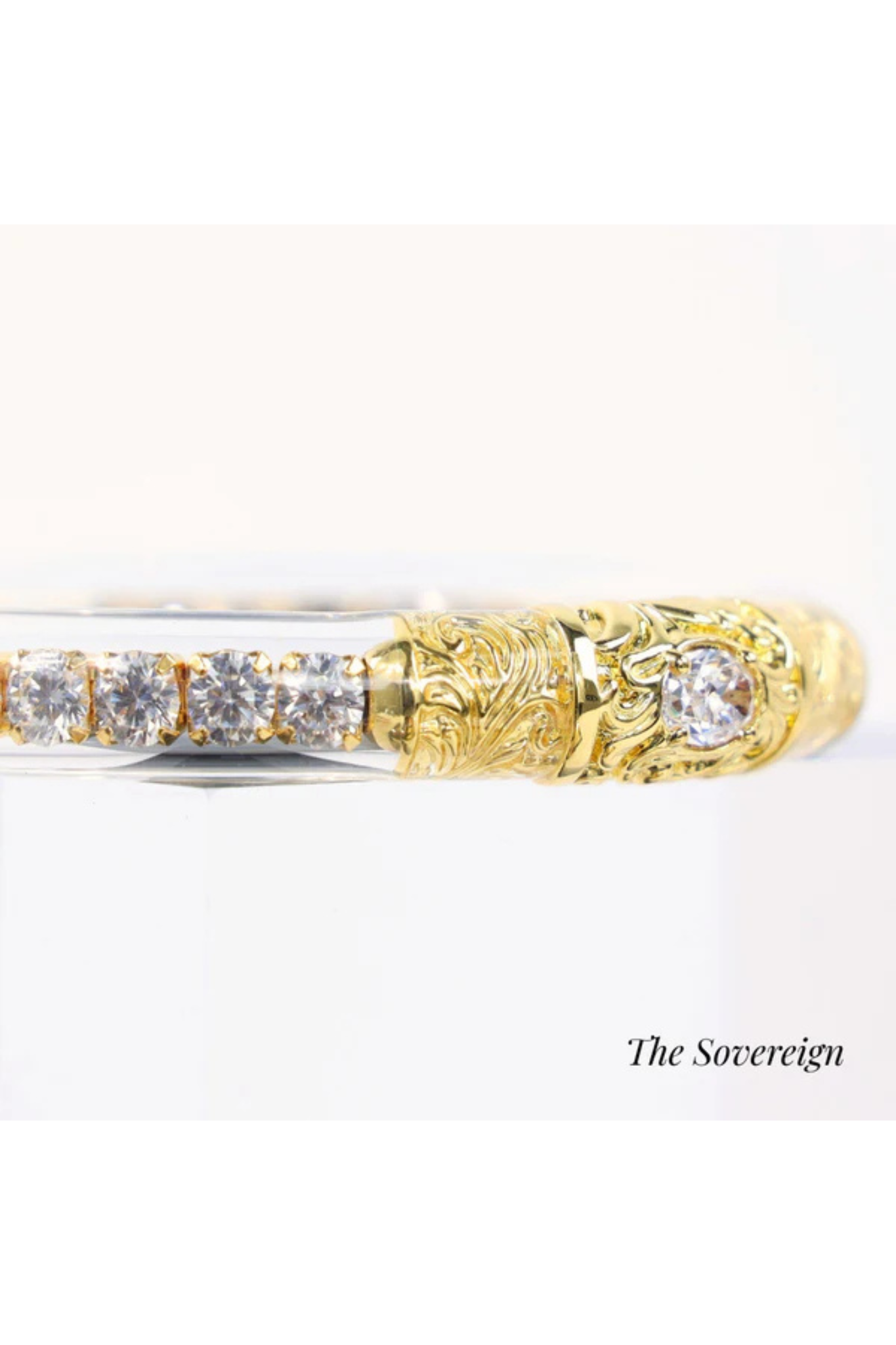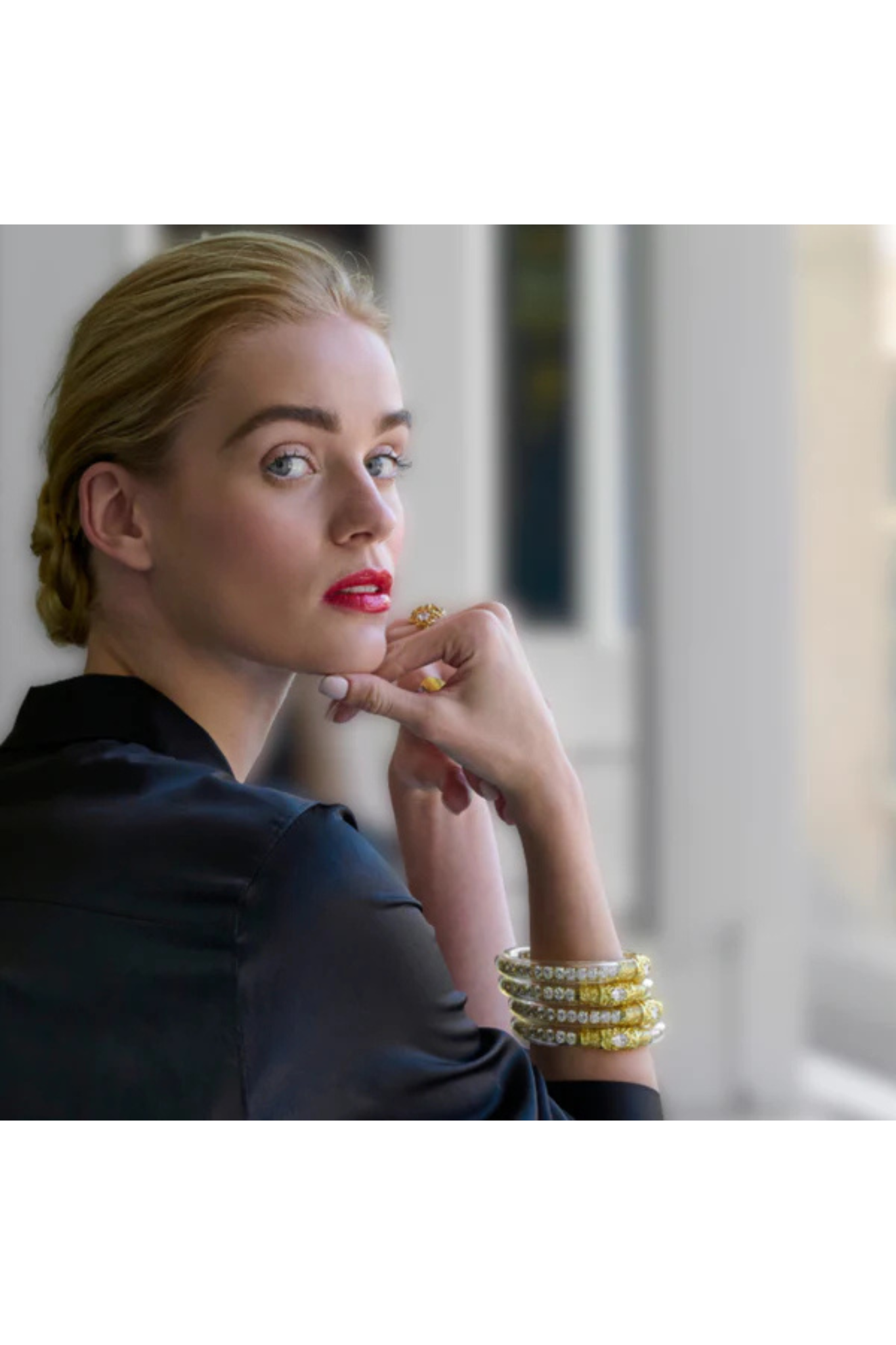 The Sovereign is BuDhaGirl’s most opulent creation — a Tzubbie-sized bangle infused with bold 8mm crystals that capture light like frozen starlight. Finished with a lavish Rococo bead and handcrafted by artisans, it transforms every moment into one of extraordinary elegance. One bangle per order (featured image shows 3 for styling purposes).