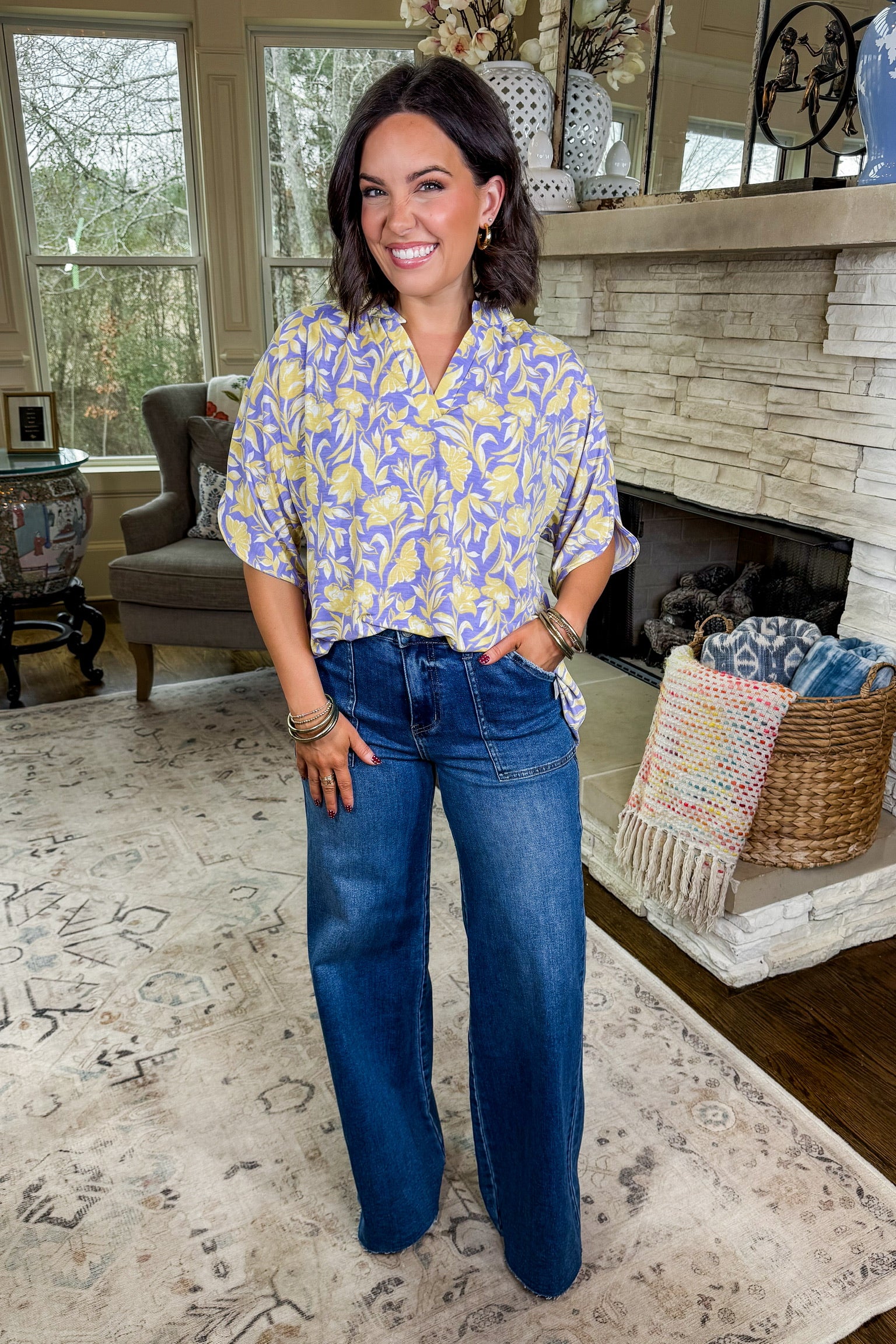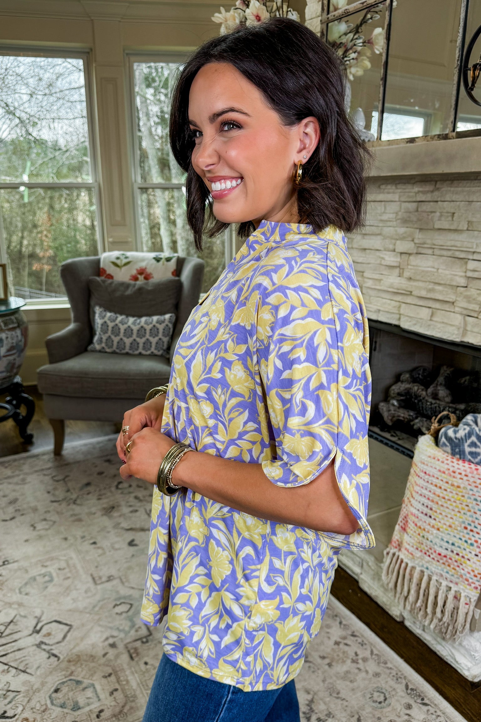 The Lizzy Breeze Short Sleeve Top in Lilac/Yellow Floral