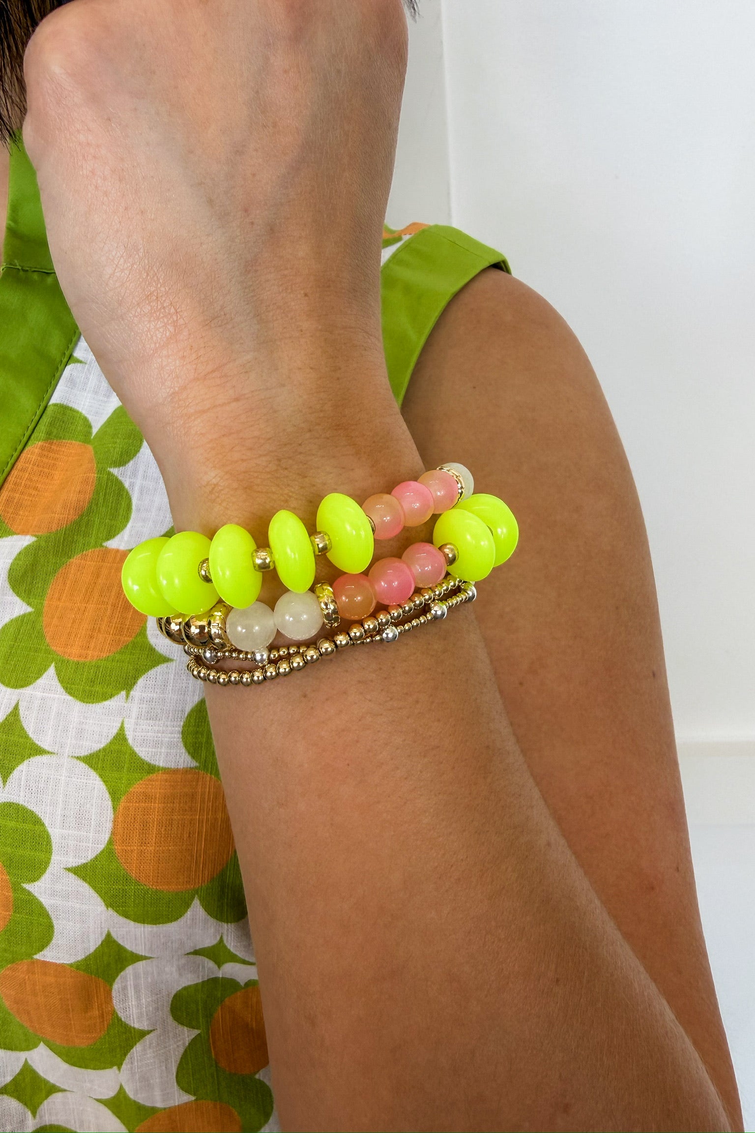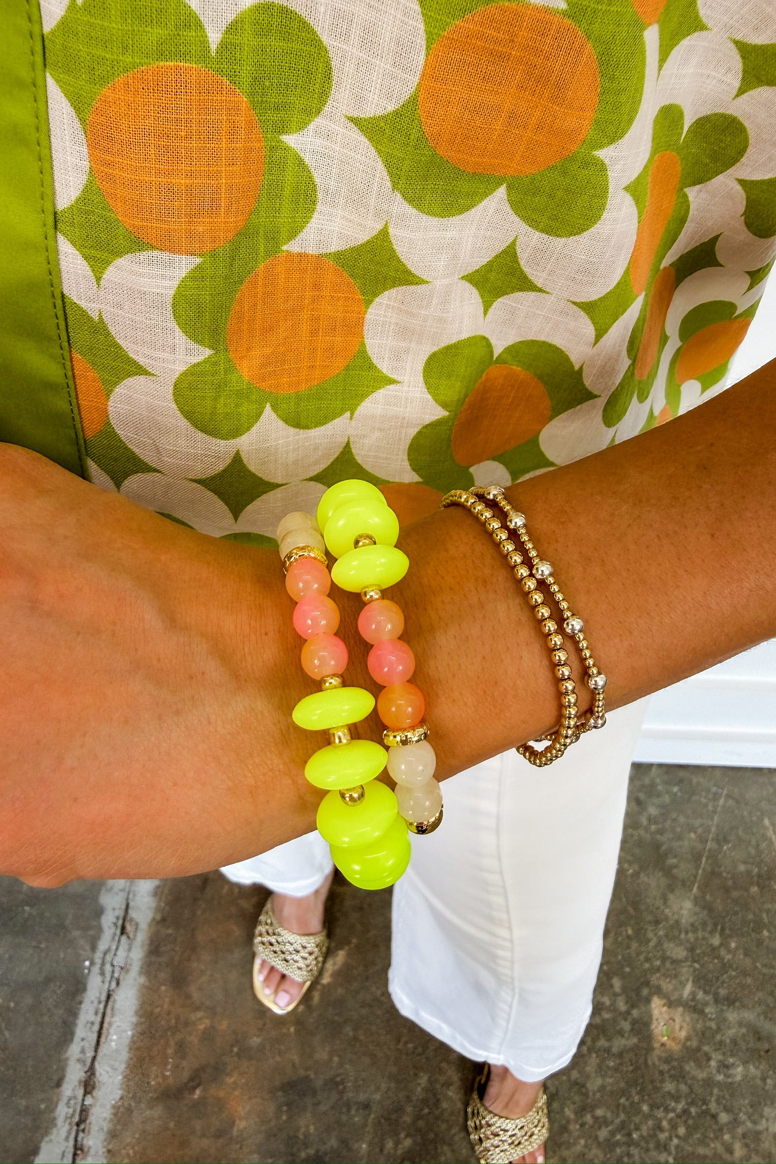 Effortless elegance meets everyday comfort with this yellow beaded stretchy bracelet pair. Crafted with smooth, polished beads in a vibrant yellow hue, each bracelet stretches to fit most wrists securely without clasps or fasteners. Perfect for layering or wearing individually, this versatile duo transitions seamlessly from casual to dressed-up occasions. Lightweight and durable, these bracelets are ideal for stacking with other pieces or standing alone as a refreshing pop of color.