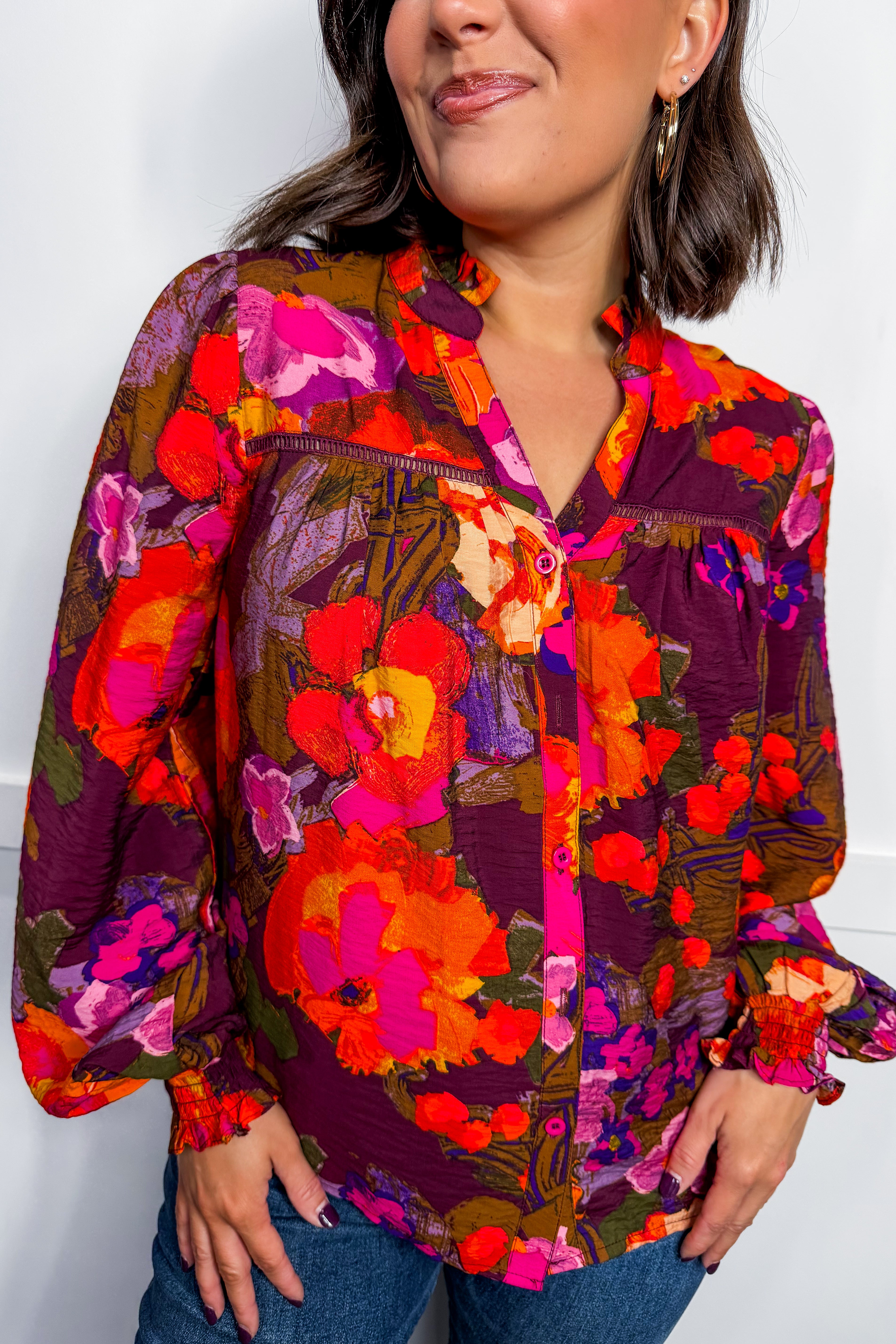 Turn heads in the Moment of Muse Blouse, a stunning mix of rich plum, tangerine, and fuchsia florals. This statement top brings instant warmth and personality to your wardrobe, pairing perfectly with denim, leather, or a tailored trouser. The lightweight fabric and button-front detail make it effortlessly chic and breathable for any season.