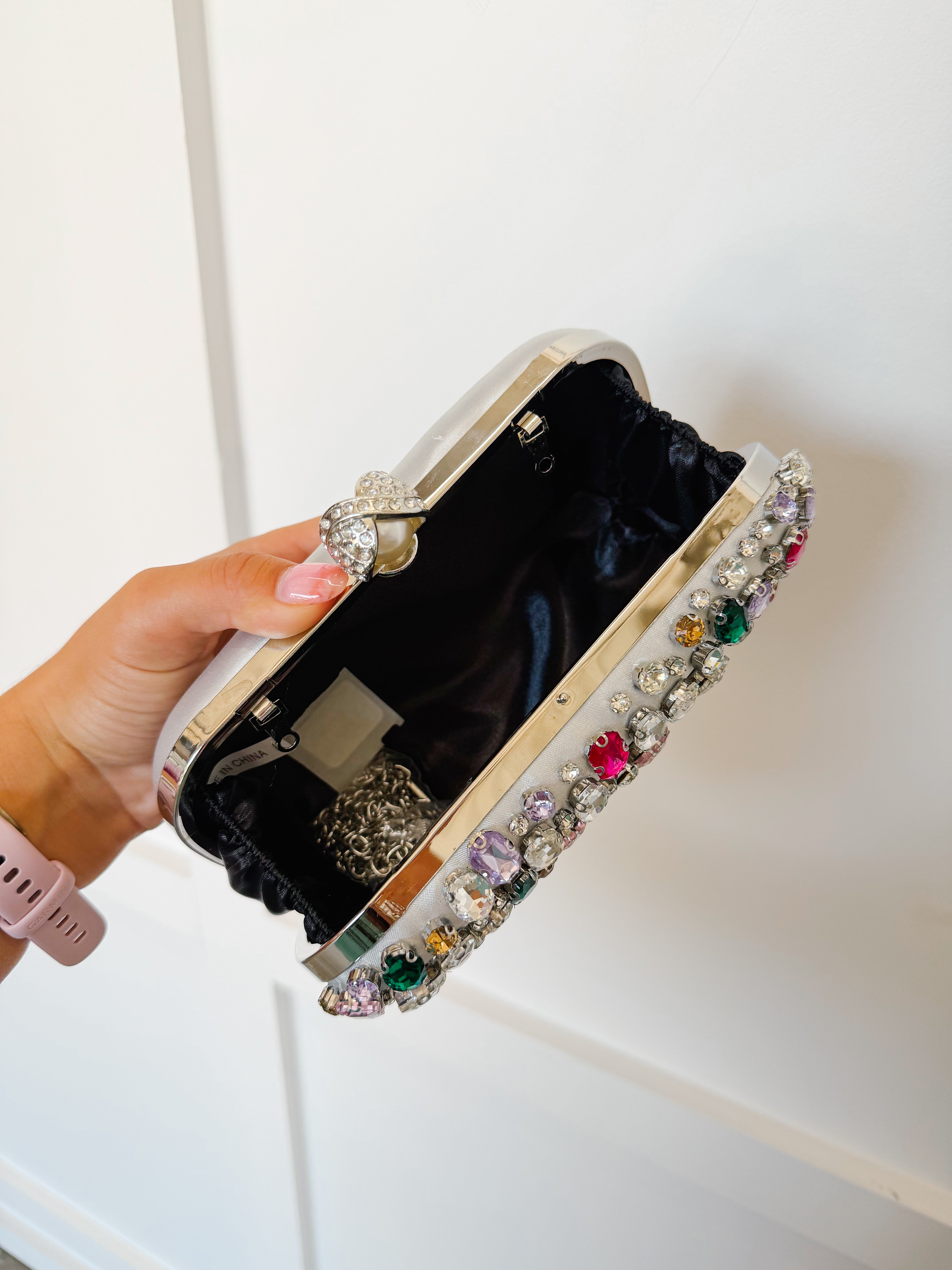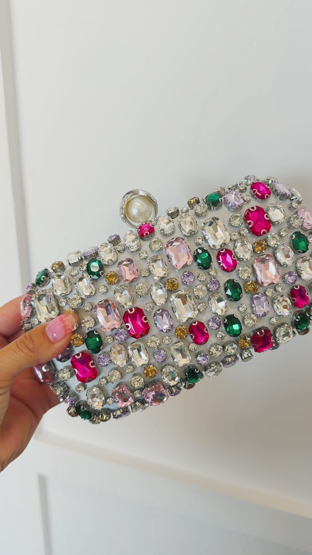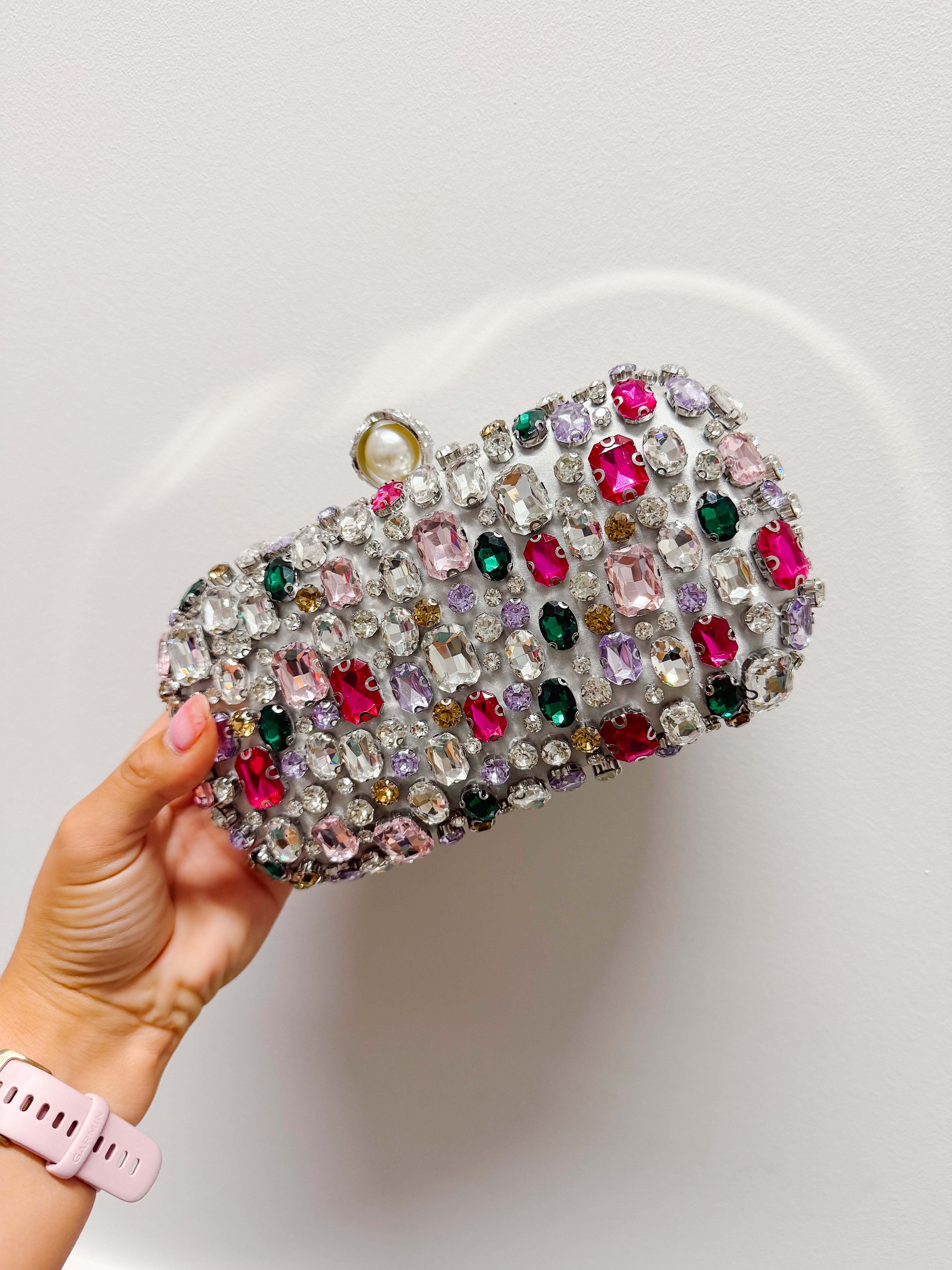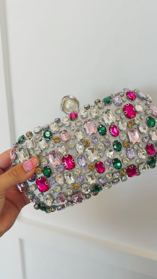 Bold, dazzling, and made to stand out, the Jewel Box Statement Clutch is your go-to accessory for any special occasion. Covered in a mix of vibrant, multi-colored gemstones, this clutch brings a luxe, eye-catching touch to any outfit. The structured silhouette and sparkling finish make it perfect for weddings, parties, and nights out, while the compact size holds just what you need. It’s the ultimate finishing piece that instantly elevates your look.