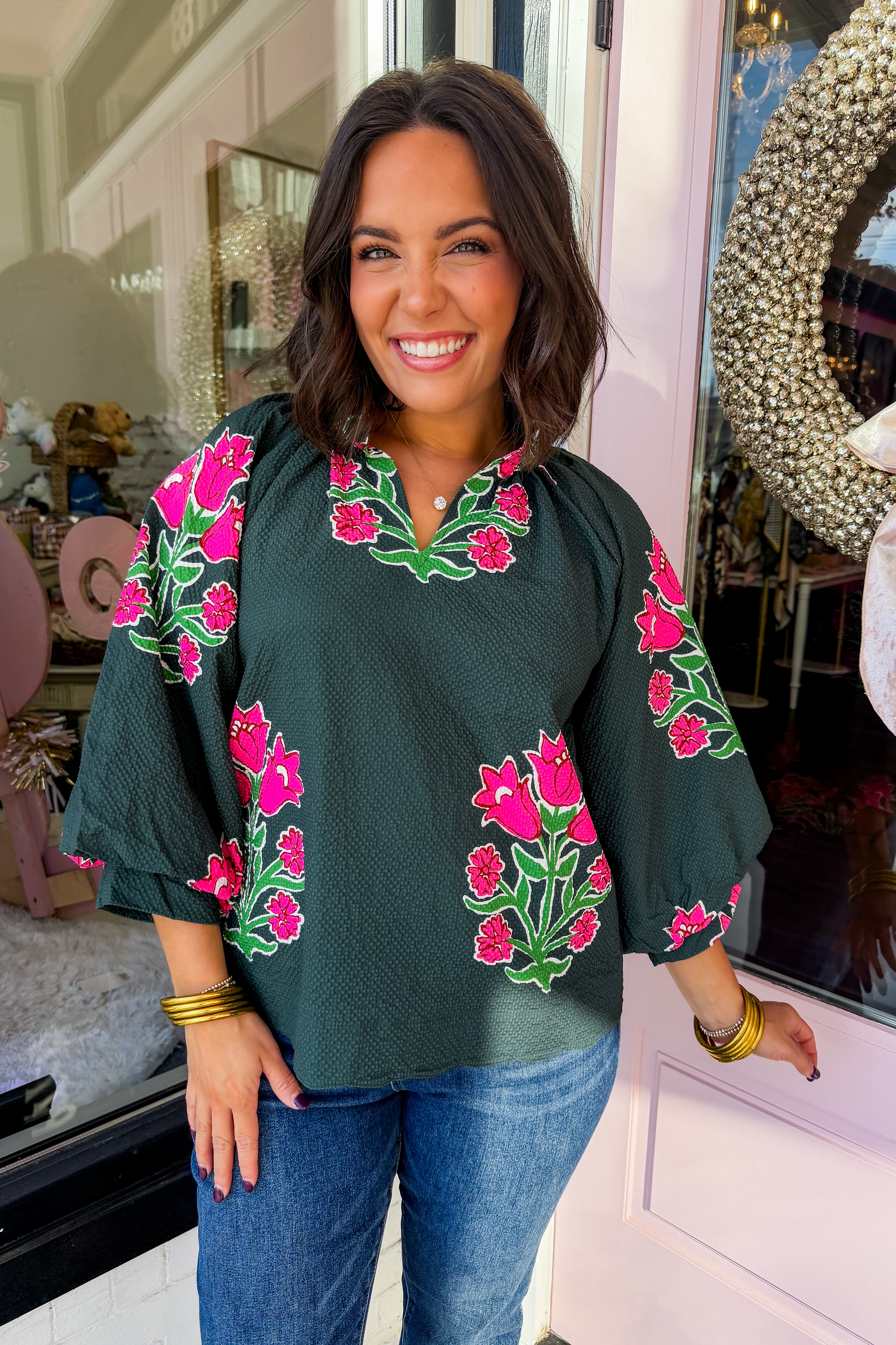Brighten up your wardrobe with the Meadow Bloom Top! Featuring a rich textured green fabric with vibrant pink floral embroidery, this piece is effortlessly feminine and flattering. The flowy sleeves and relaxed silhouette give it an easy, elegant drape — perfect for pairing with denim or a skirt for a chic day-to-night look.