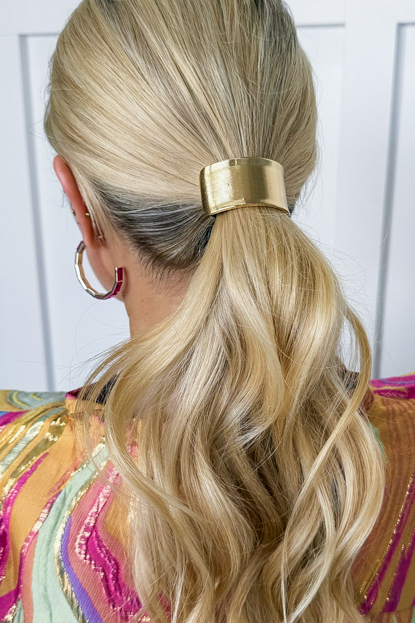 Elevate any ponytail with our Golden Sleek Hair Cuff! 🌟 This sleek elastic features a knotted gold-tone cuff that adds instant sophistication to your everyday or evening look. Whether you’re heading to brunch or a holiday event, it’s the perfect accessory for that effortless polished touch.