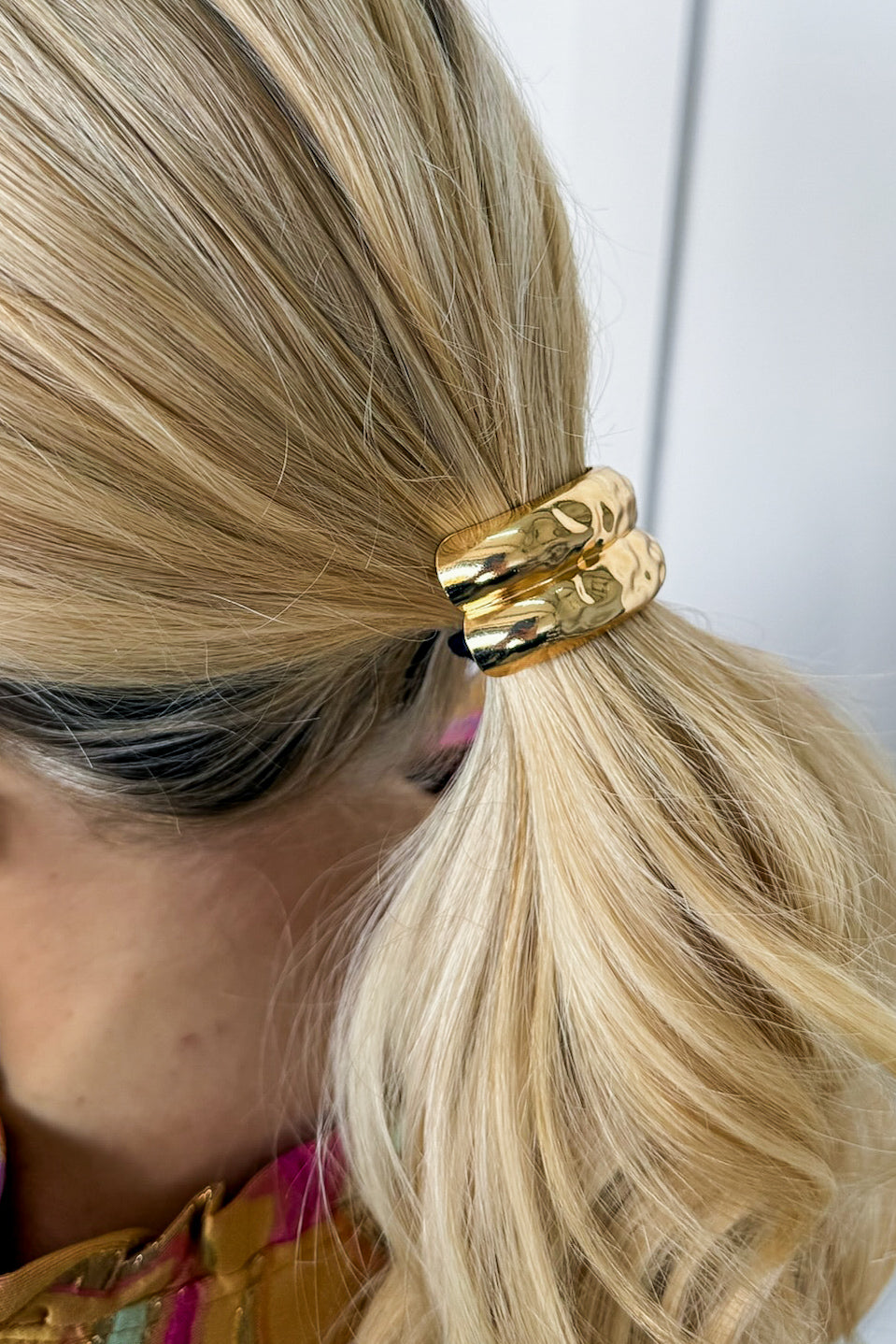 Elevate any ponytail with our Golden Wave Hair Cuff! đ This sleek elastic features a hammered gold-tone cuff that adds instant sophistication to your everyday or evening look. Whether youâre heading to brunch or a holiday event, itâs the perfect accessory for that effortless polished touch.