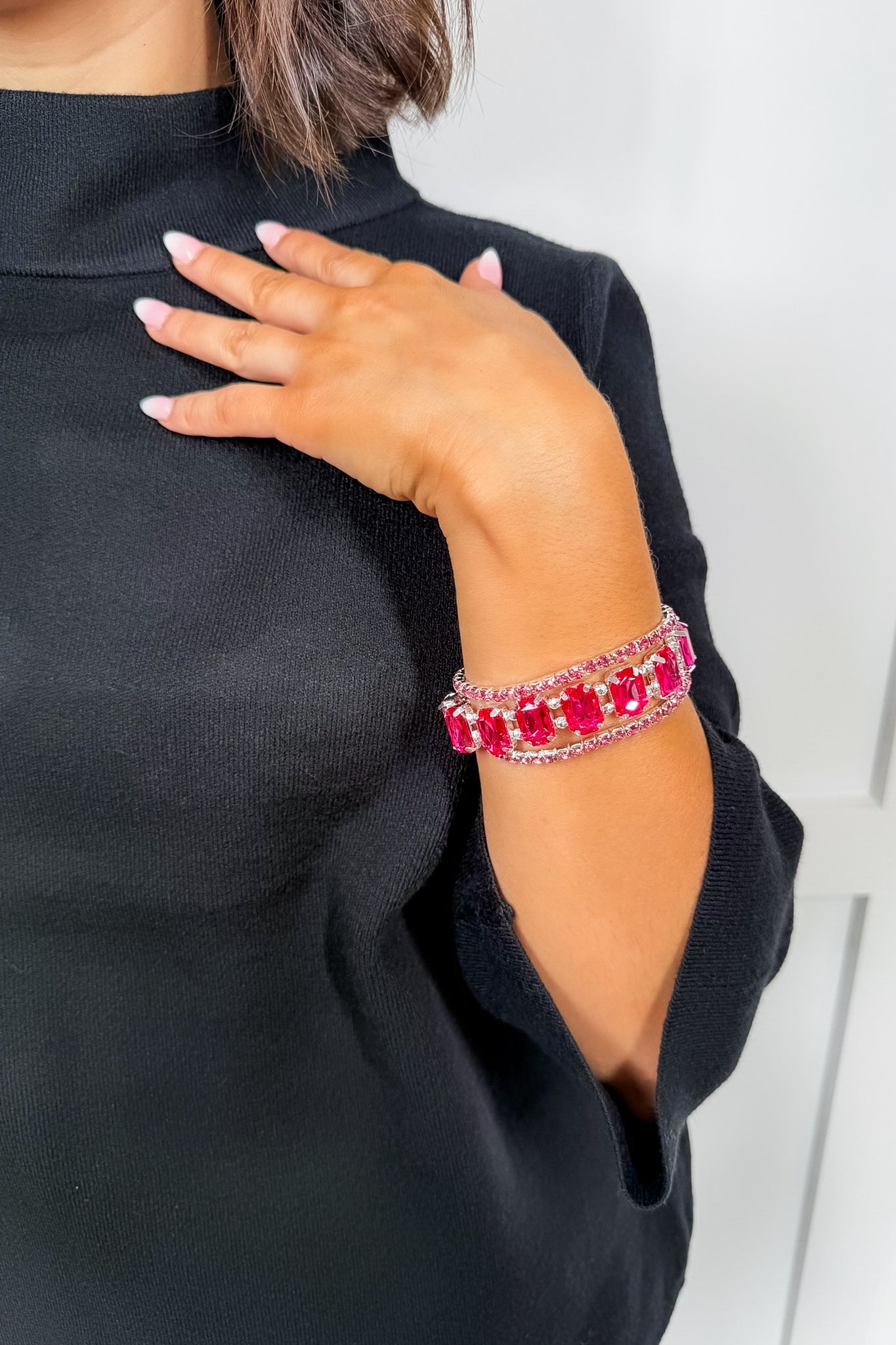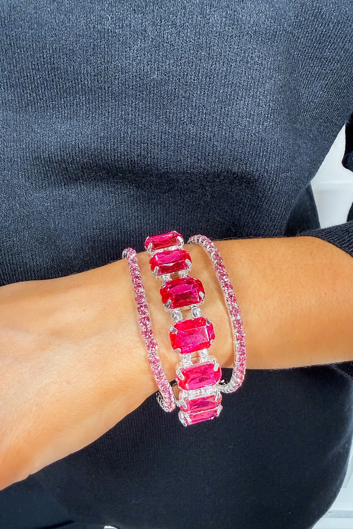 Bring the drama with the Pink Shine Bracelet Set. This stunning red bracelet set features one bold, statement-making gem bracelet and one slim rhinestone strand — perfect together or worn solo for a pop of holiday sparkle. The radiant ruby tone adds the perfect festive finish to your holiday and party looks.