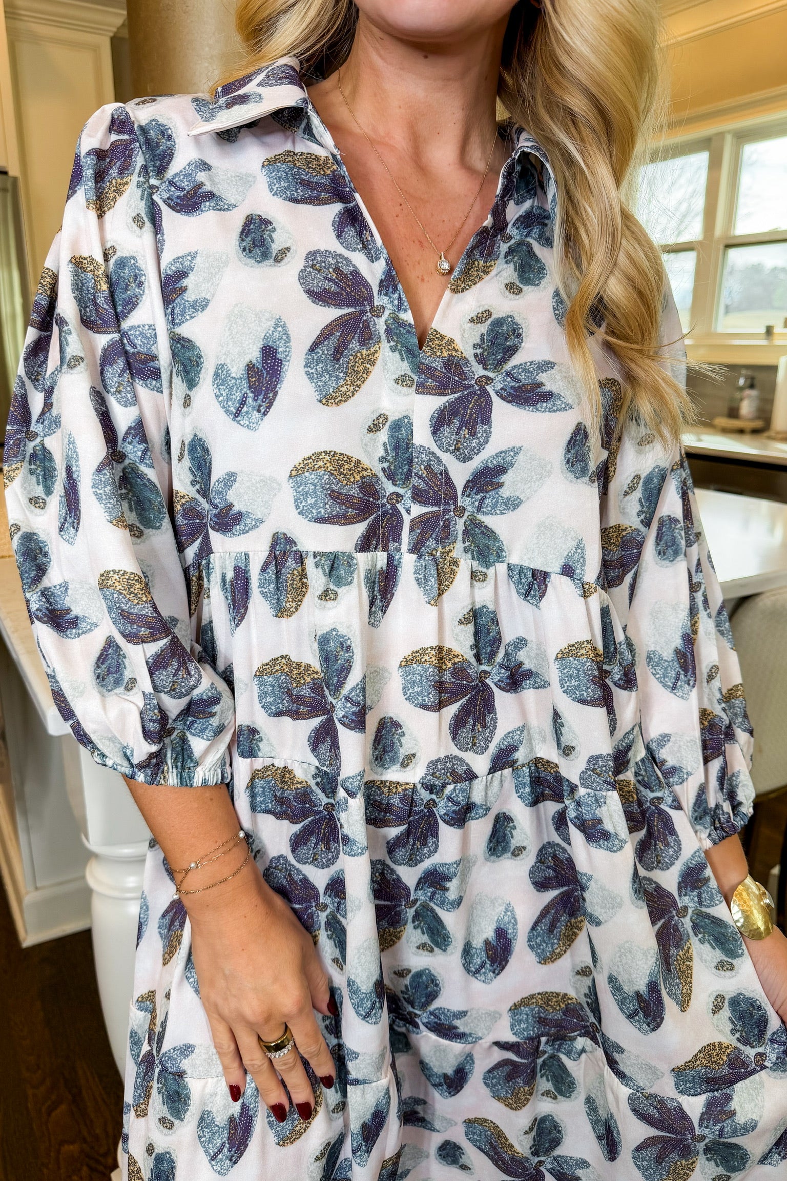 Hot Pink Deal - Collared Notch Neck Blue Floral Tiered Ivory Midi Dress
