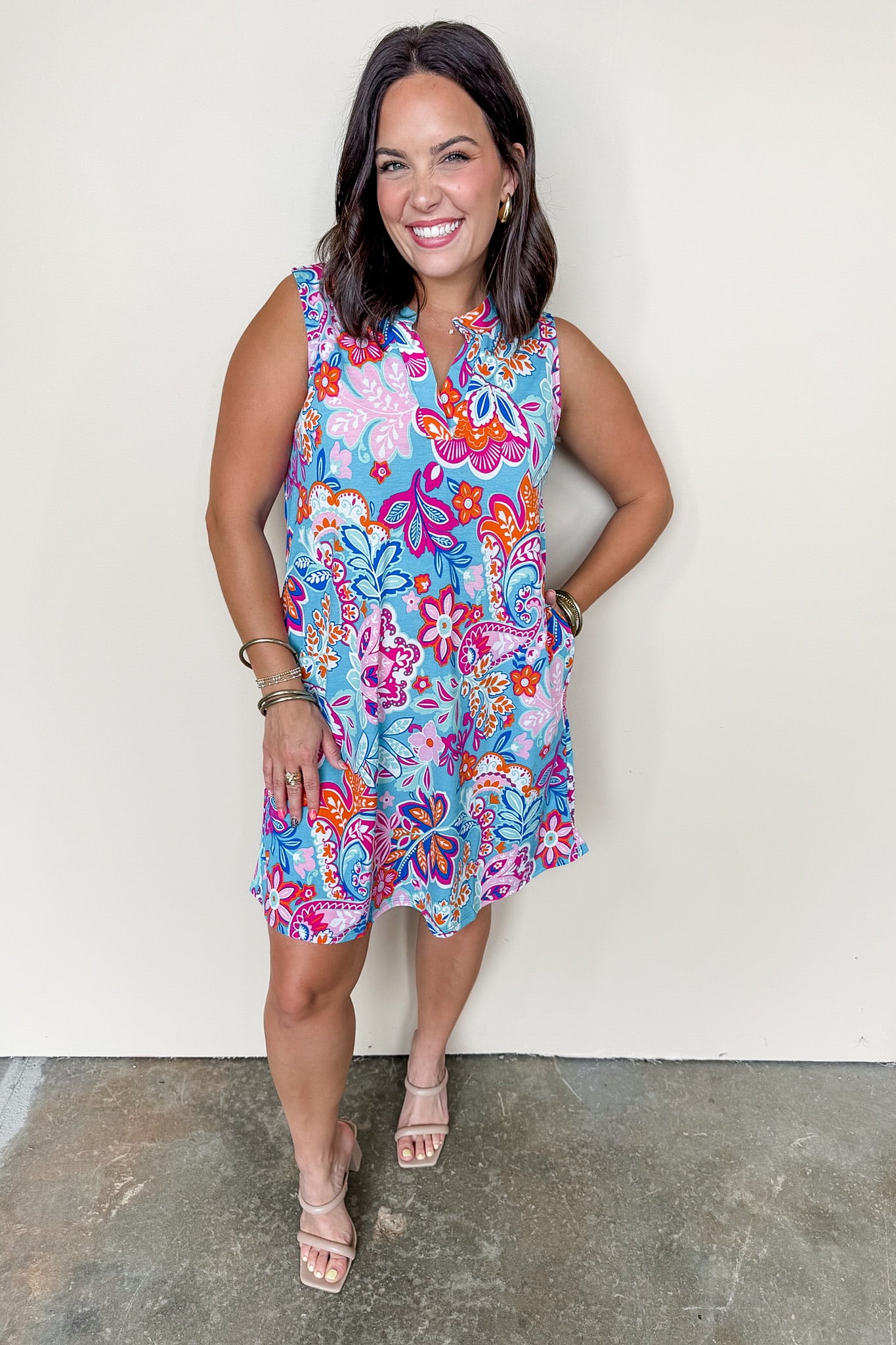 The Dear Scarlett Liz Short Dress in Blue Paisley offers a refined look with its sleeveless tank top design and flattering V-neck detail. The dress gracefully falls above the knee, showcasing a chic silhouette, while its wrinkle-free fabric ensures you stay polished and sophisticated all day long.