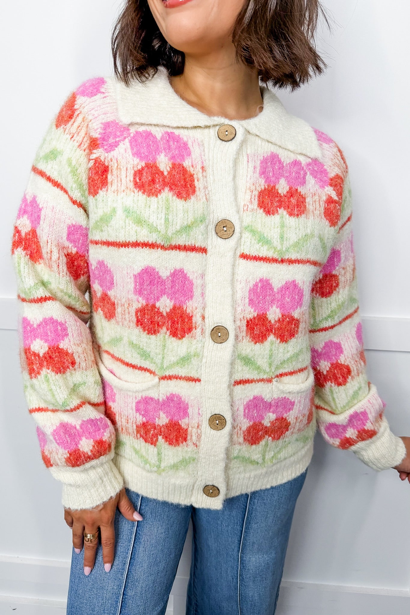 Button up your style with this charming long-sleeve cardigan featuring a delightful floral design. Practical front pockets keep your essentials within reach and the relaxed fit . A versatile wardrobe staple that brings effortless elegance to any outfit.