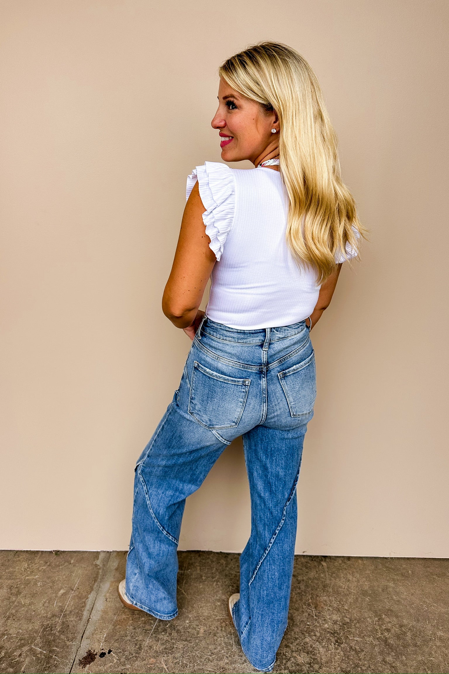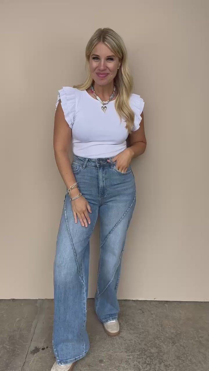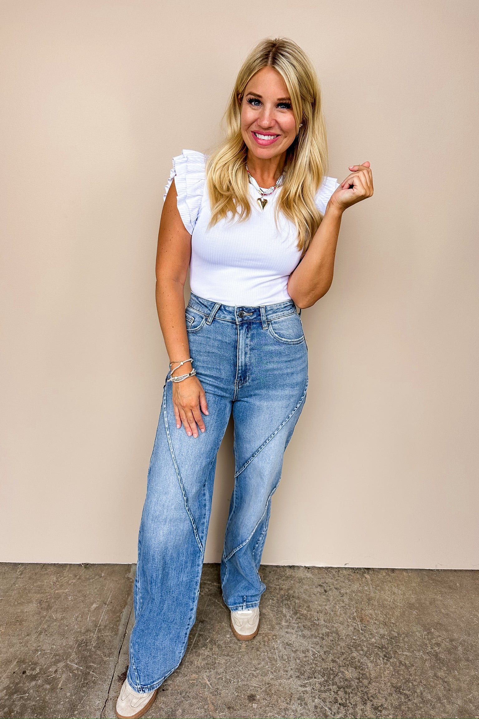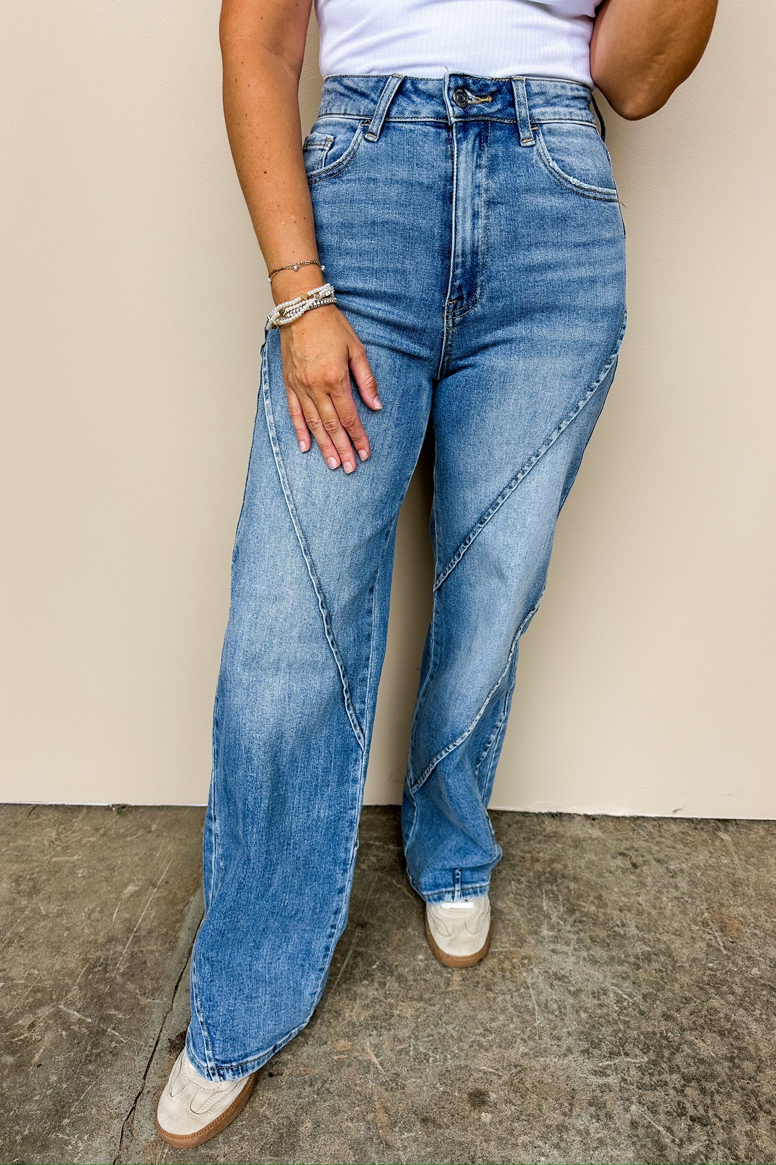 Introducing The Blair High Rise Diagonal Seam Wide Leg Jeans - a trendy twist on traditional wide leg jeans. With a medium wash and unique diagonal seams, these jeans are sure to turn heads. Say goodbye to boring denim and hello to chic style!