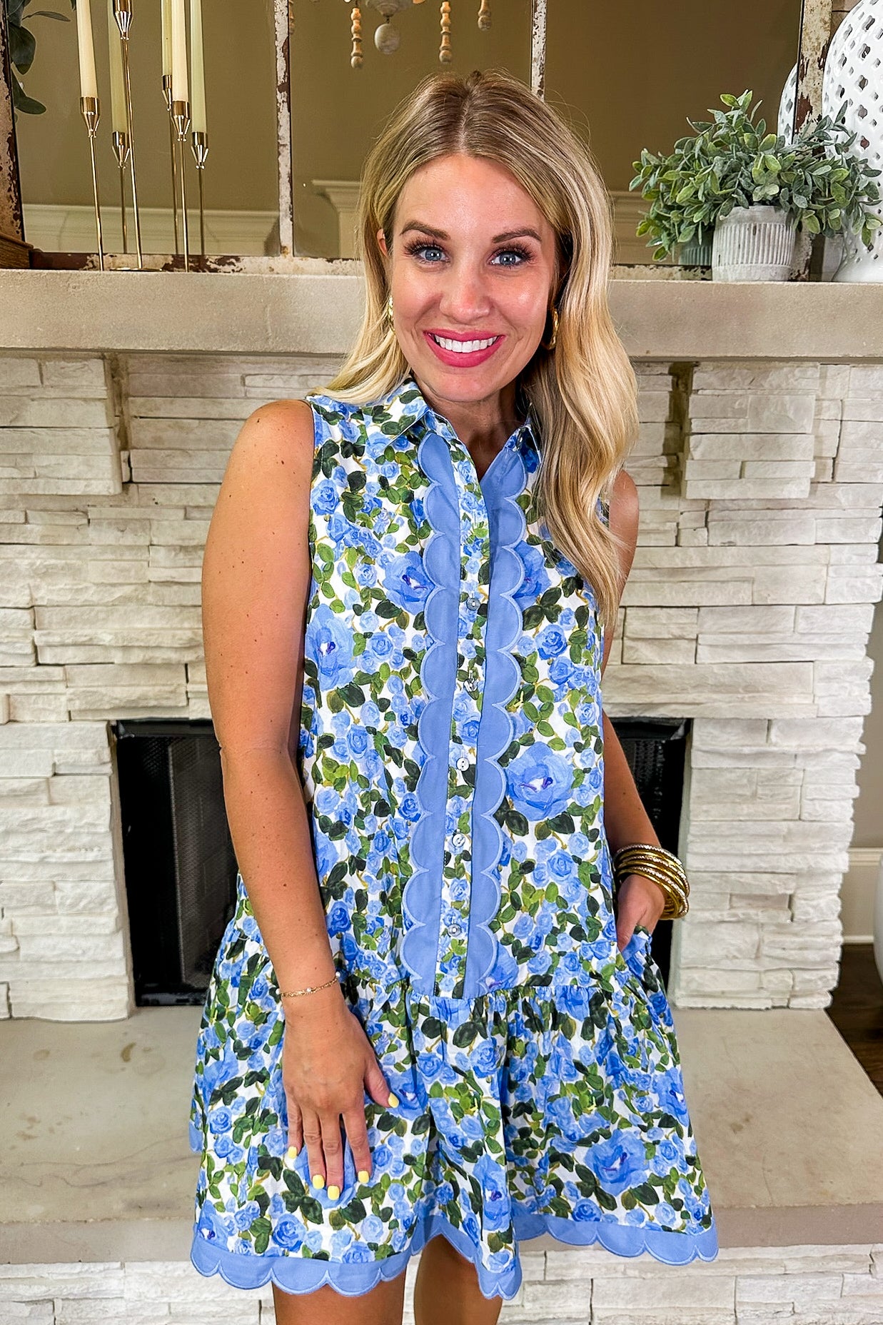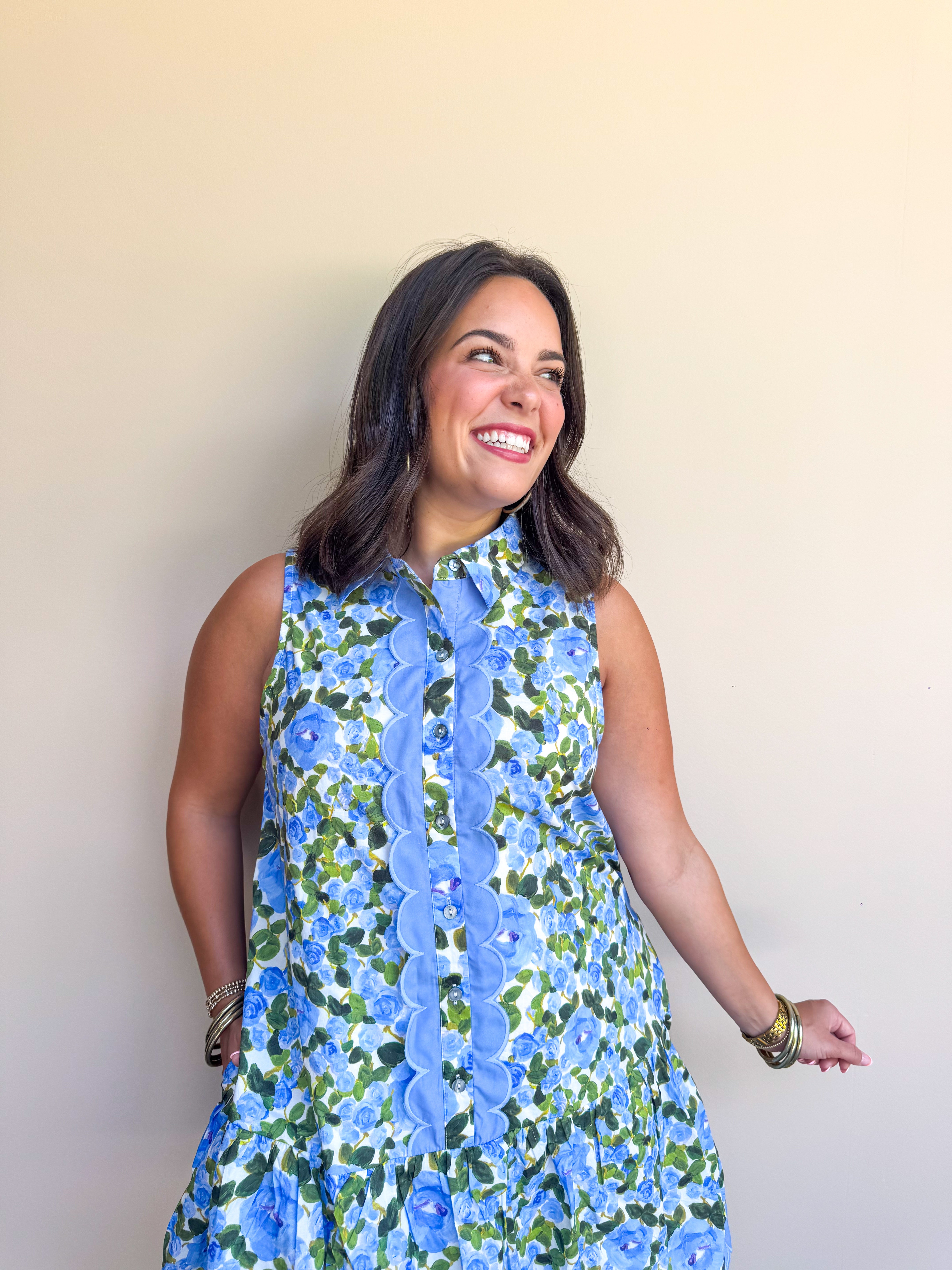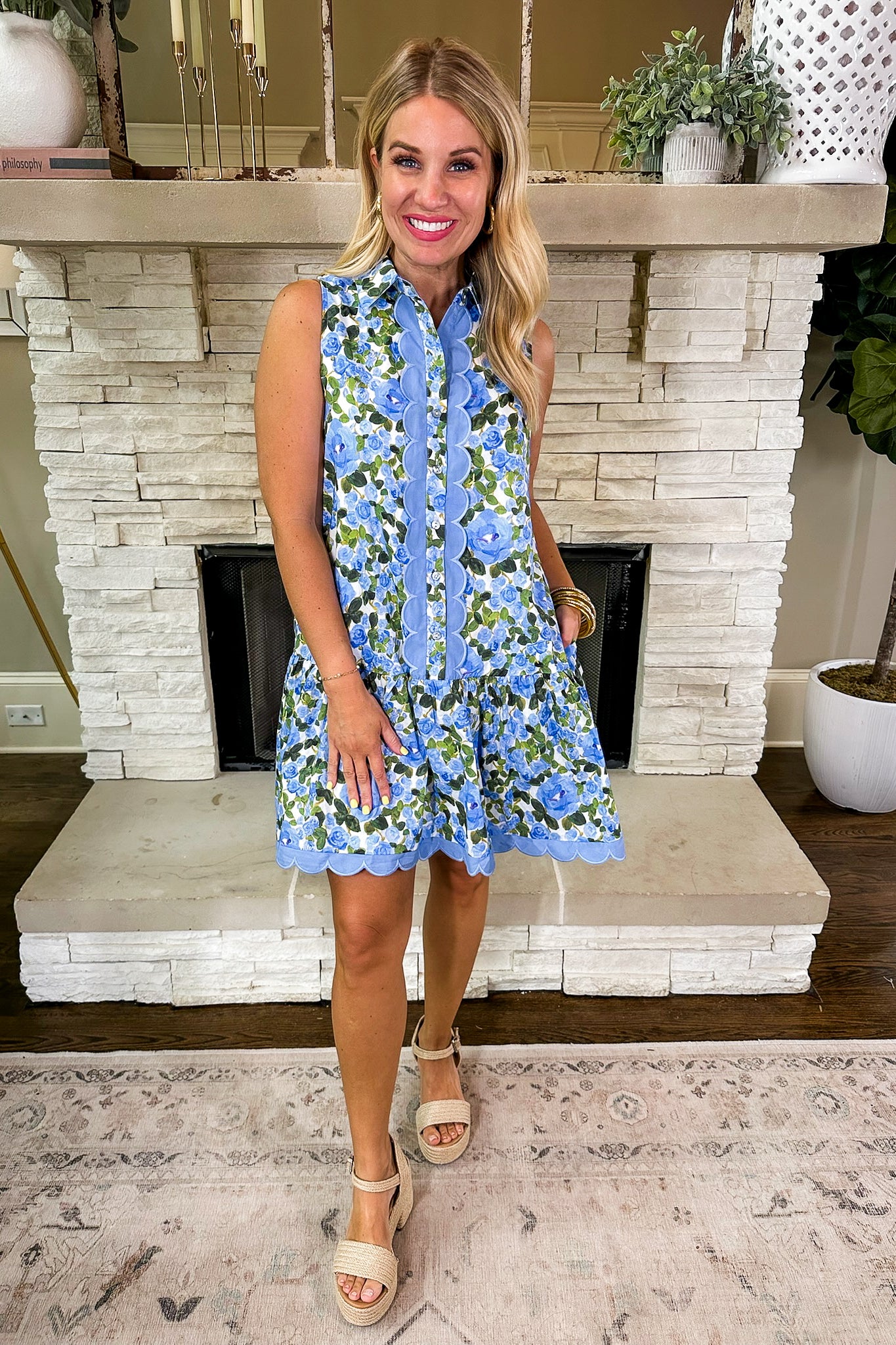 Nothing says summertime in the south like blue hydrangeas. This dress is a head turner - with the sweetest scallop detail trim. It also has pockets!
