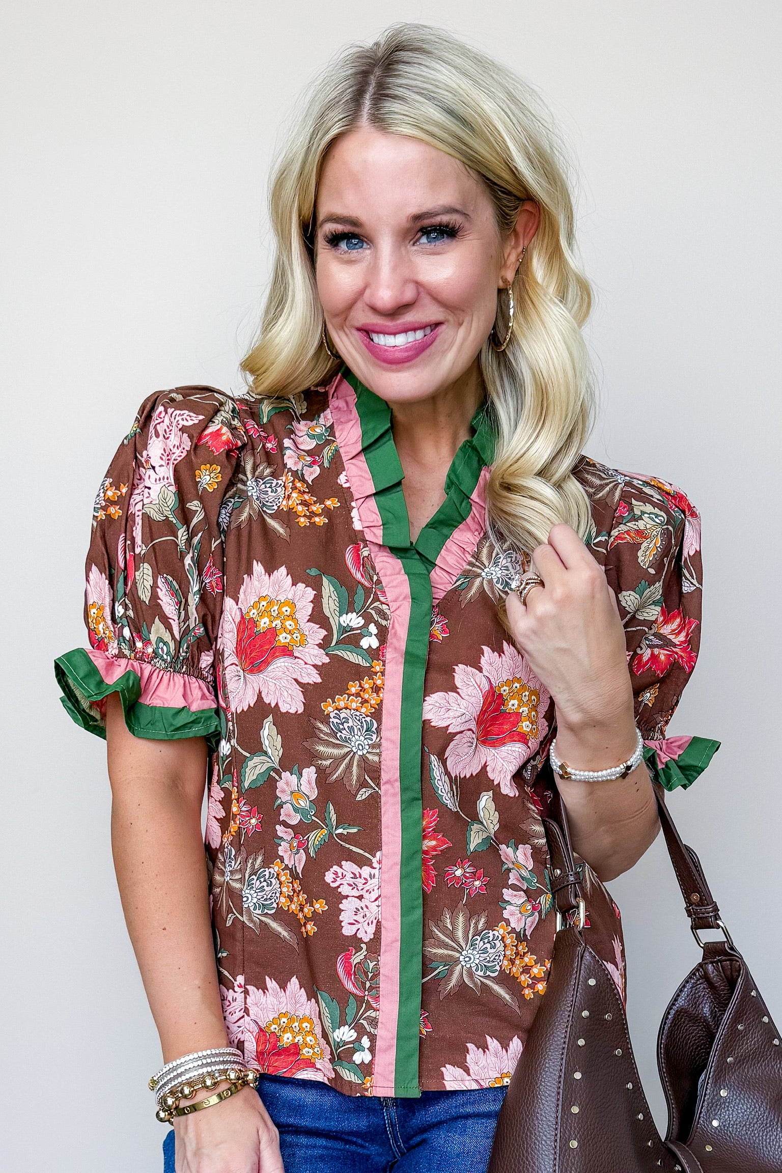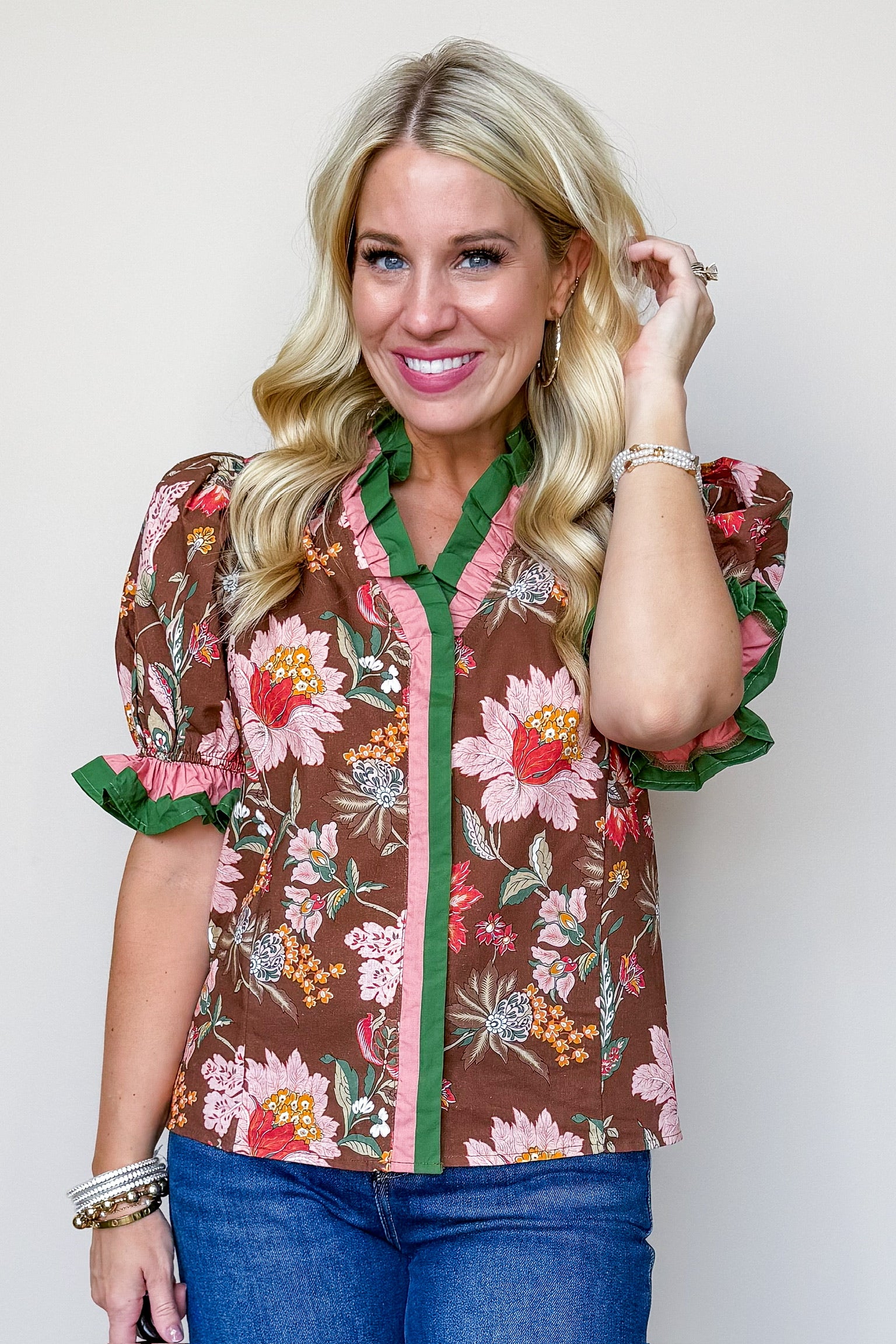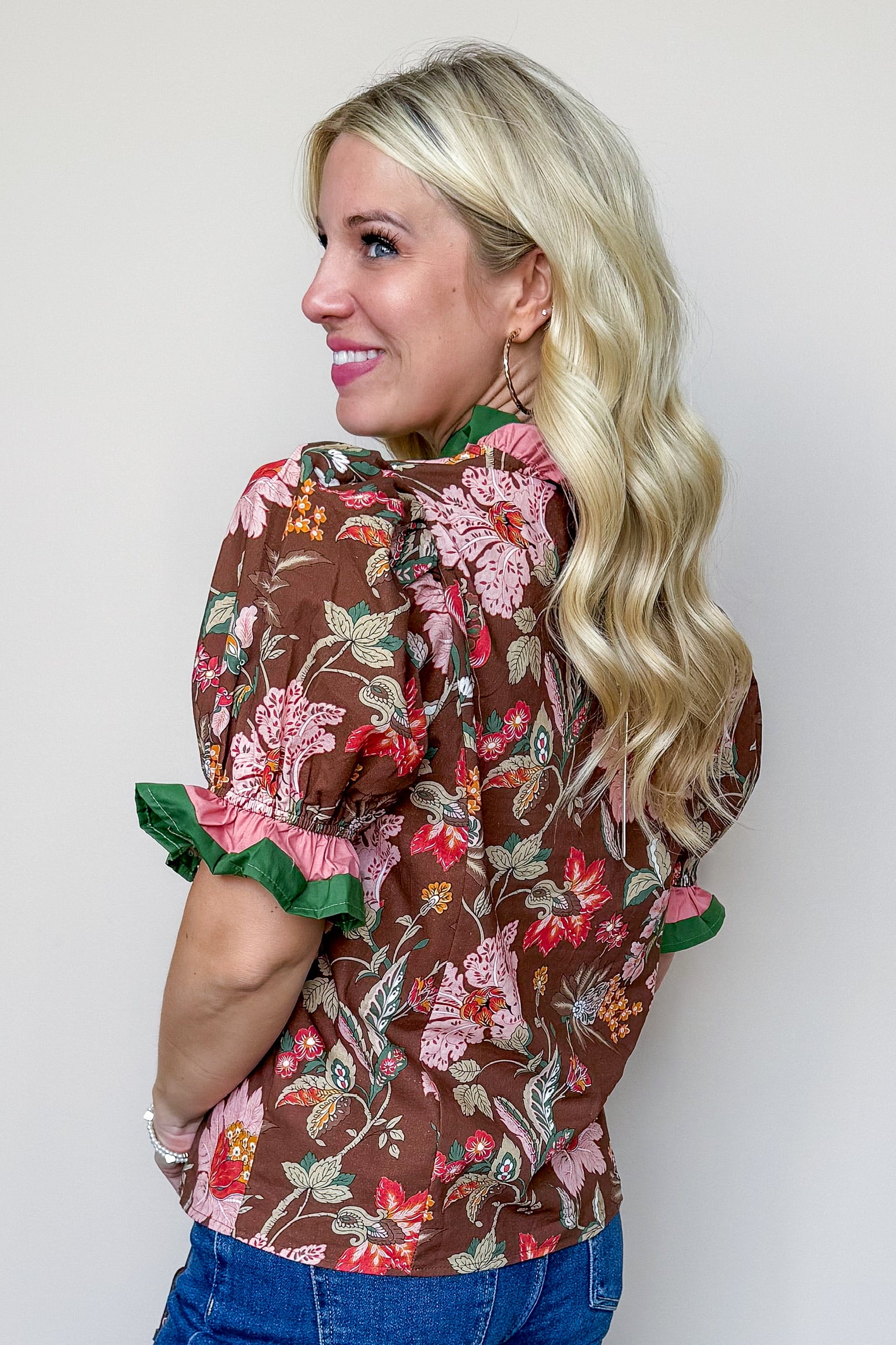 This Brown Floral Ruffle Printed Top brings a playful charm with its vibrant pink and green florals dancing across a warm brown background. Featuring a flattering V-neck and delicate ruffle details, it adds a flirty touch to your look. Puff sleeves offer a trendy silhouette, while the waist-length cut ensures a perfect fit for effortless style.