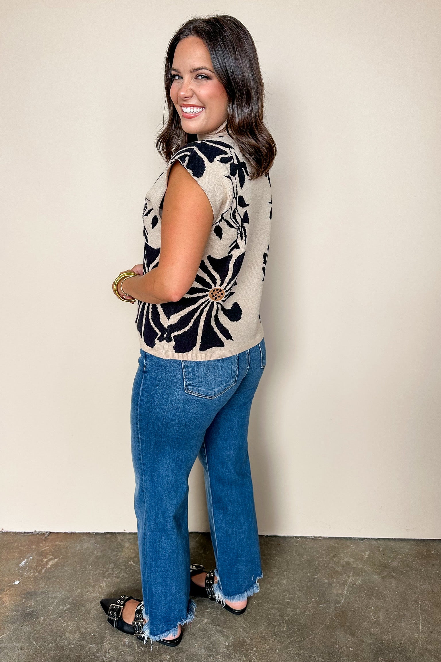 This cream sweater is your new playful essential with chic black details and a flirty mock neck. Its cap sleeves add a dash of fun while the waist-length cut keeps it perfectly flattering. Easy to dress up or down, it’s the cozy piece you didn’t know you needed!