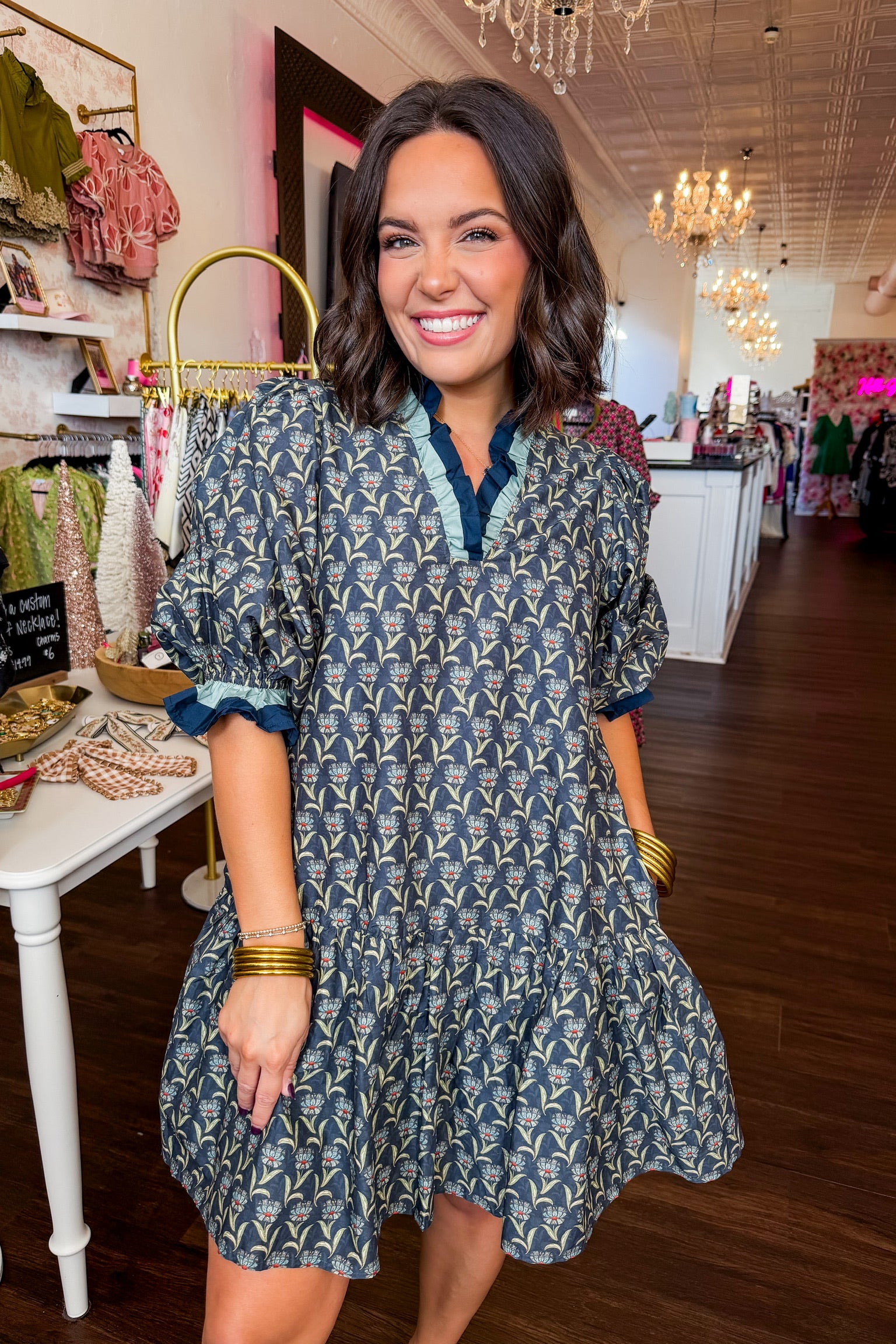 Say hello to your statement dress — This stunning piece features an intricate vintage-inspired print with subtle gold and sage tones. The ruffled neckline and soft pleated detailing add a feminine touch, while the puff sleeves and flowy skirt keep it effortlessly wearable. It’s the perfect blend of romantic and refined, made to turn heads from coffee dates to candlelit dinners.