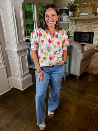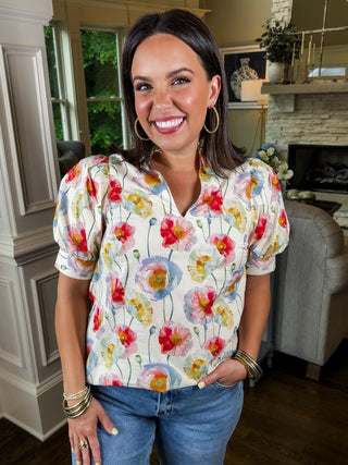 Hot Pink Deal - Puff Sleeve Polo Top in Cream