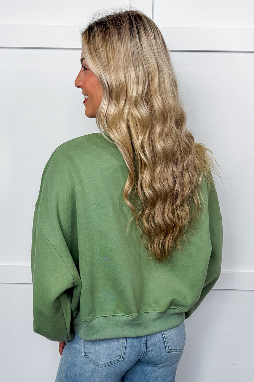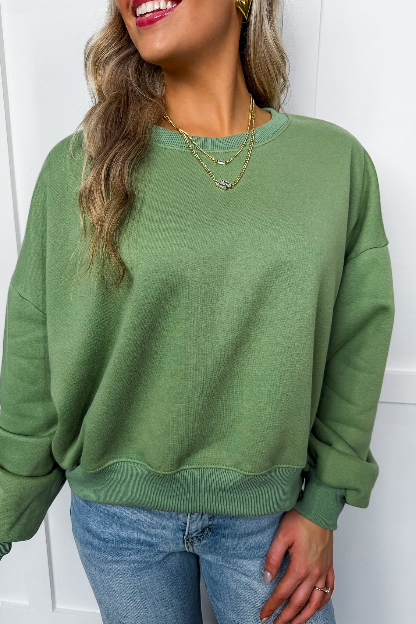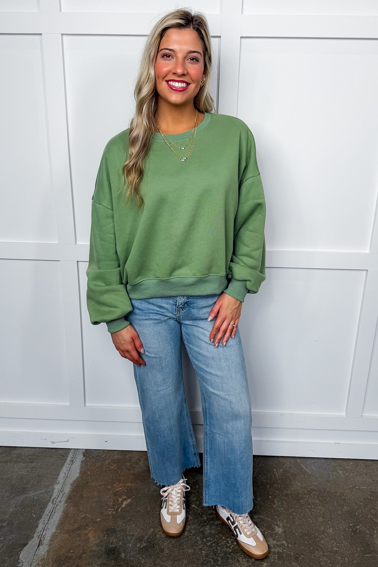 The soft-tone basic that goes with everything. This sage sweatshirt feels like a hug — relaxed, slouchy, and perfectly oversized for that comfy-cute vibe. Pair it with jeans for a casual look or keep it cozy with lounge shorts and sneakers.