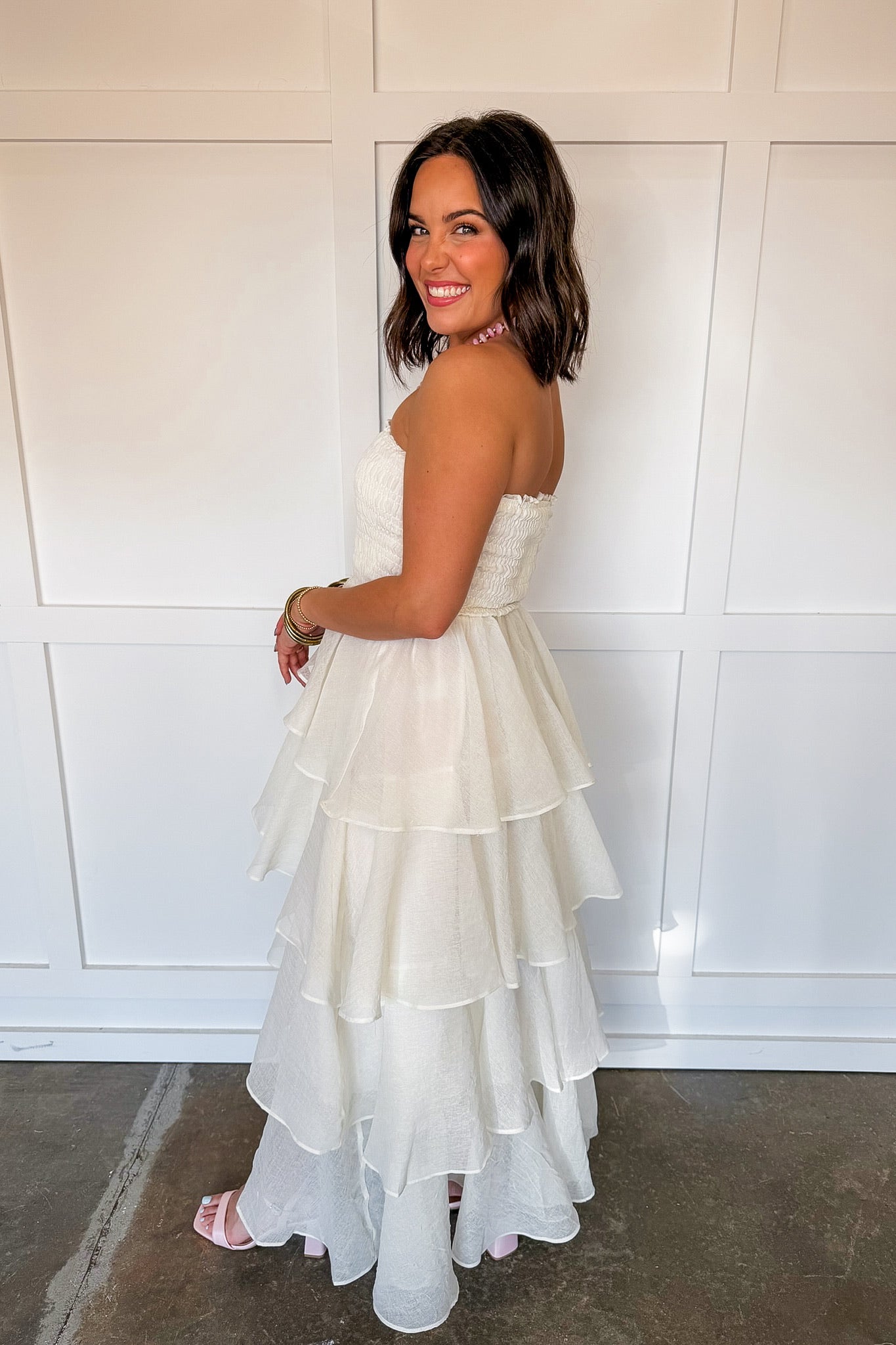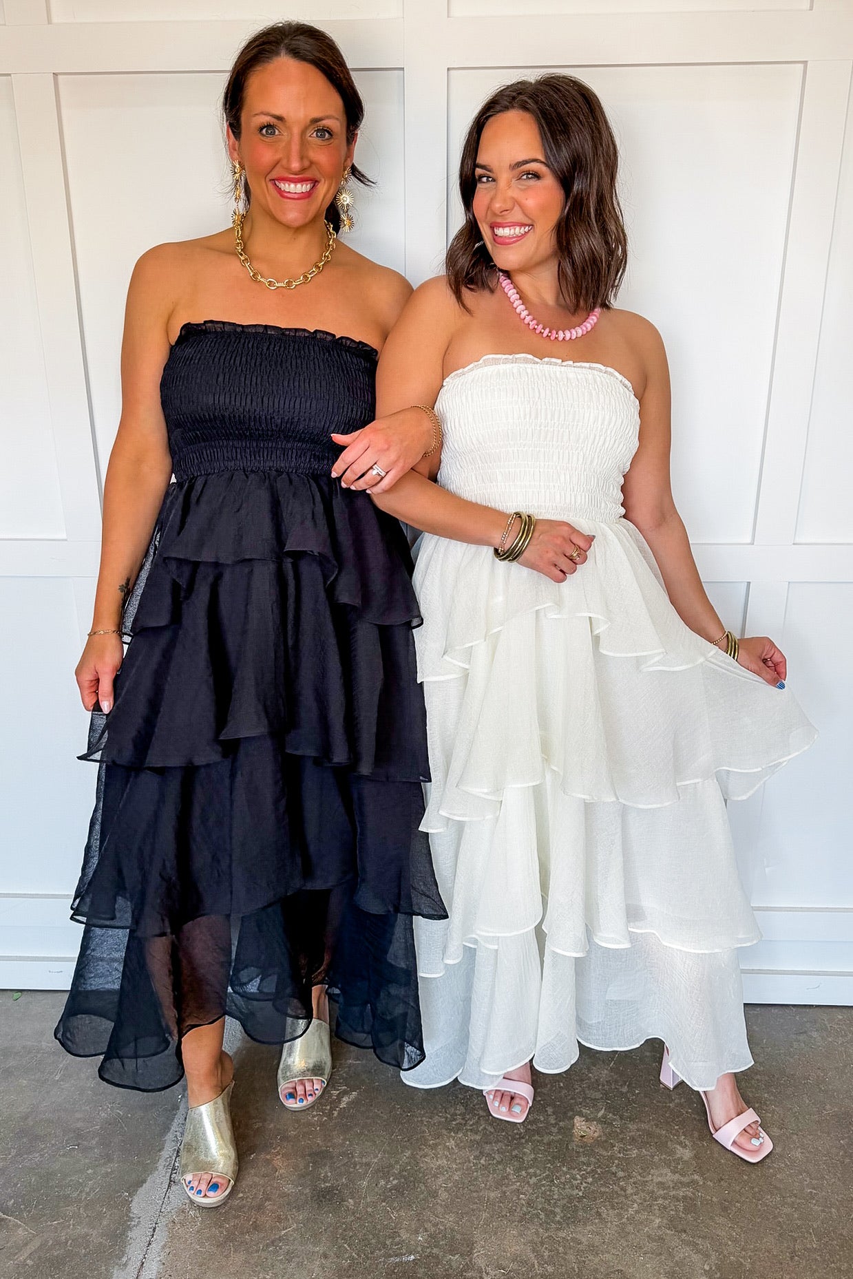 Make every moment feel like a special occasion in the Save the Date Tiered Midi Dress. This elegant strapless dress features a beautifully smocked bodice that offers a flattering, comfortable fit while creating a timeless silhouette. The flowing tiered chiffon skirt adds soft movement and romantic texture, making it perfect for weddings, showers, date nights, and any RSVP-worthy event. Effortlessly chic and easy to style, this dress pairs perfectly with heels and delicate jewelry for an elevated look that feels both graceful and modern.