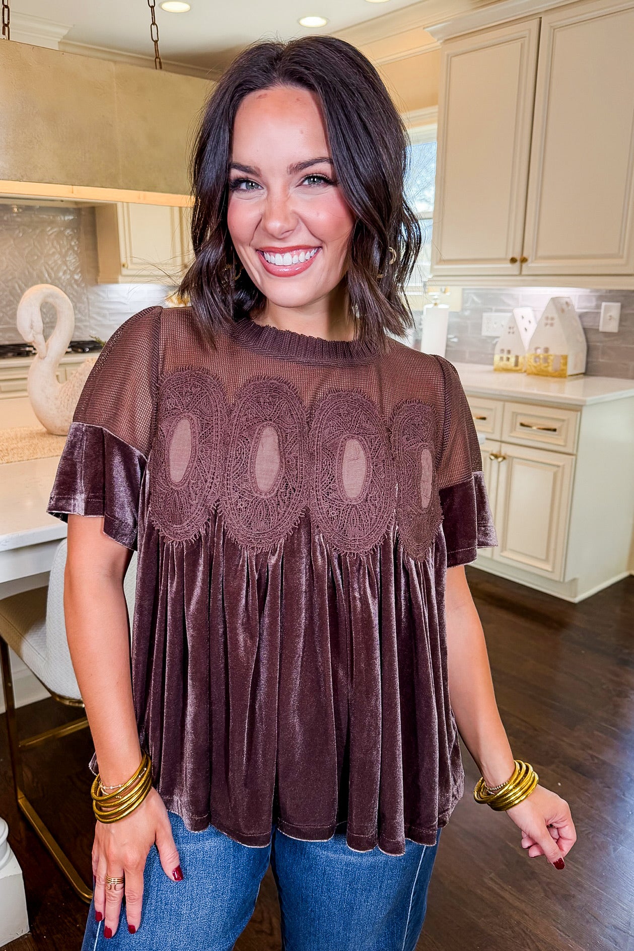 The Cocoa Lace Top blends texture and charm with its velvet bodice, lace appliqué detail, and airy mesh neckline. Effortlessly feminine yet totally unique, it’s the perfect piece to dress up denim or layer under a jacket for date night.