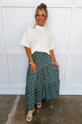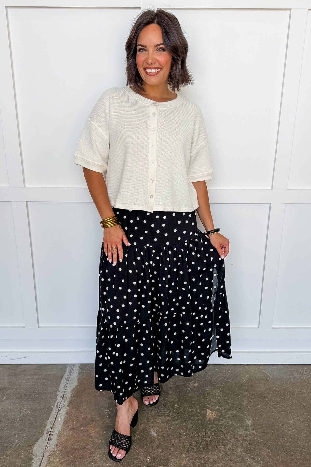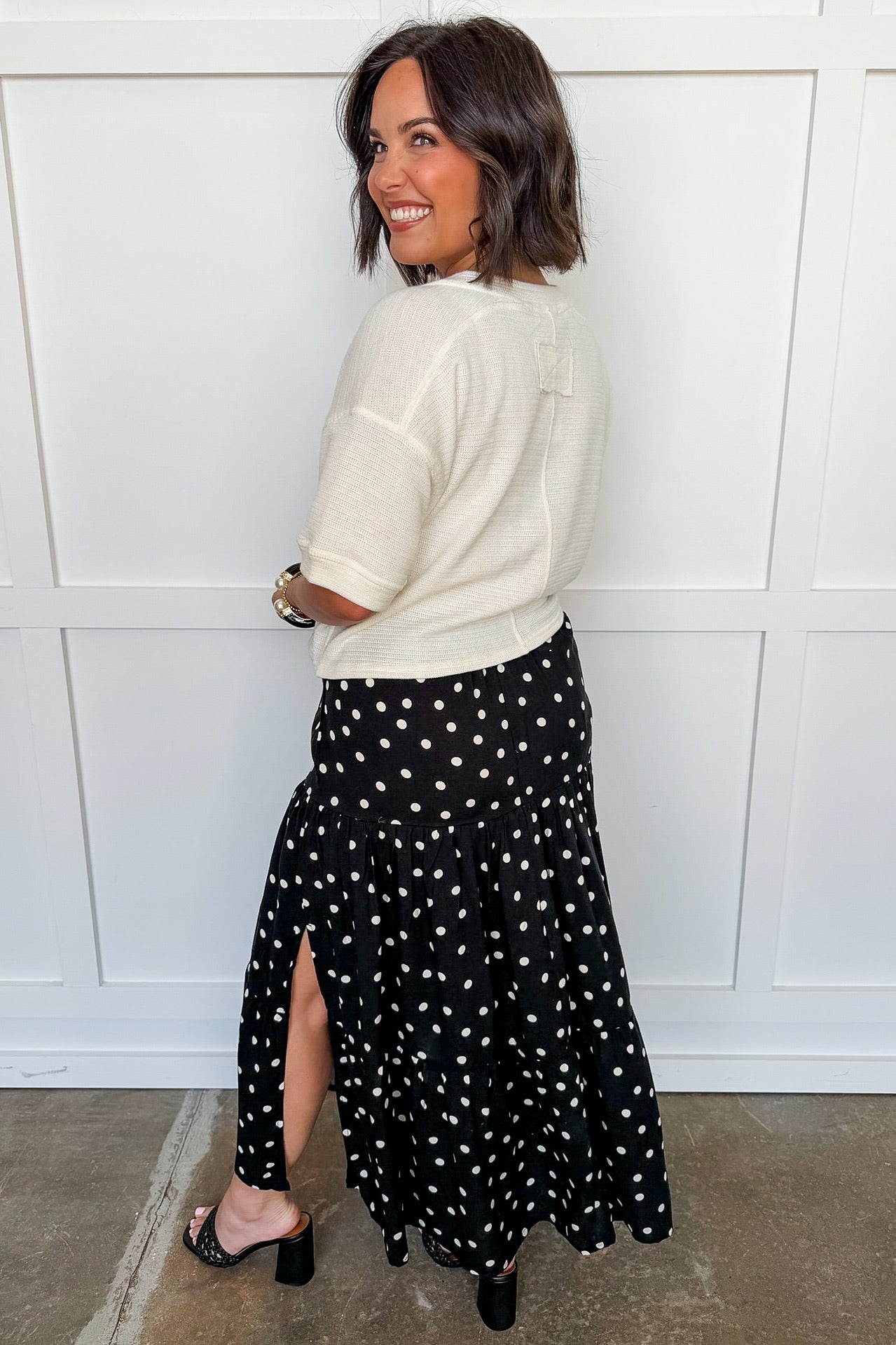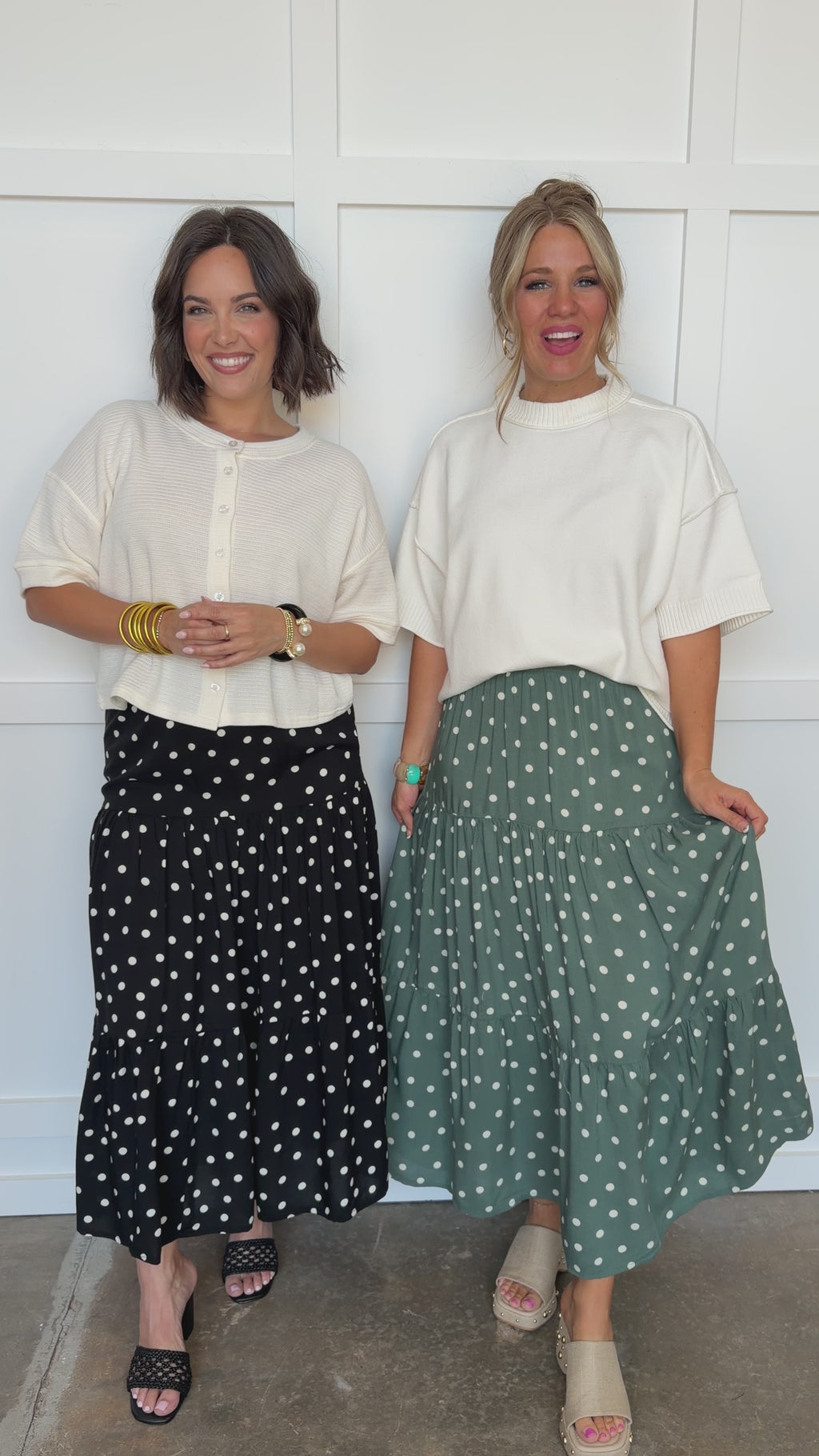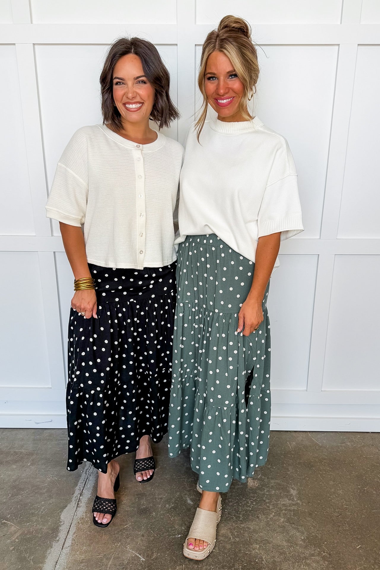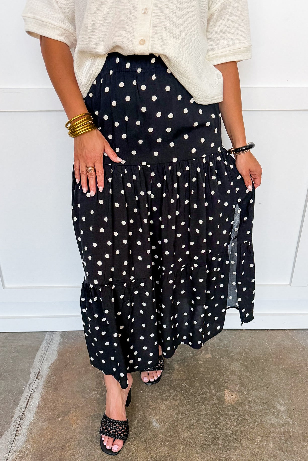 Effortlessly feminine with a touch of coastal charm -- This tiered midi skirt features a classic polka dot print and a flowy silhouette that moves beautifully with every step. Designed with a flattering high-rise fit and an easy side slit, it’s the perfect piece to dress up or keep casual all season long.