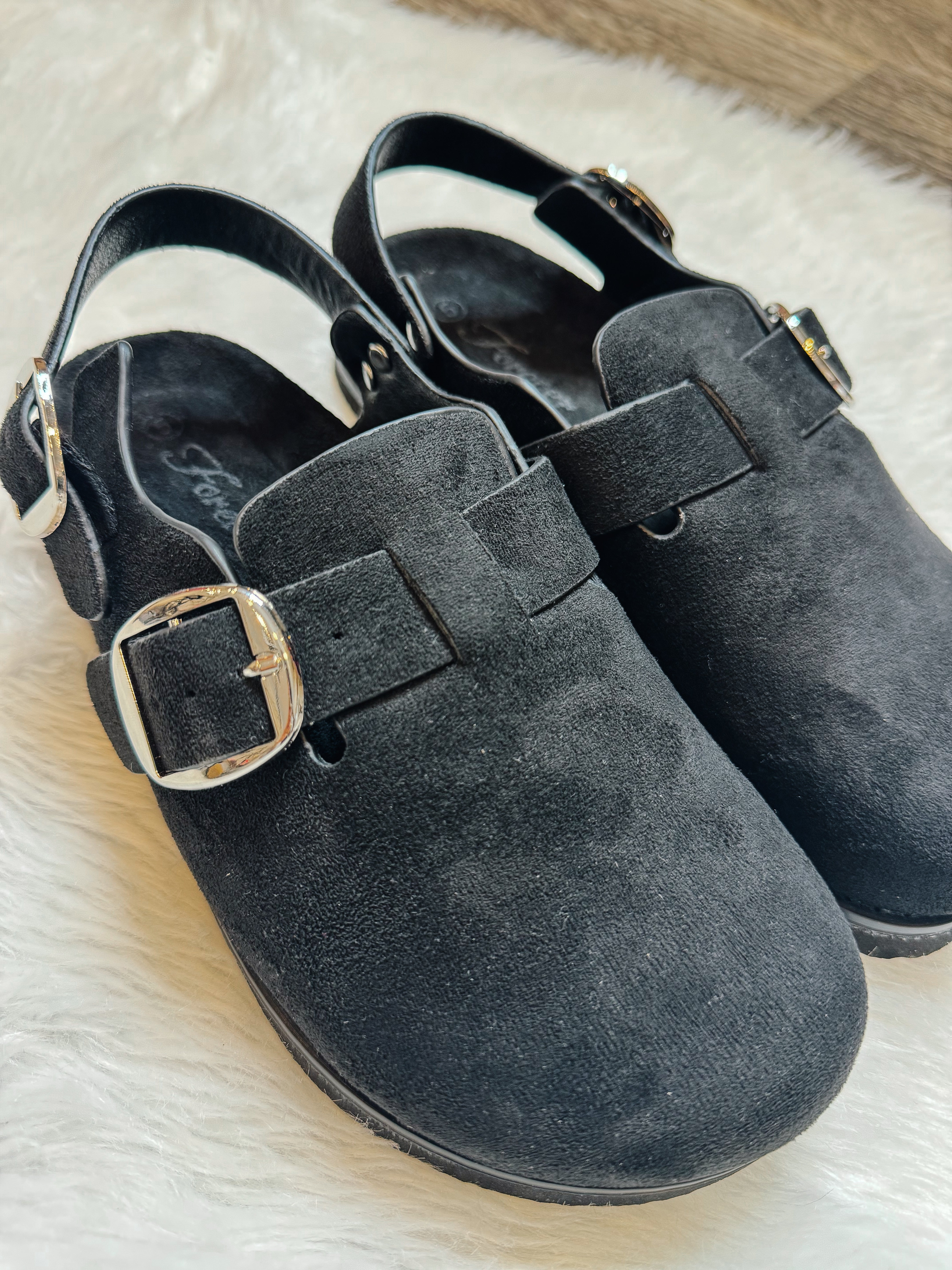 Slip into softness with our suede buckle clogs — the cozy, cushioned mule designed for slow mornings, brisk errands, and every comfortable moment in between. A plush footbed meets a velvety suede upper, secured with double-metal buckles that add a hint of polish. Lightweight, walkable, and irresistibly soft, this pair brings that “fall cabin comfort” feeling to your everyday routine.