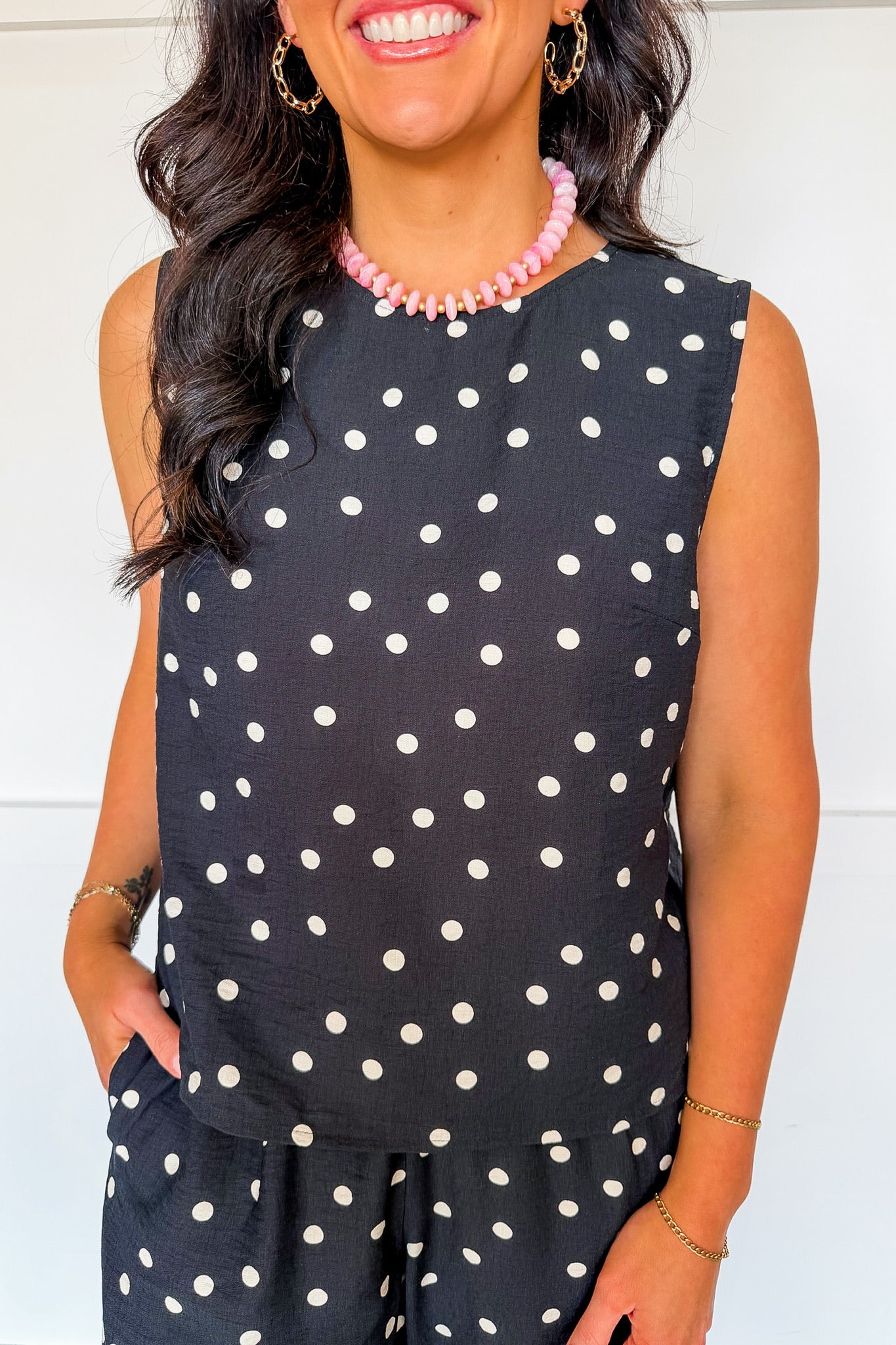 Chic, timeless, and effortlessly versatile — the Classic Dot Sleeveless Top is the perfect piece to elevate your everyday wardrobe. Featuring a classic polka dot print and an easy, relaxed silhouette, this sleeveless top is lightweight, breezy, and ideal for warm-weather styling. Its simple yet polished design makes it easy to dress up or down, whether you're pairing it with denim, skirts, or coordinating pieces. Designed as part of the Classic Dot collection, this top pairs perfectly with the Classic Dot Shorts and Classic Dot Pants, making it easy to mix and match for multiple stylish outfits.