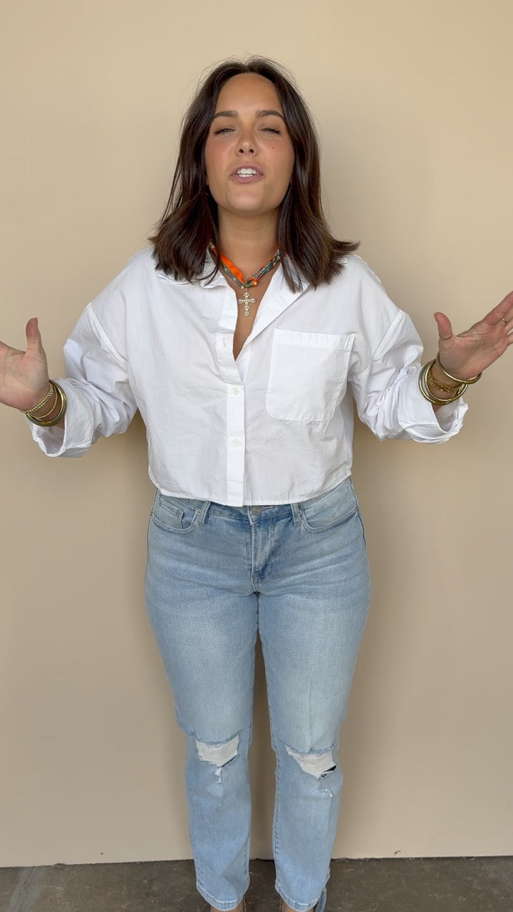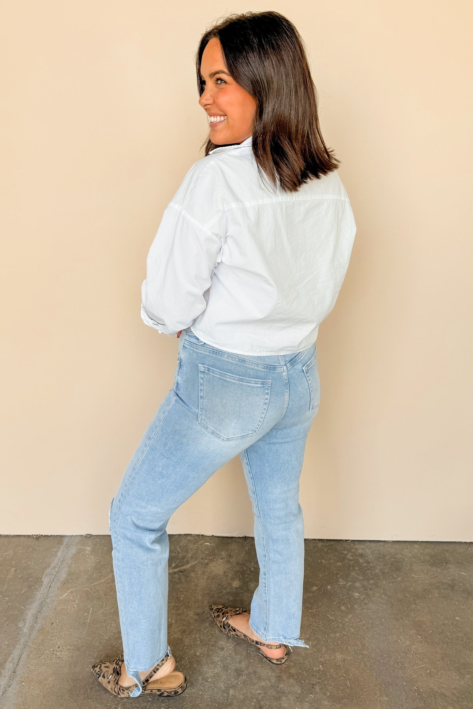 Introducing the Light Wash Distressed Mid Rise Destroyed Hem Straight Ankle Jean! Made with a light wash and stylish distressed details, these jeans are perfect for any casual or edgy look. The mid rise design and destroyed hem add a touch of comfort and style. Upgrade your wardrobe with these must-have jeans!