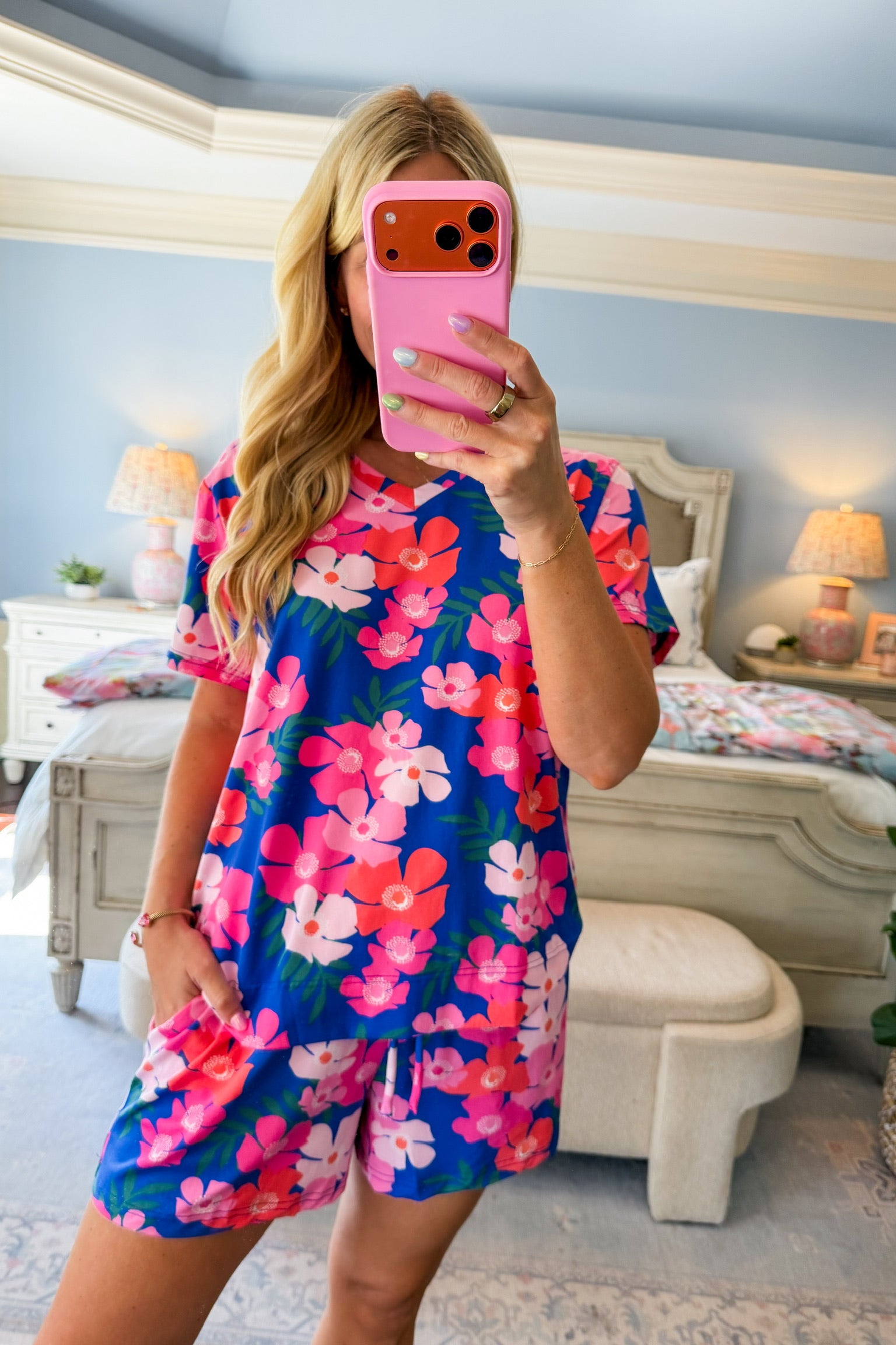 Drift off in style with The Allie Pajama Short Set by Mary Square. This playful floral set features a vibrant blue base with bold pink blooms, giving you that perfect mix of fun and feminine. Made from an ultra buttery soft fabric, it’s designed for all-day lounging and the sweetest night’s sleep. The relaxed fit, elastic waistband, and adjustable drawstring make it as comfortable as it is cute — you’ll never want to take it off!