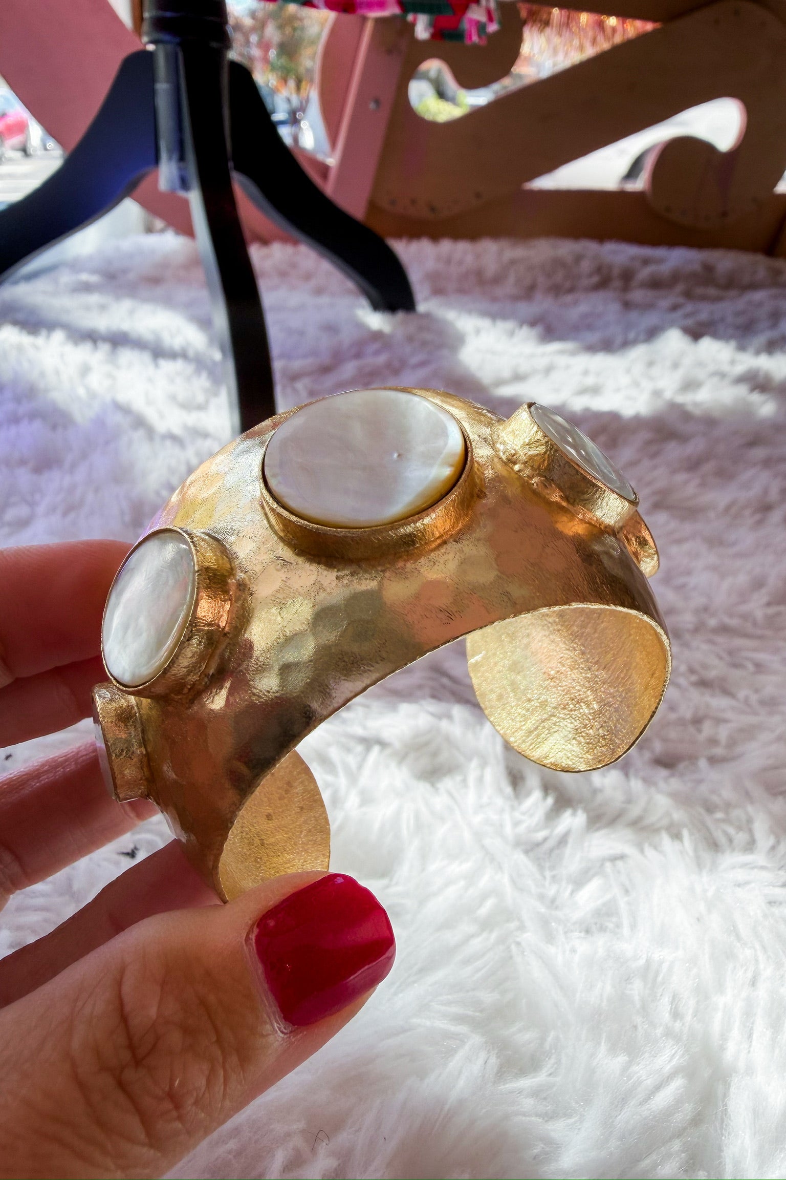 Make a statement with The Amalfi Cuff Bracelet — a bold hammered-gold design accented with luminous mother-of-pearl stones. Each piece catches the light beautifully, giving off an effortlessly chic, artisan-crafted feel. Perfect for elevating any look, from everyday basics to evening wear.