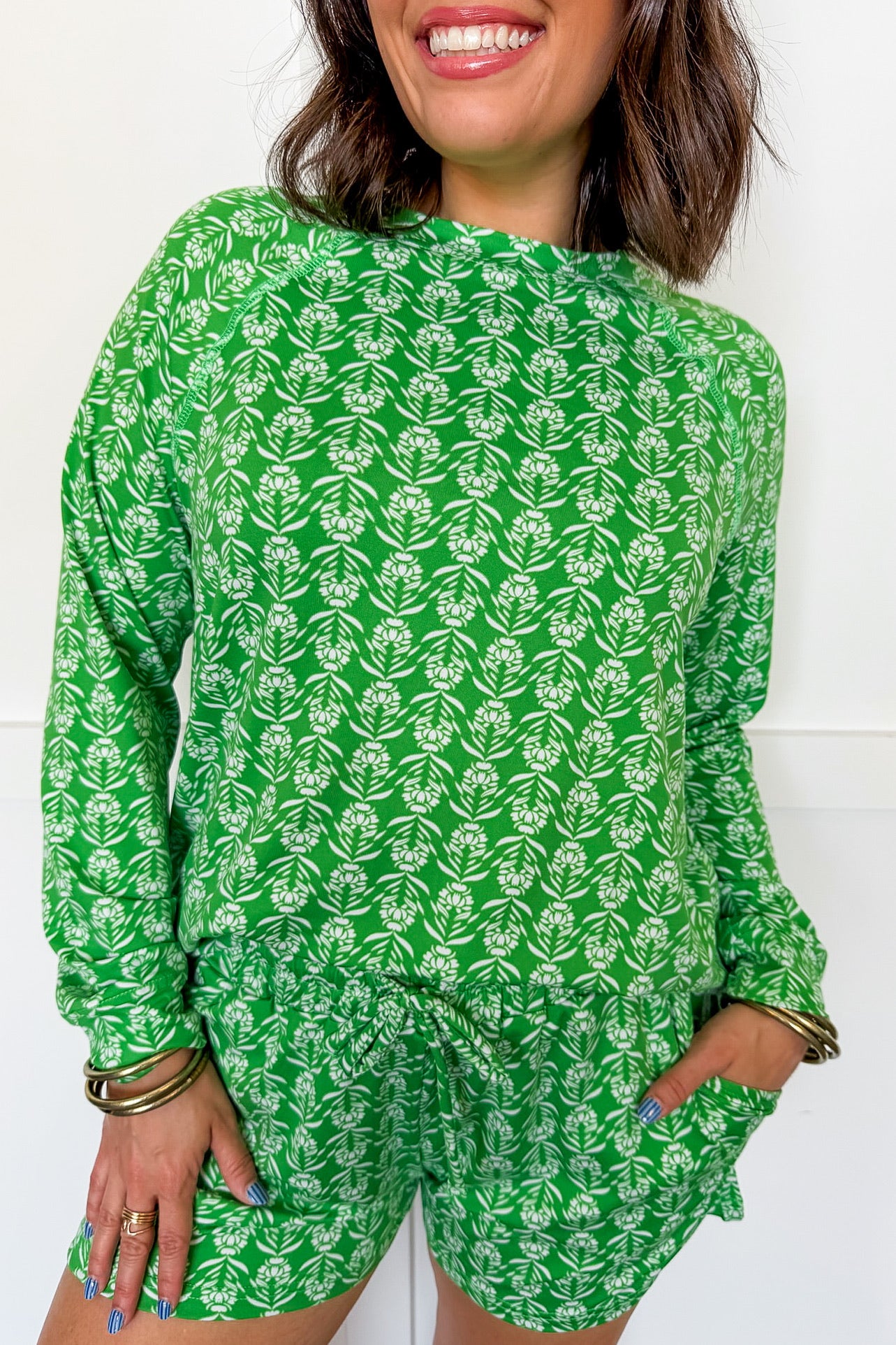 Get cozy with the Mary Square Annie Palm Damask Pajama Set in Green! This playful set features a buttery soft long sleeve top paired with comfy shorts that have drawstring bottoms and handy pockets. Perfect for lounging or a relaxed night’s sleep, it blends comfort and fun effortlessly.
