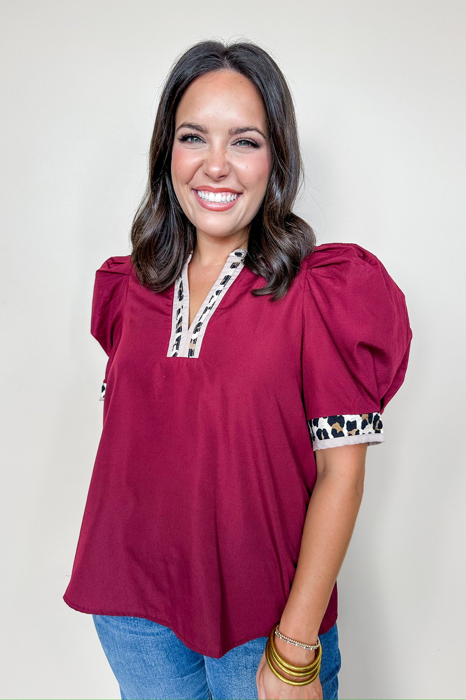 This playful burgundy V-neck top features charming puff sleeves and eye-catching cheetah print accents for a fun twist. Perfect for adding a dash of wild style to your wardrobe, it also comes in other colors to keep your looks fresh and flirty.