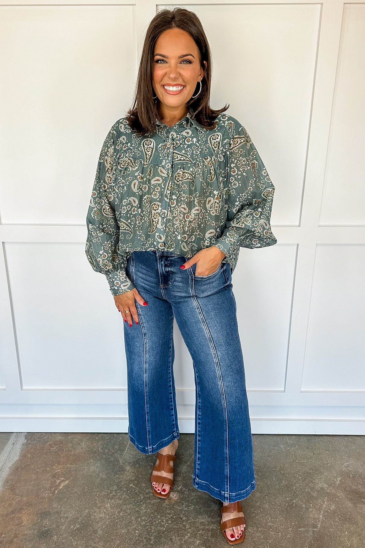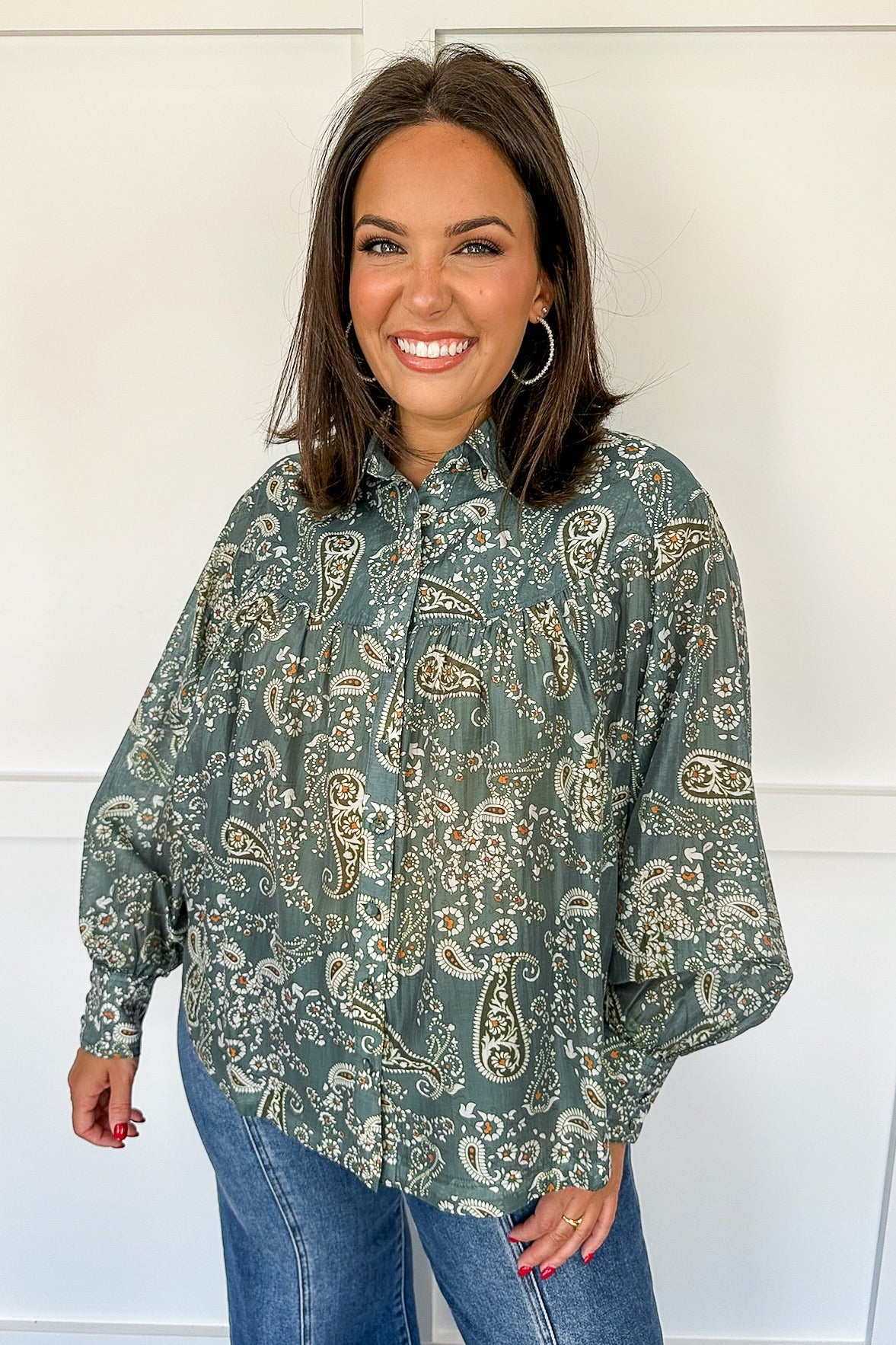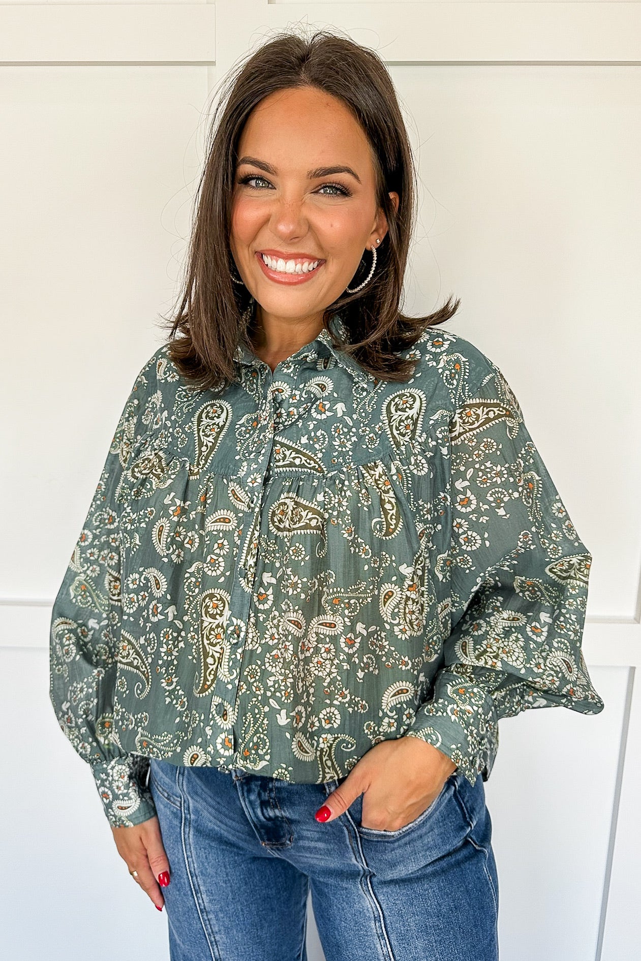 Add a splash of fun to your wardrobe with the Pretty in Paisley Teal Patterned Top. This collared blouse features a charming button-down front and a vibrant paisley print that’s sure to turn heads. Perfect for brightening up your day or dressing up your casual look with a playful twist.