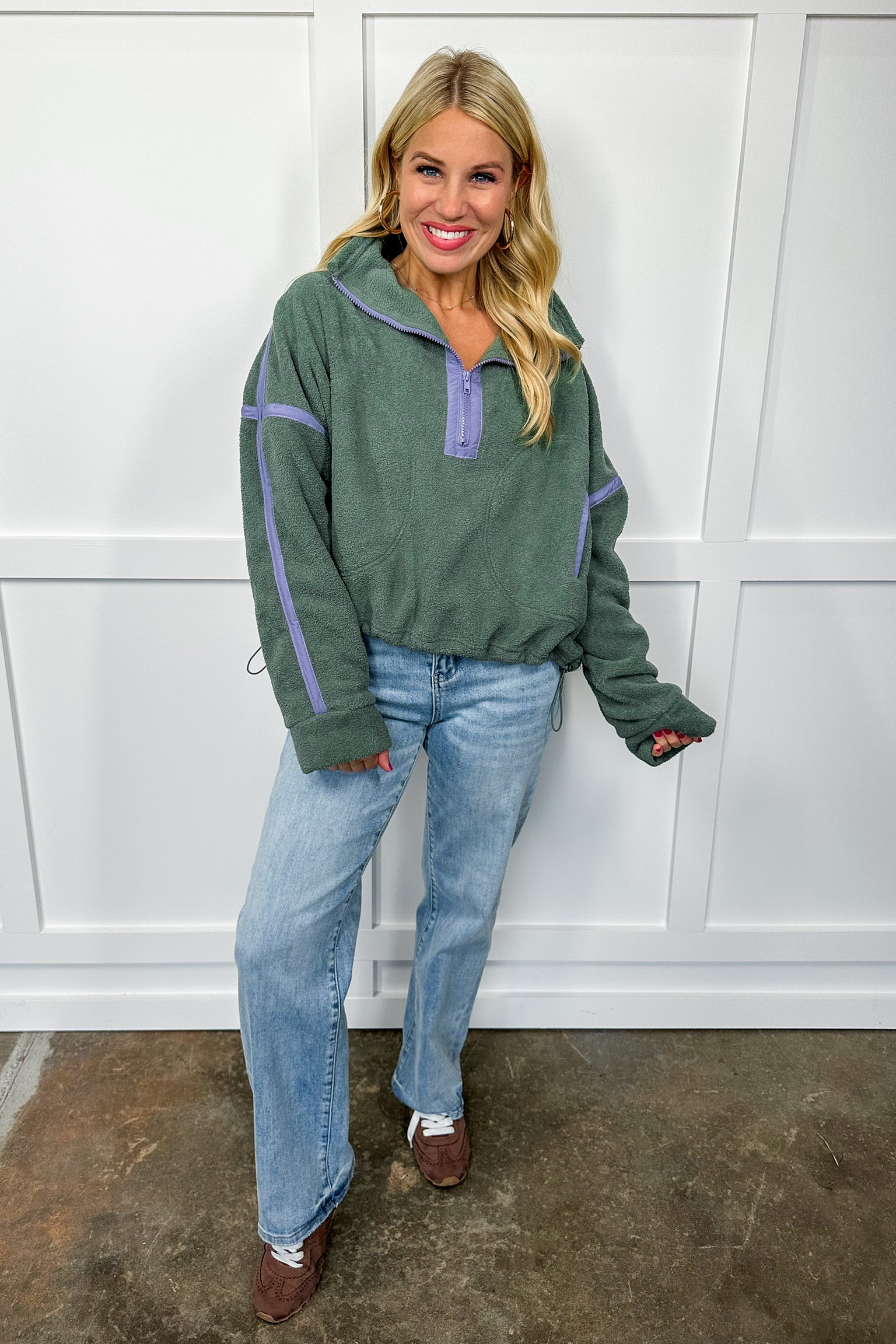 Cozy meets cute with this green sherpa quarter zip! The fuzzy sherpa fabric keeps you warm and snug, while the vibrant purple zipper adds a fun pop of color. With long sleeves and a waist-length fit, it’s perfect for layering or lounging in style. Get ready to snuggle up and stay playful this season!