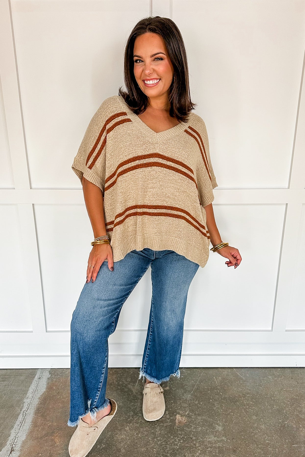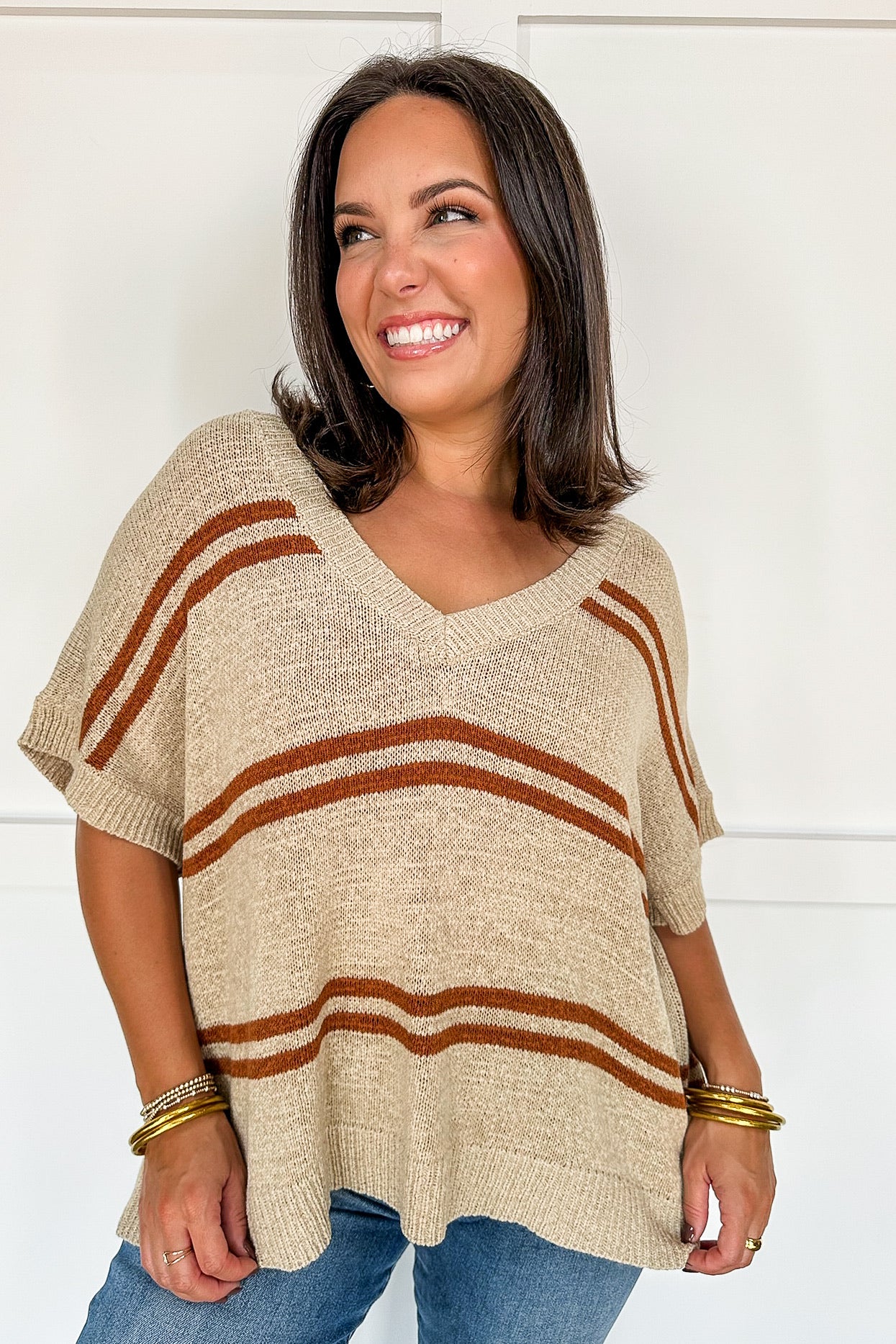 This playful striped knit top features a flattering V-neck and short sleeves, perfect for easy, breezy style. Its boxy, oversized fit offers comfortable movement and a relaxed vibe that’s ideal for casual days or layering fun. Add a splash of stripes to your wardrobe with this effortlessly chic piece.