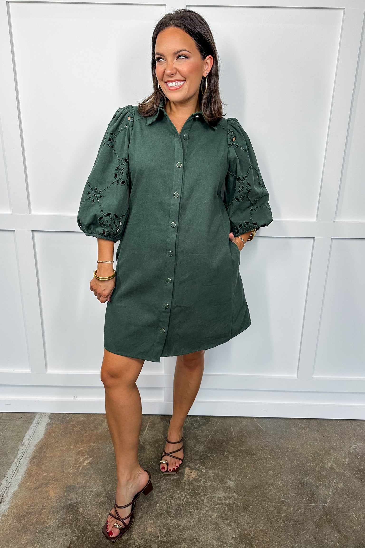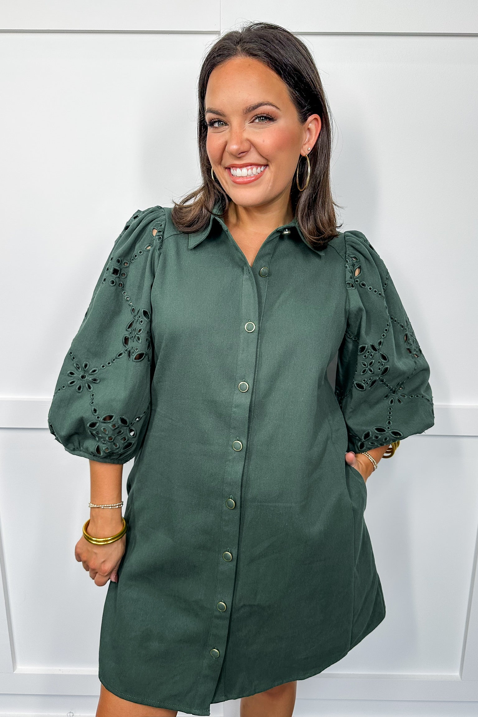This playful short dress in a charming pine shade features delicate lace details and puff sleeves that add a flirty touch. The button-down front and classic collar keep it fresh and fun, while the above-the-knee length makes it perfect for sunny days and spontaneous adventures.
