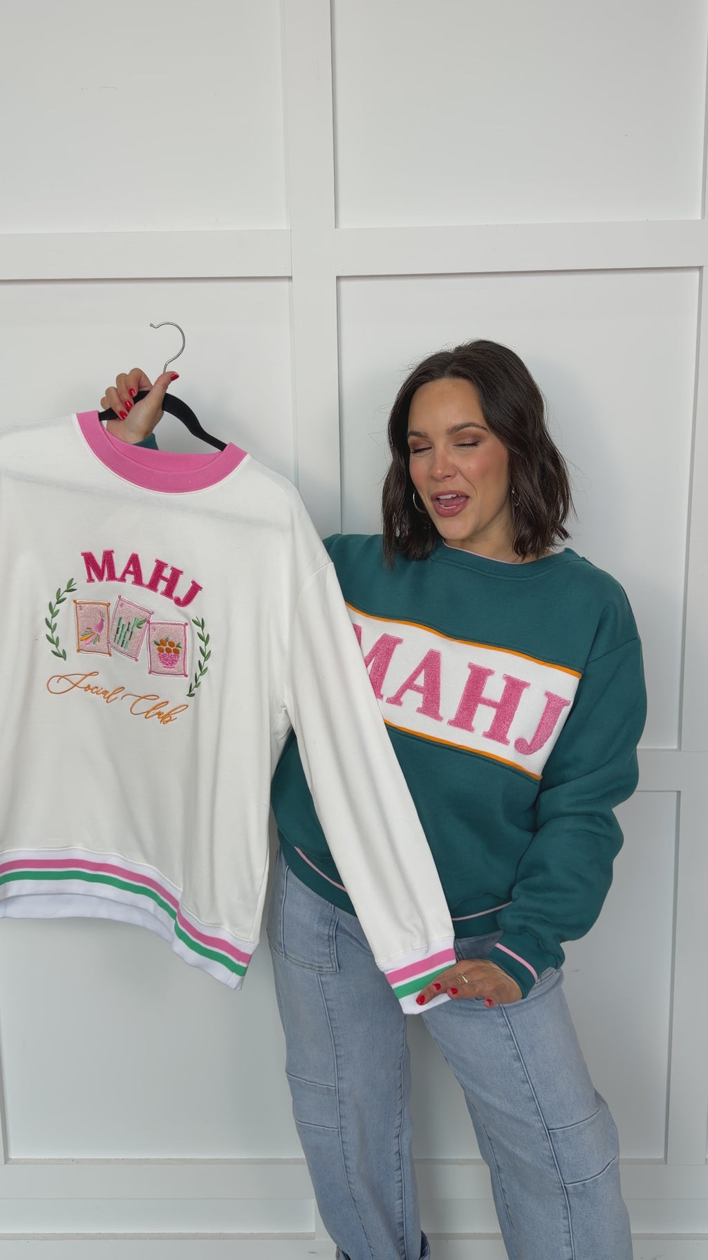 Show off your love for Mahjong in cozy, effortless style with the Mahjong Varsity Crewneck Pullover. Designed with a classic crew neckline and bold “MAHJ” lettering, this pullover is a fun nod to the game we all love. Soft, comfortable, and easy to style, it’s perfect for game nights, casual days, or lounging in between rounds.