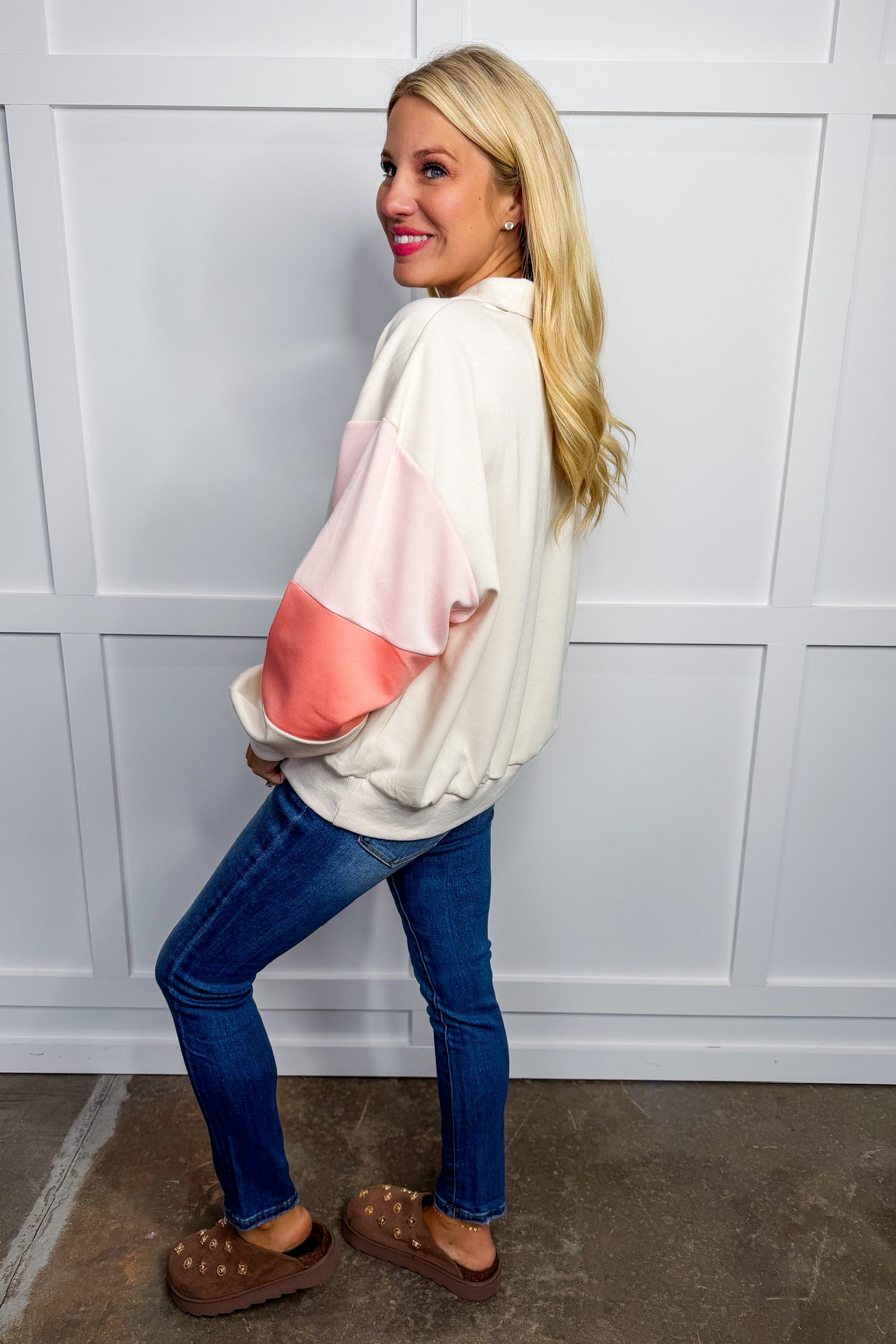 Your new everyday favorite! This cozy half-zip pullover blends laid back comfort with effortless chic. Designed in soft cream with blush and color color block. Striped front panel and relaxed fit give it a sporty, easygoing feel.