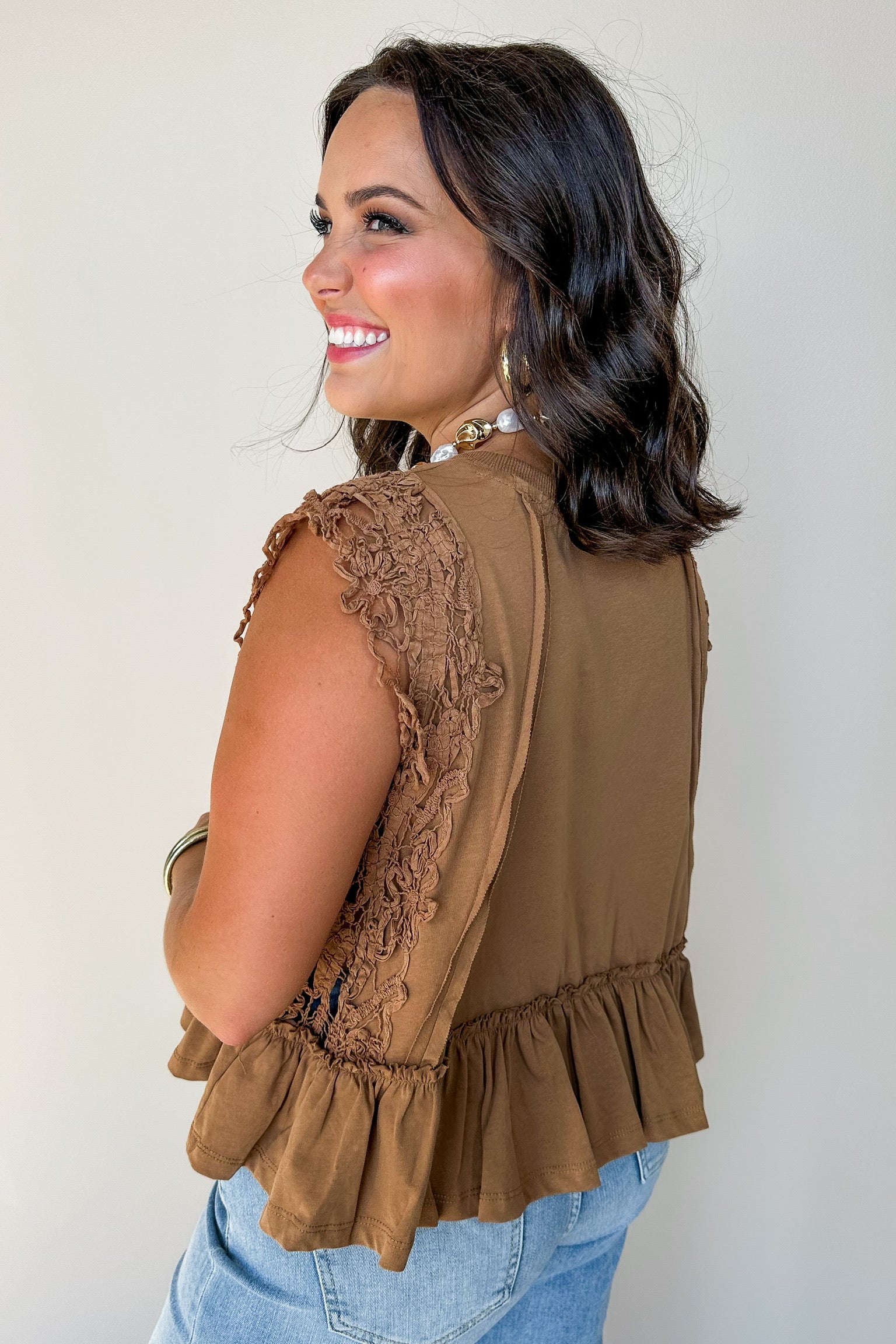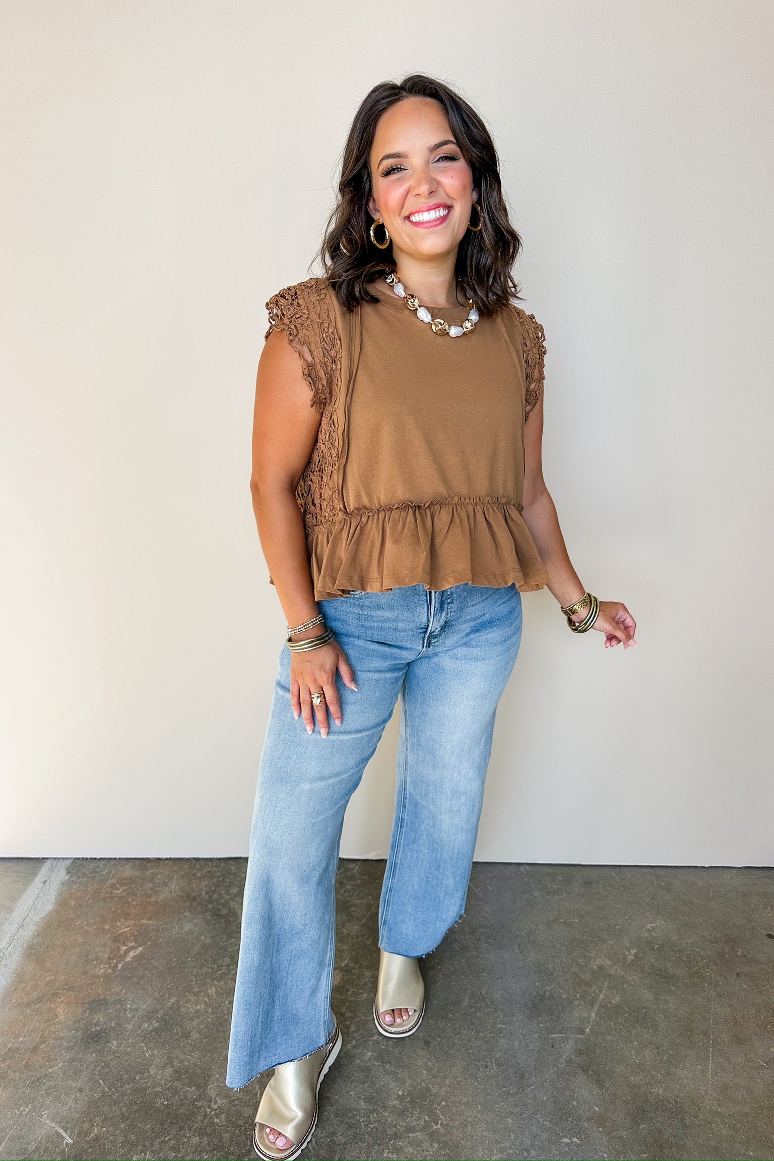 This playful Lacey Trim Top in Cinnamon features a flattering swing fit and charming flare silhouette. Delicate lace sleeves add a touch of feminine detail, making it perfect for casual days when you want to feel effortlessly cute and comfortable.